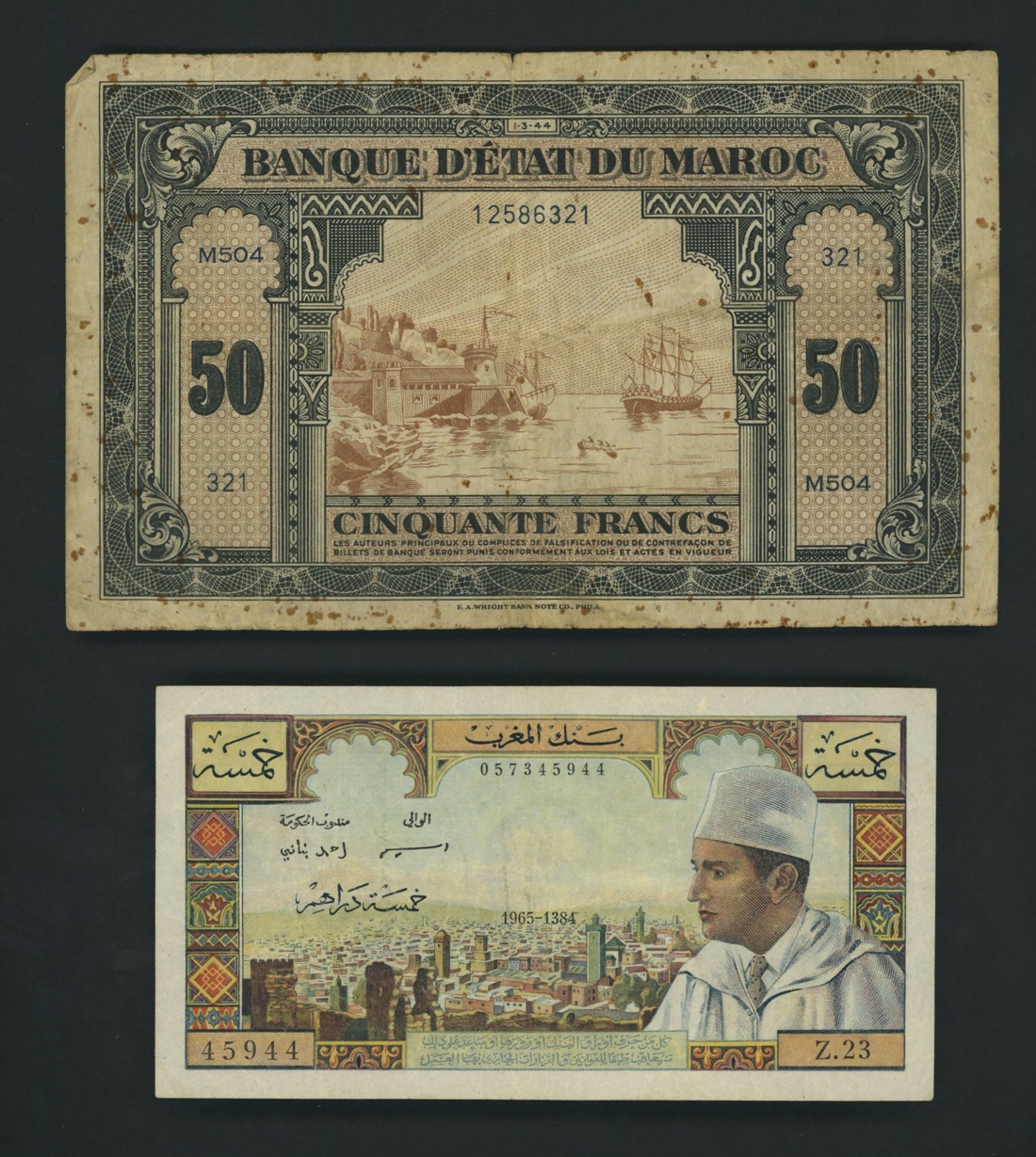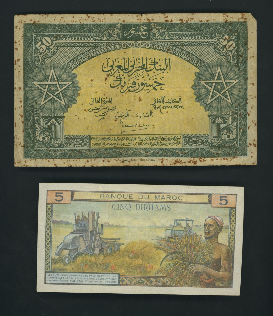 (x) Banque d'État du Maroc, Banque du Maroc, [2 notes] 50 Francs, 5 Dirhams, 1944-1965, 50 Francs, 1 March 1944, serial number M504 321; 5 Dirhams, 1965, serial number Z.23 45944