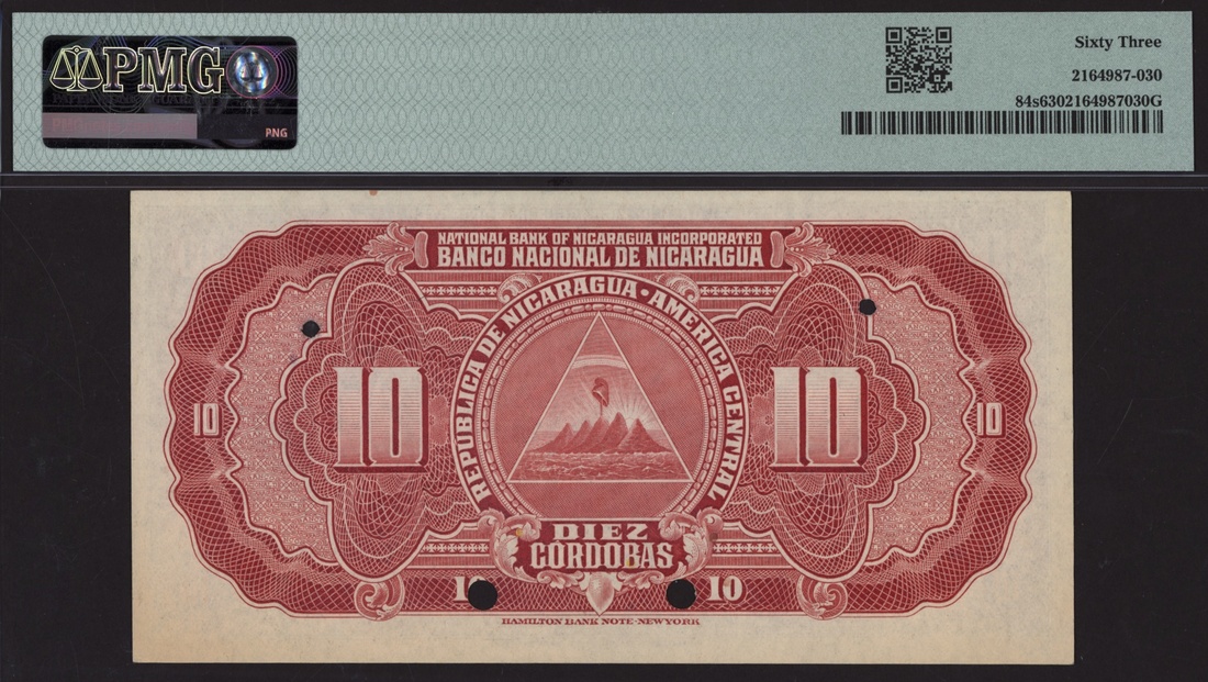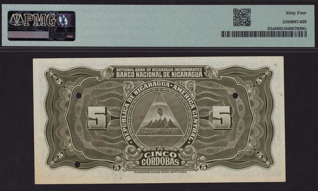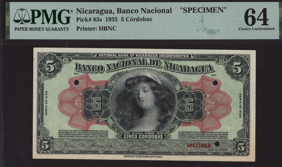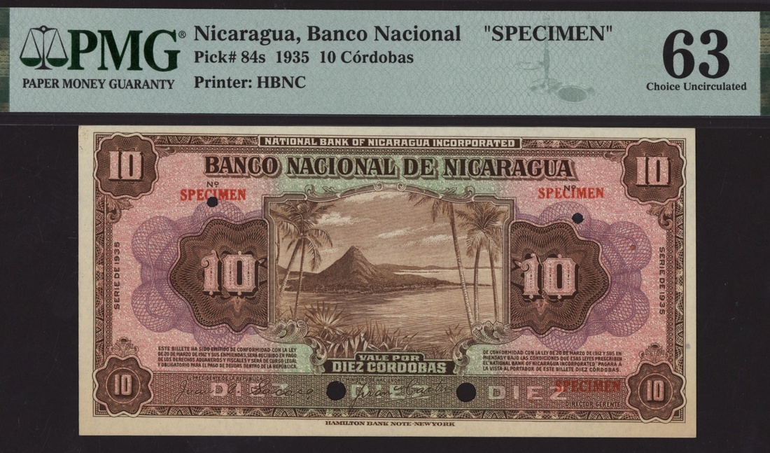 Banco Nacional de Nicaragua, pair of specimens, 5 and 10 Córdobas, 1935, (Pick 83s, 84s), in PMG holder 64 Choice Uncirculated (1), 63 Choice Uncirculated (1), (2 notes)