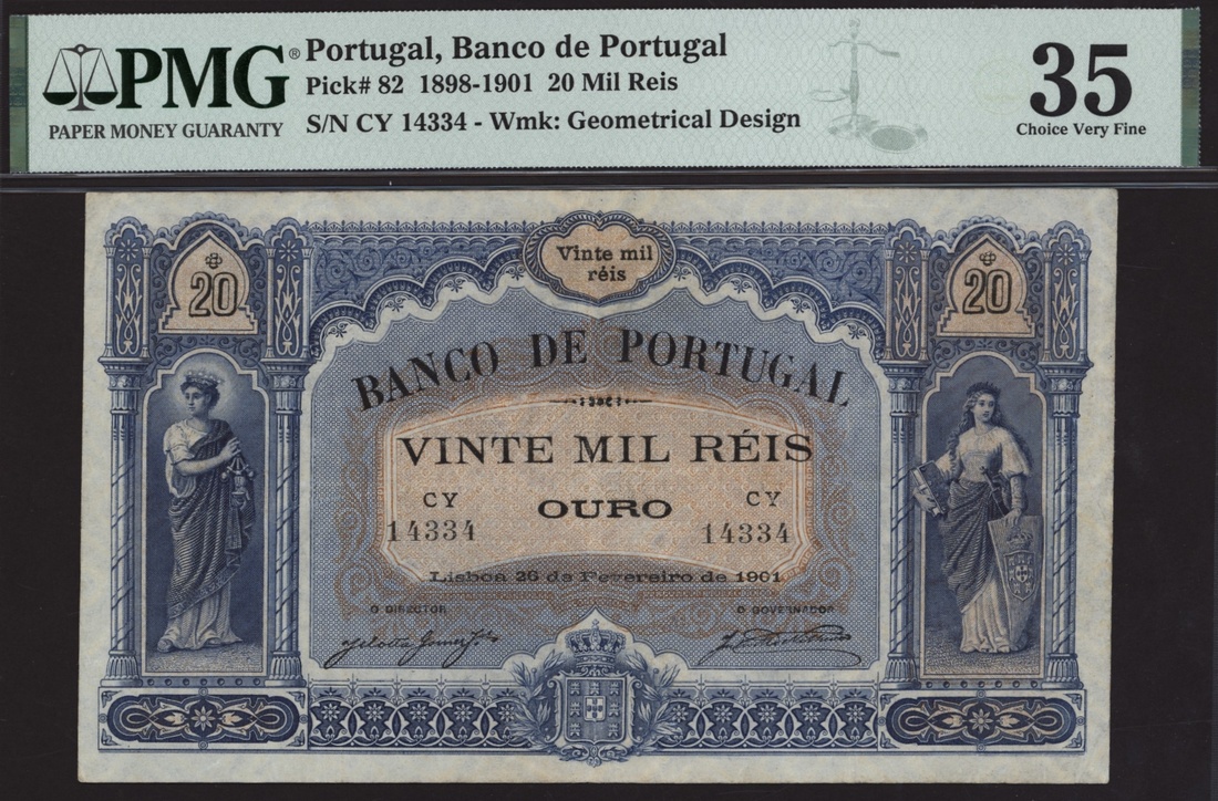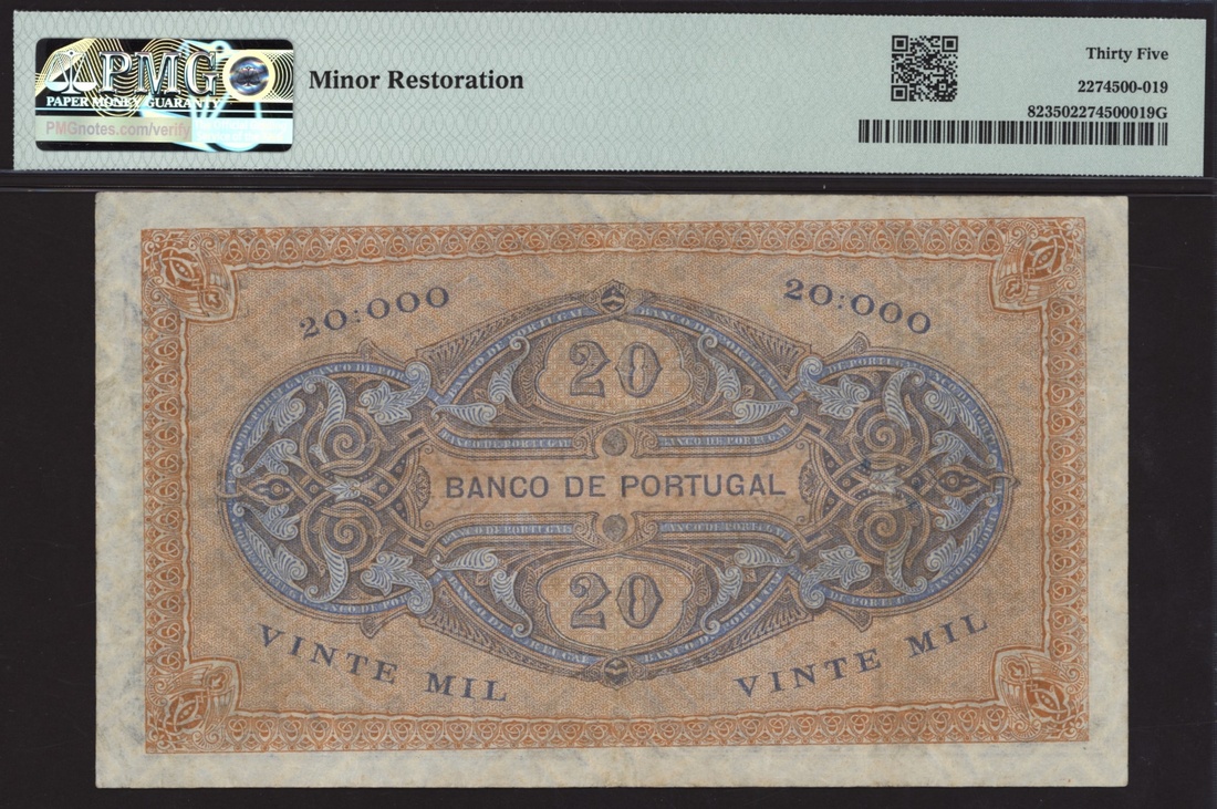 (x) Banco de Portugal, 20 Mil Reis, 1898-1901, serial number CY 14334, (Pick 82), in PMG holder 35 Very Fine, minor restoration, only 1 note in higher grade at PMG