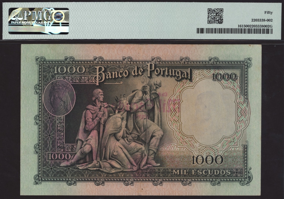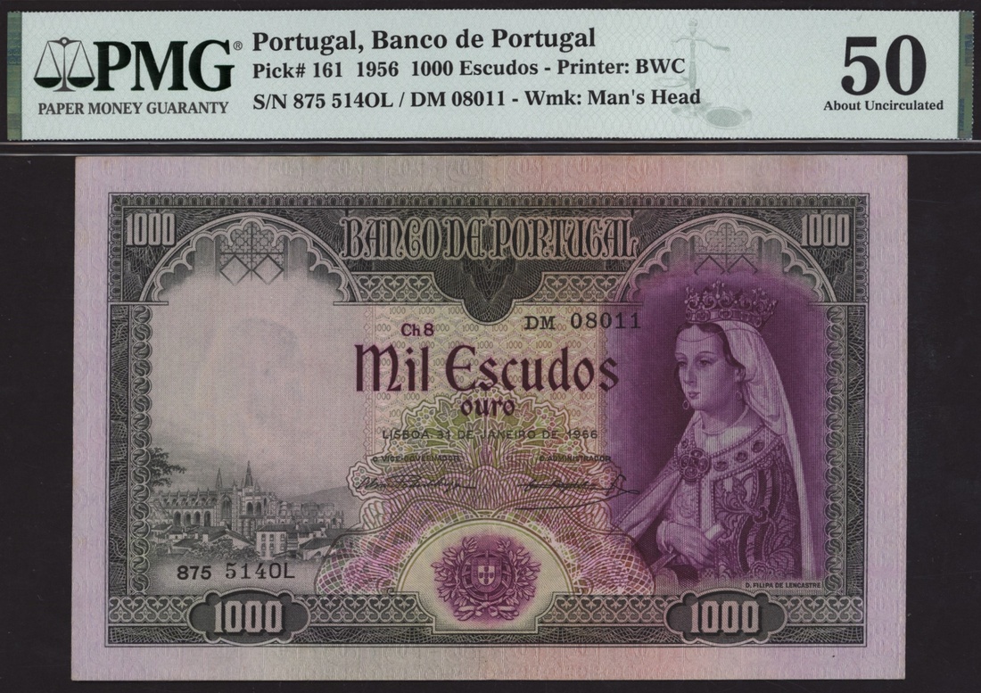 (x) Banco de Portugal, 1000 Escudos, Ch. 8, 31st January 1956, serial number 875 514OL / DM 08011, (Pick 161), in PMG holder 50 About Uncirculated