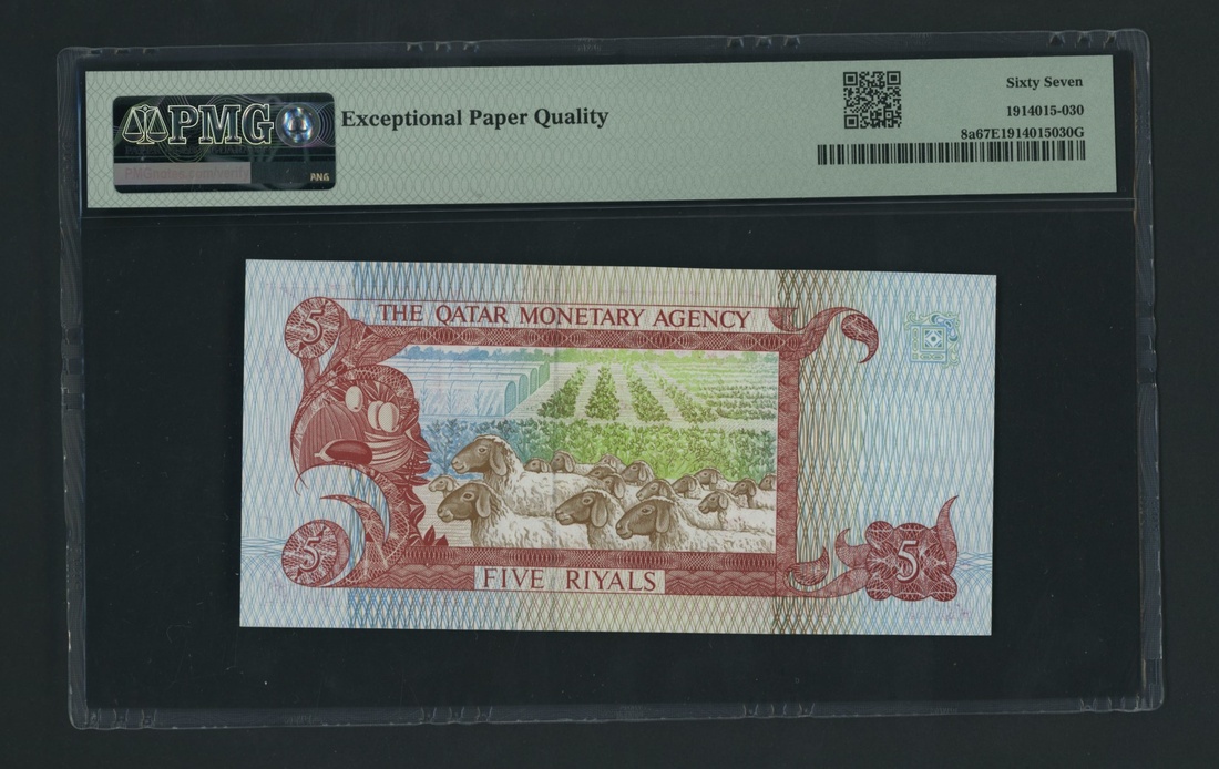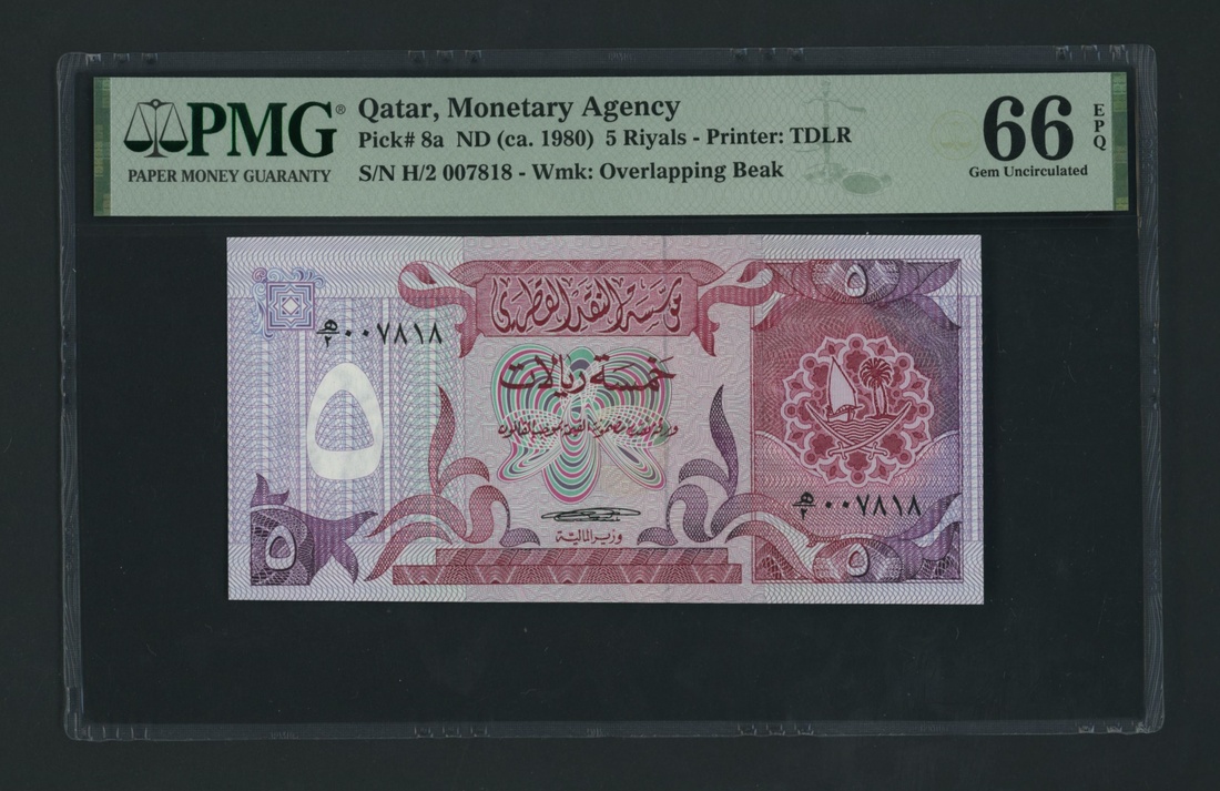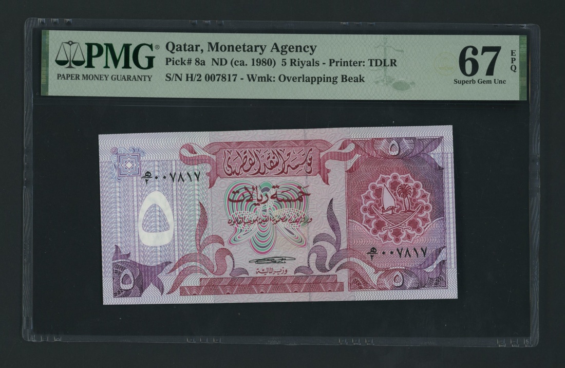 (x) Qatar Monetary Agency, [2 notes] 5 Riyals, ND (1980), consecutive serial numbers H/2 007817-8, (Pick 8a, BNB 108a), in PMG holder 66 EPQ Gem Uncirculated and 67 EPQ Superb Gem Uncirculated (2 notes)