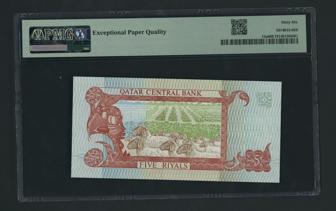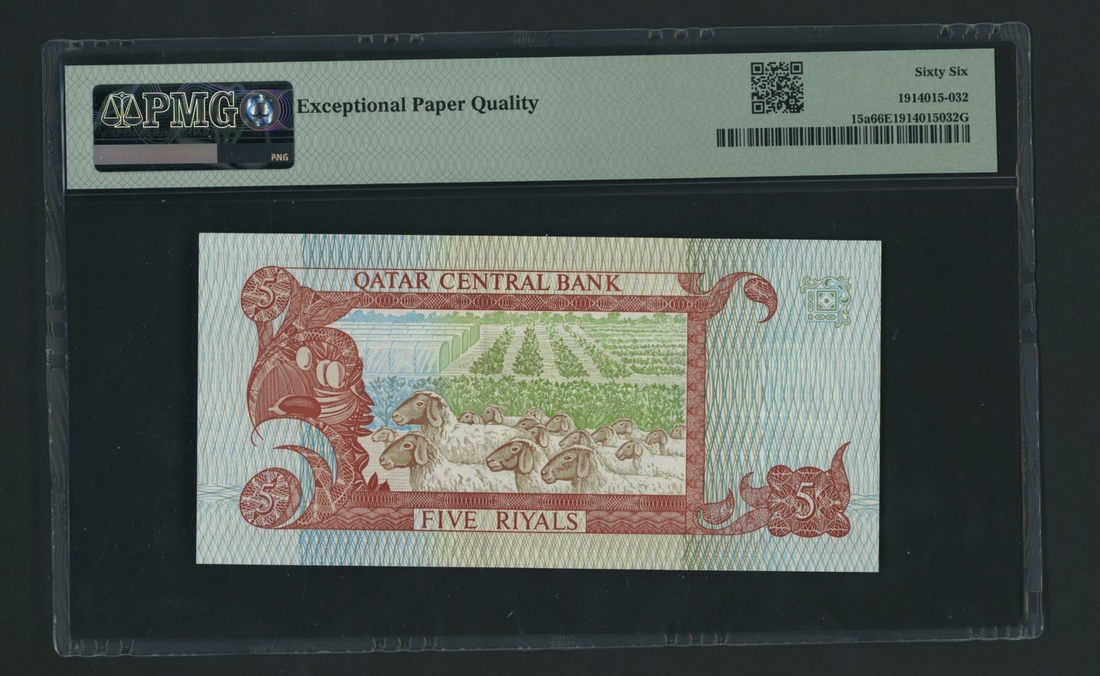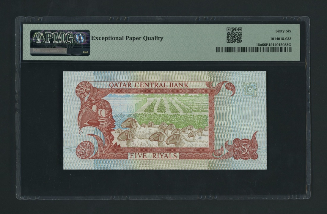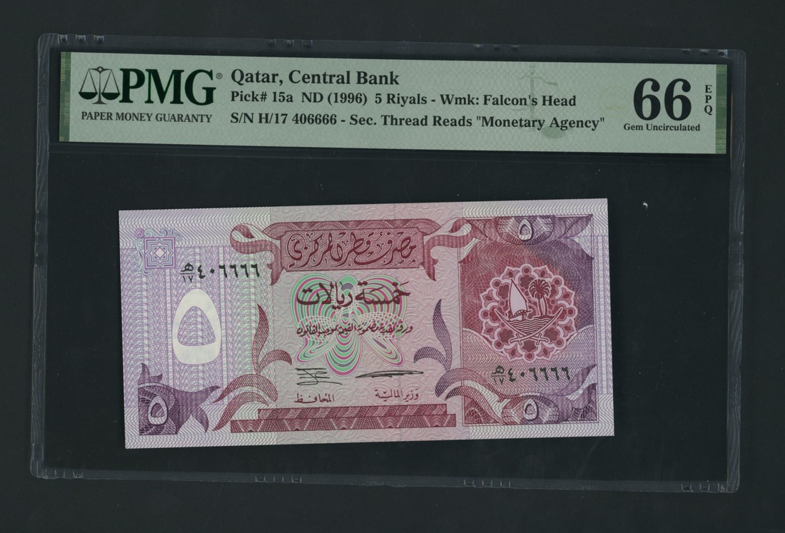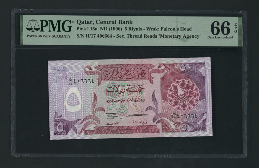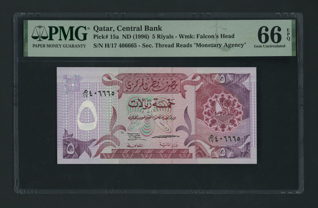 (x) Qatar Central Bank, [3 notes] 5 Riyals, ND (1996), consecutive serial numbers H/17 406664-6, (Pick 15a, BNB 202a), all in PMG holder 66 EPQ Gem Uncirculated (3 notes)
