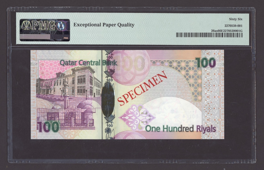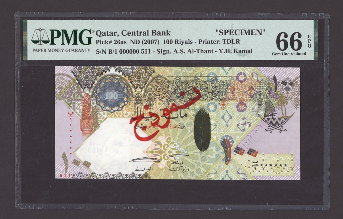 Qatar Central Bank, specimen 100 Riyals, ND (2007), serial number A/1 000000 511, (Pick 26as, BNB 213s), in PMG holder 66 EPQ Gem Uncirculated, only 1 note graded higher at PMG, scarce and appealing