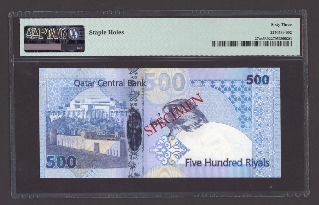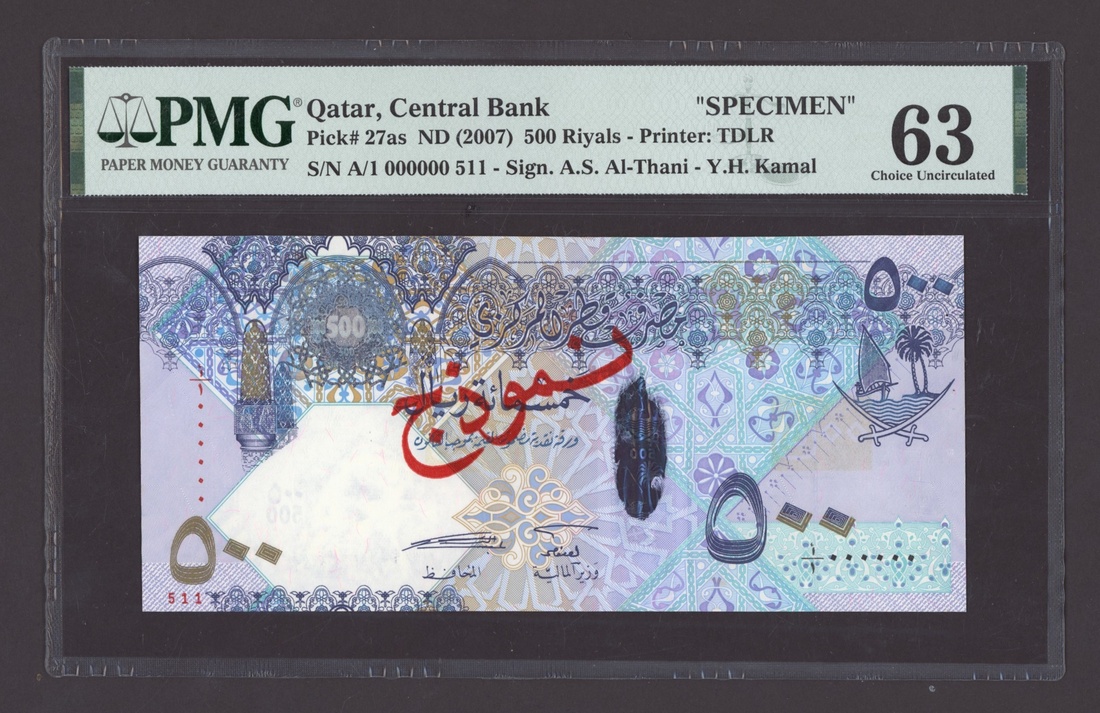 Qatar Central Bank, specimen 500 Riyals, ND (2007), serial number A/1 000000 511, (Pick 27as, BNB 214s), in PMG holder 63 Choice Uncirculated, staple holes, only 1 note graded higher at PMG, scarce and appealing