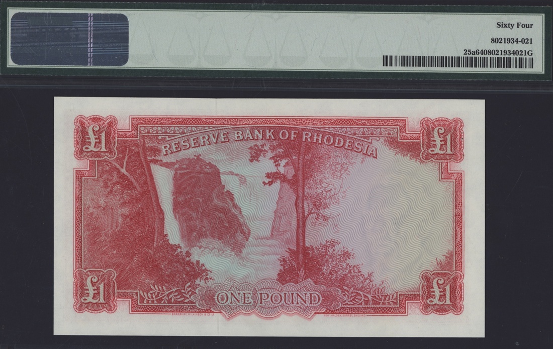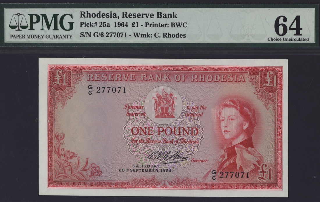 (x) Reserve Bank of Rhodesia, £1, 28th September 1964, serial number G/6 277071, (Pick 25a), in PMG holder 64 Choice Uncirculated