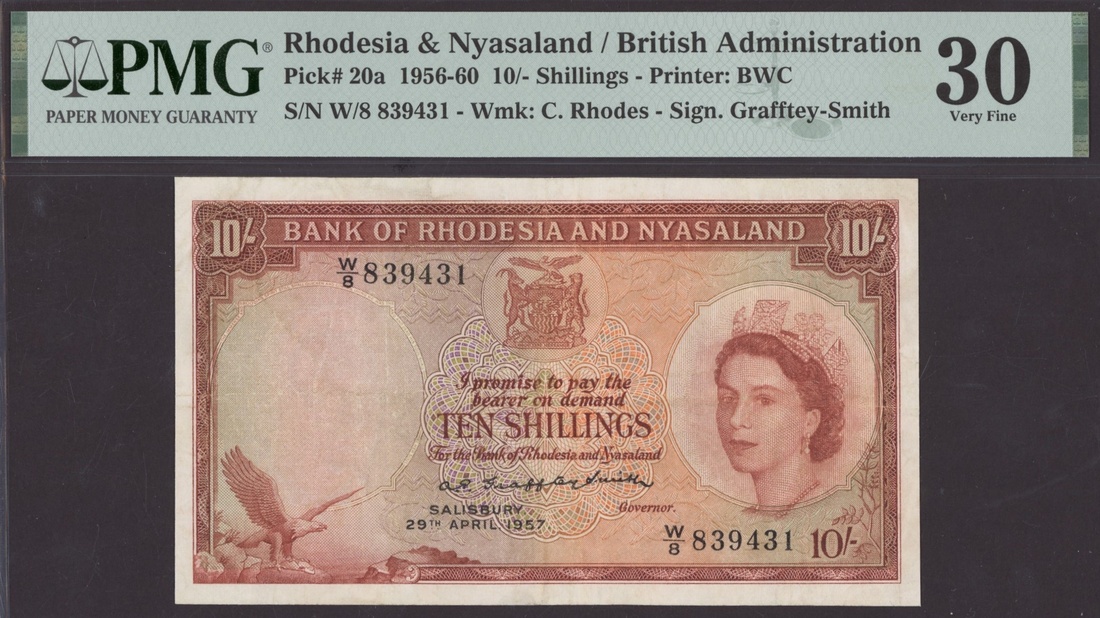 (x) Rhodesia & Nyasaland, British Administration, 10 Shillings, 29th April 1957, serial number W/8 839431, (Pick 20a, BNB 101), in PMG holder 30 Very Fine