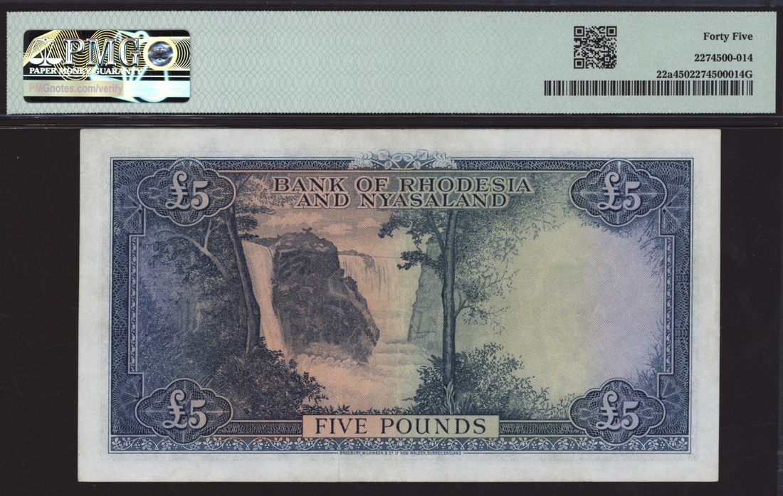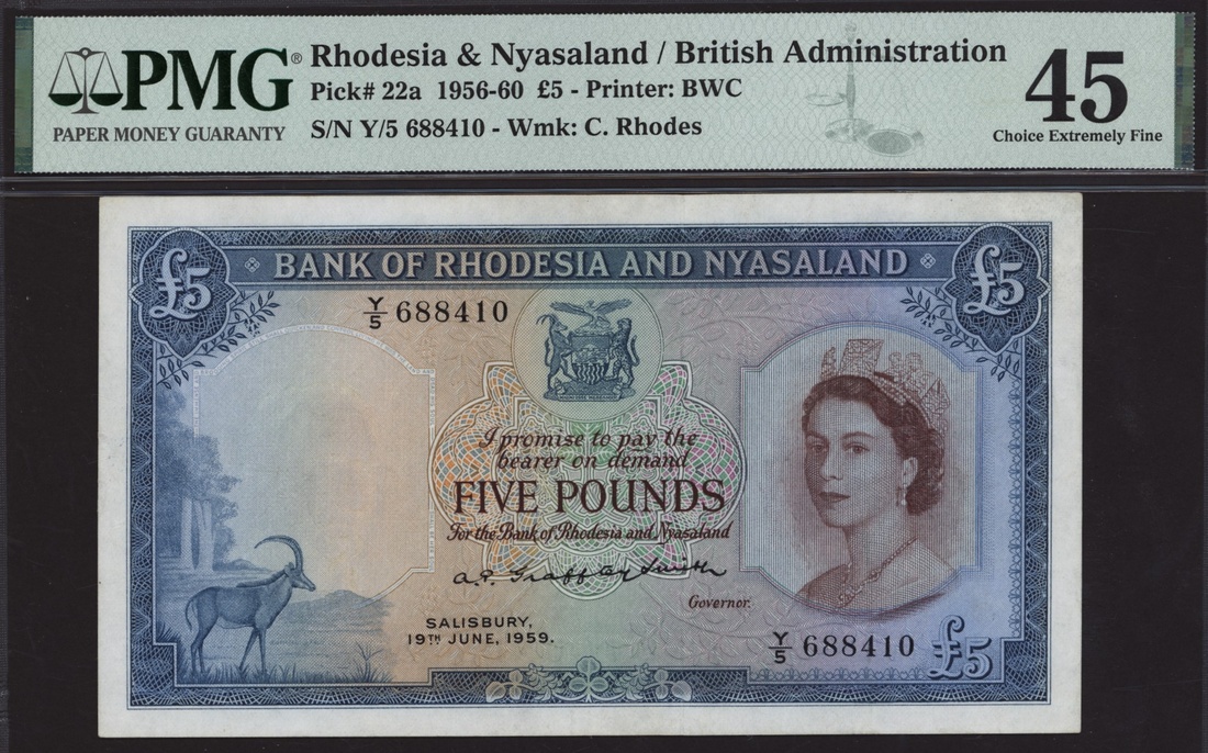 (x) Bank of Rhodesia and Nyasaland, £5, 19th June 1959, serial number Y/5 688410, (Pick 22a, BNB 103), in PMG holder 45 Choice Extremely Fine, only 3 notes in higher grades at PMG
