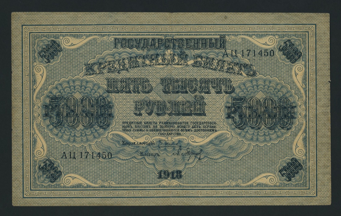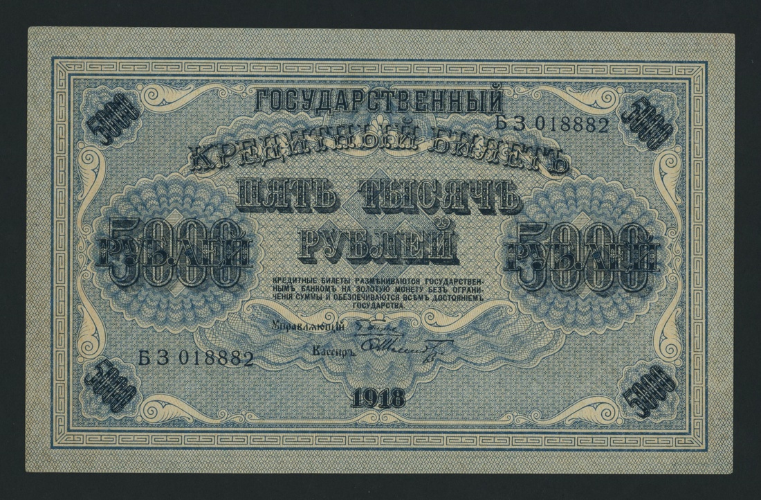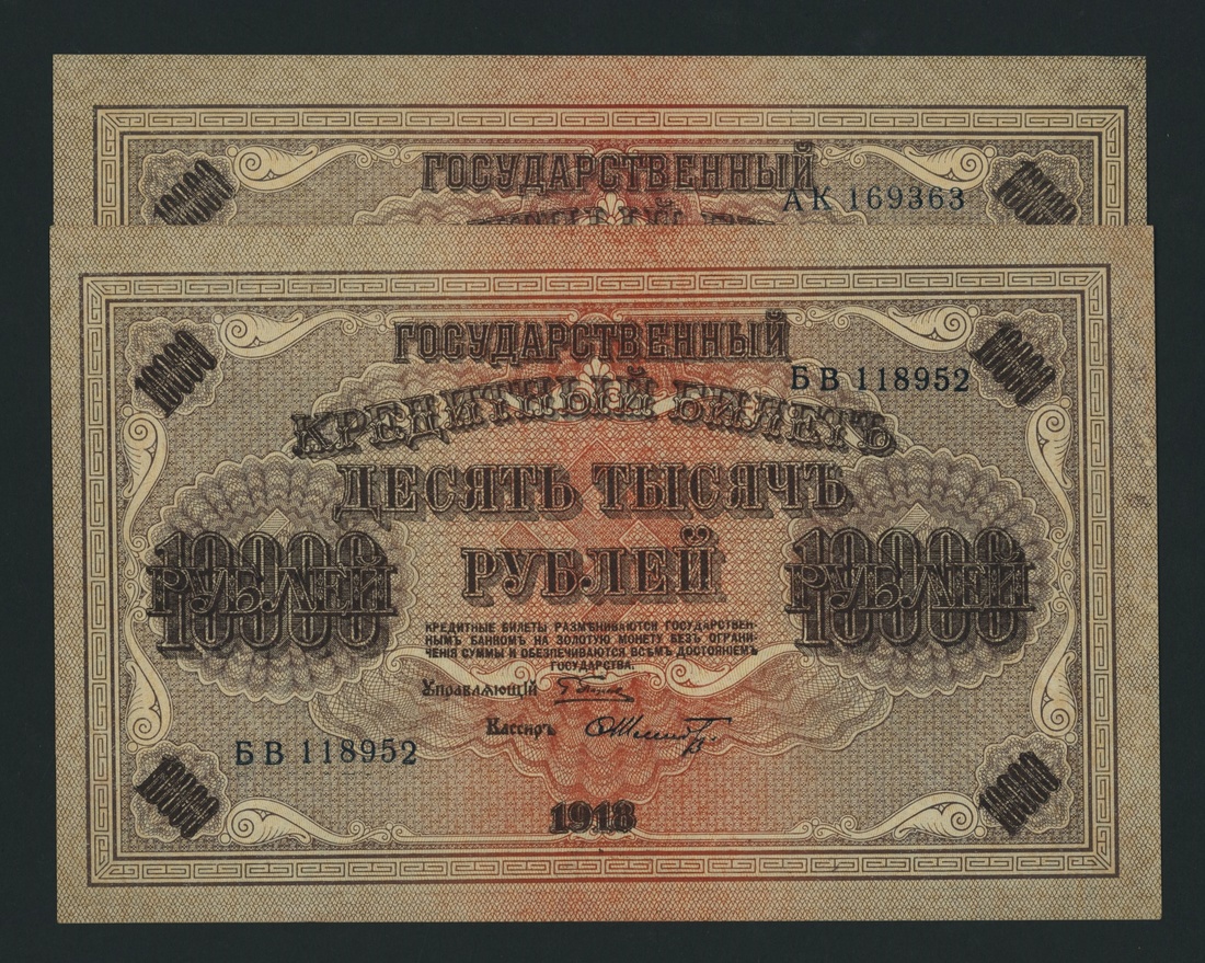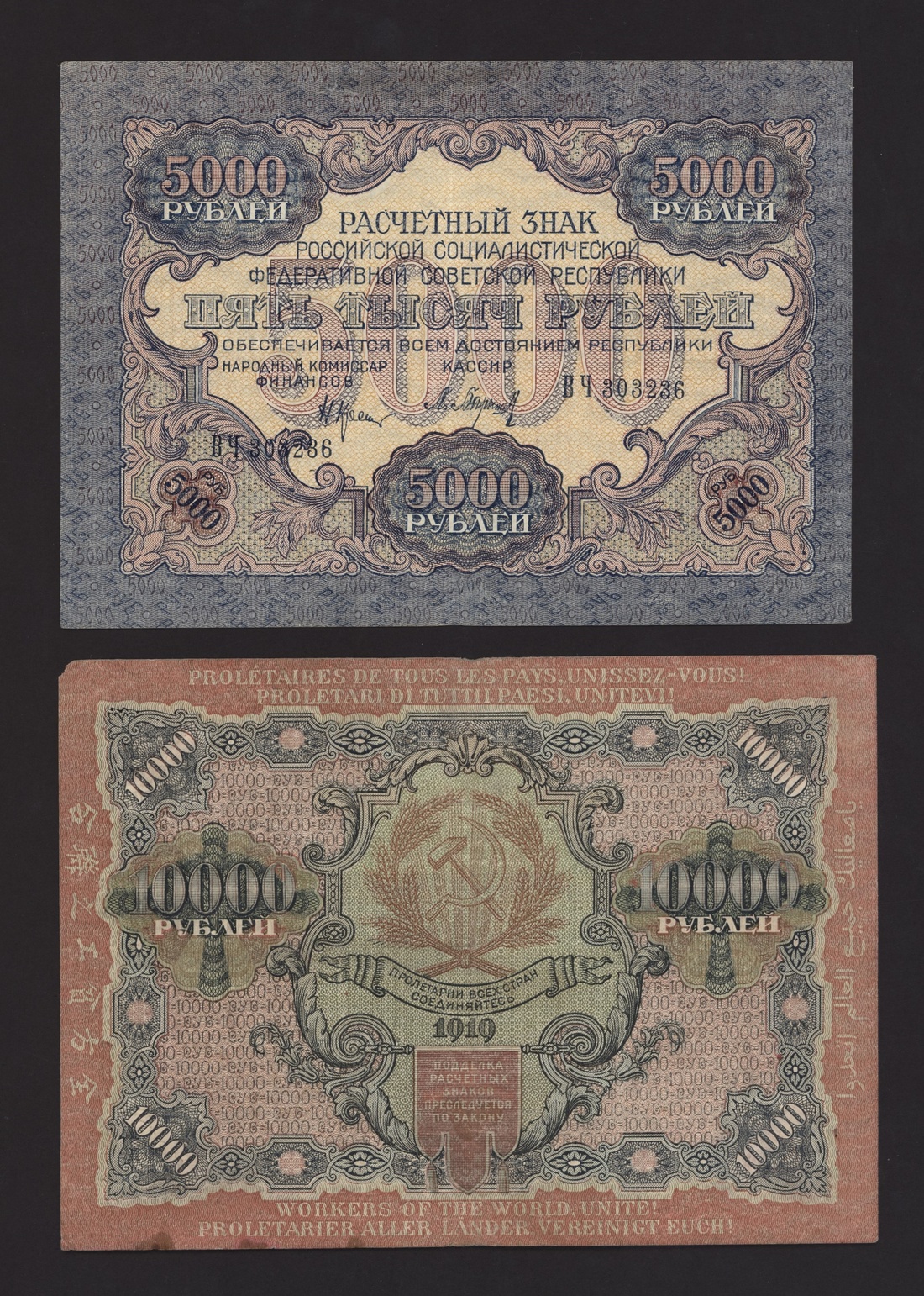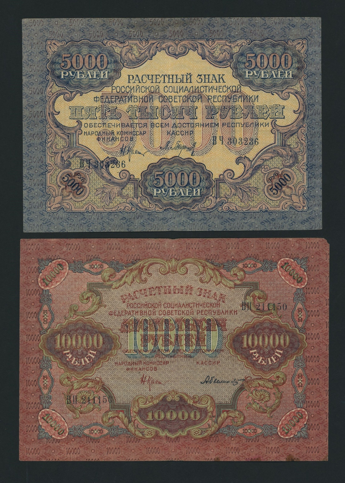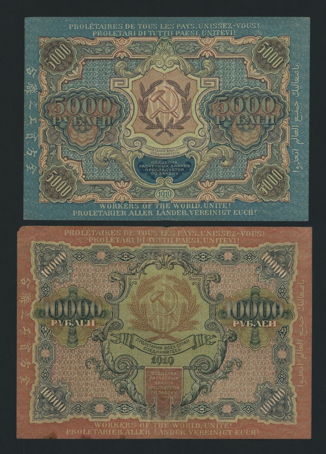 Soviet State Credit and Provisional State Notes, [6 notes] 1000, 5000, 10000 Rubles, 1919, serial numbers: ATS 171450 (P96); BZ 018882 (P96); BV 118952 (P97); AK 169363 (P97); VCH 303236 (P105); VP 211150 (P106)