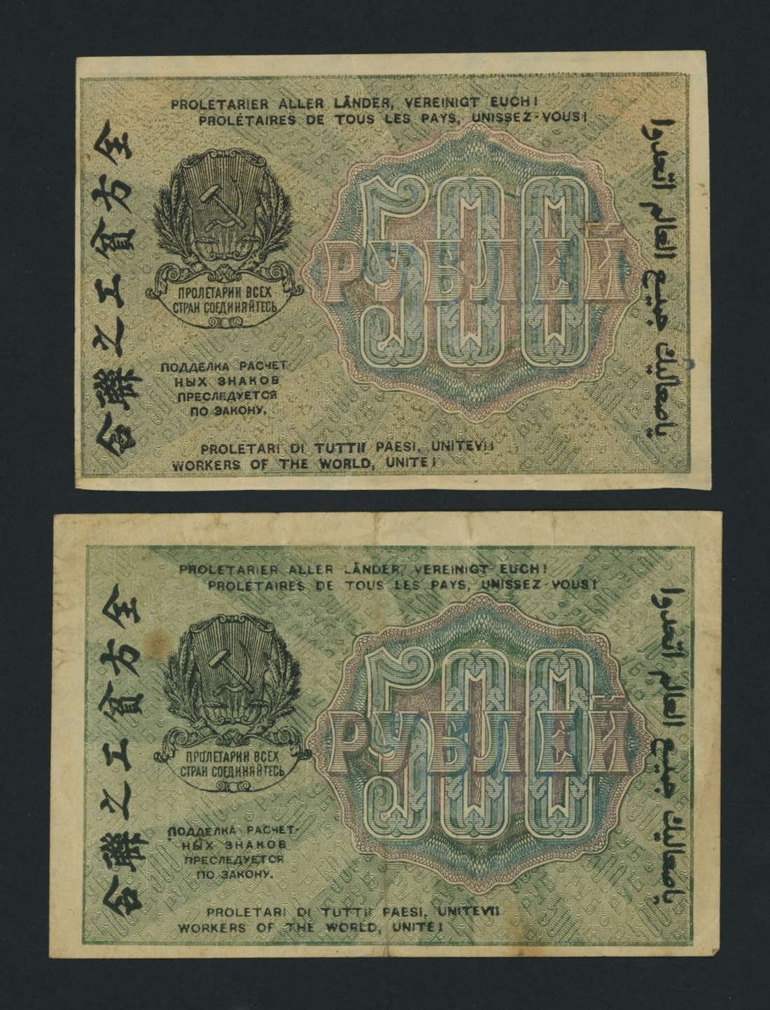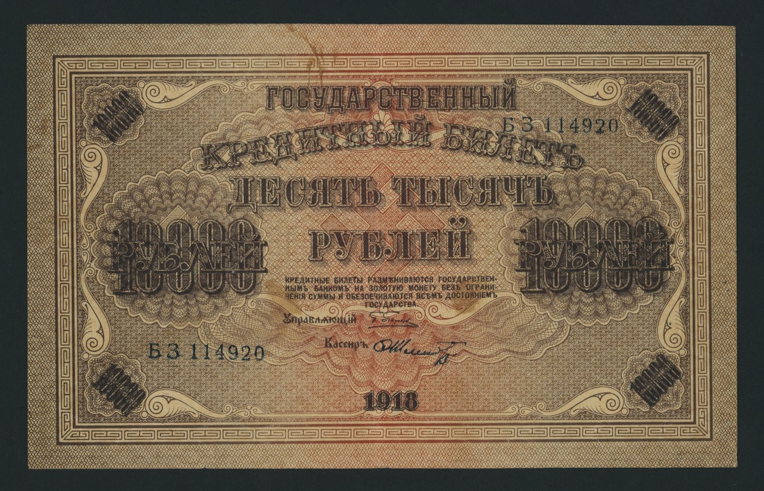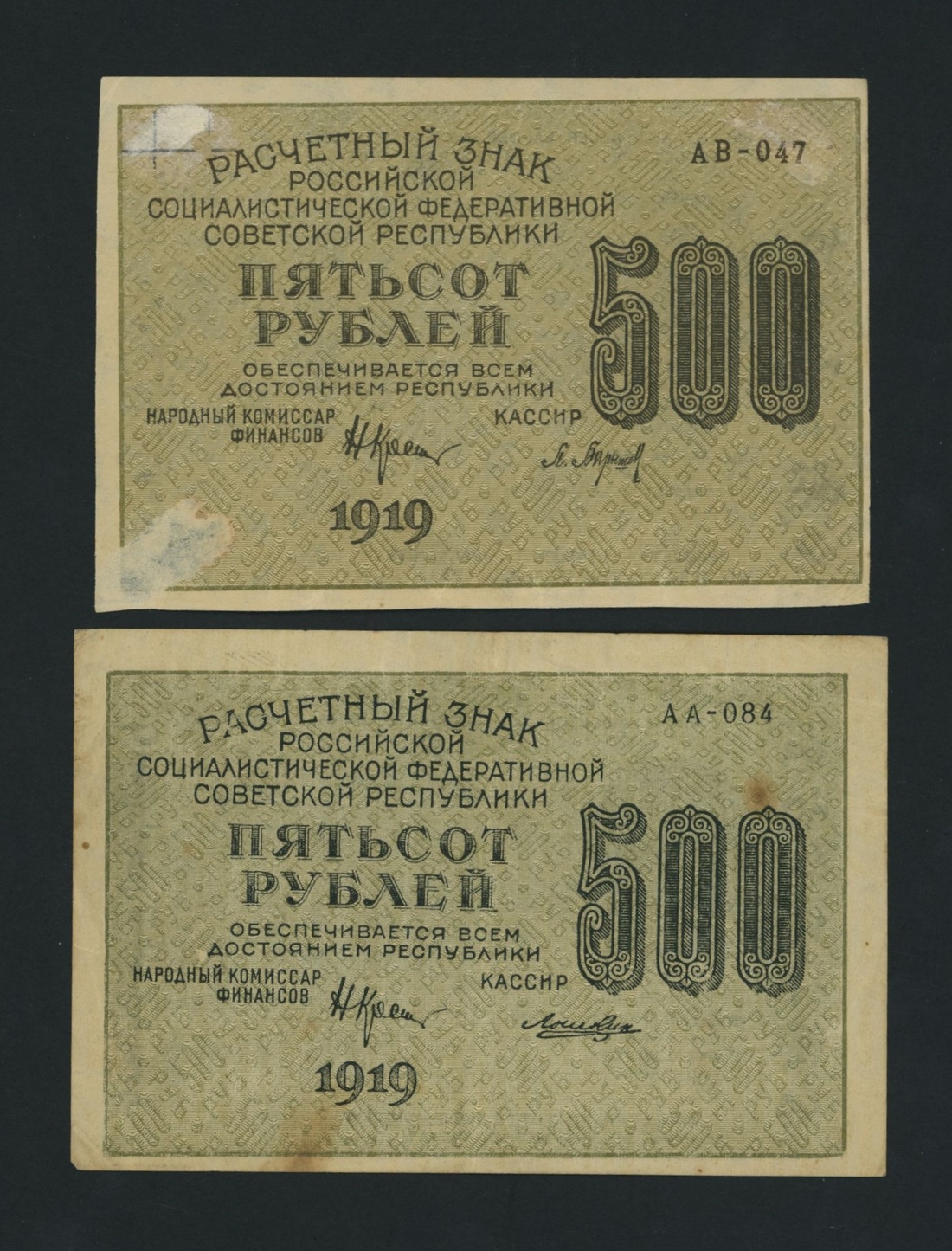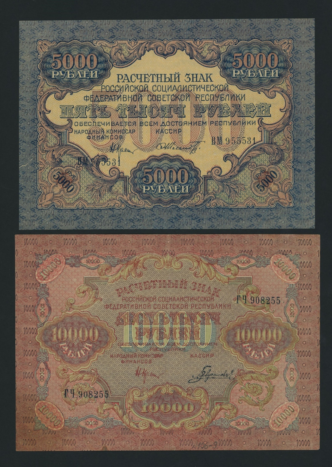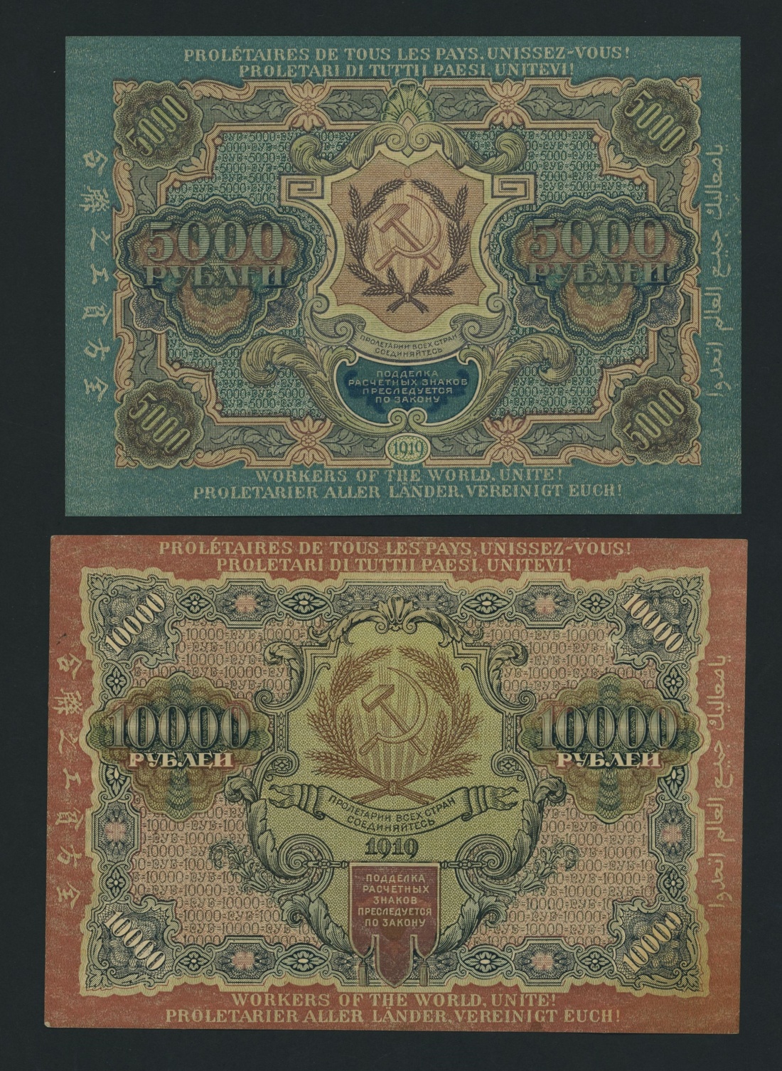 Soviet State Credit Notes, [5 notes] 500, 5000, 10000 Rubles, 1919, serial numbers: VZ 114920 (P97); AV 047 (P103); AA 084 (P103); VM 955531 (P105); GCH 908255 (P106)