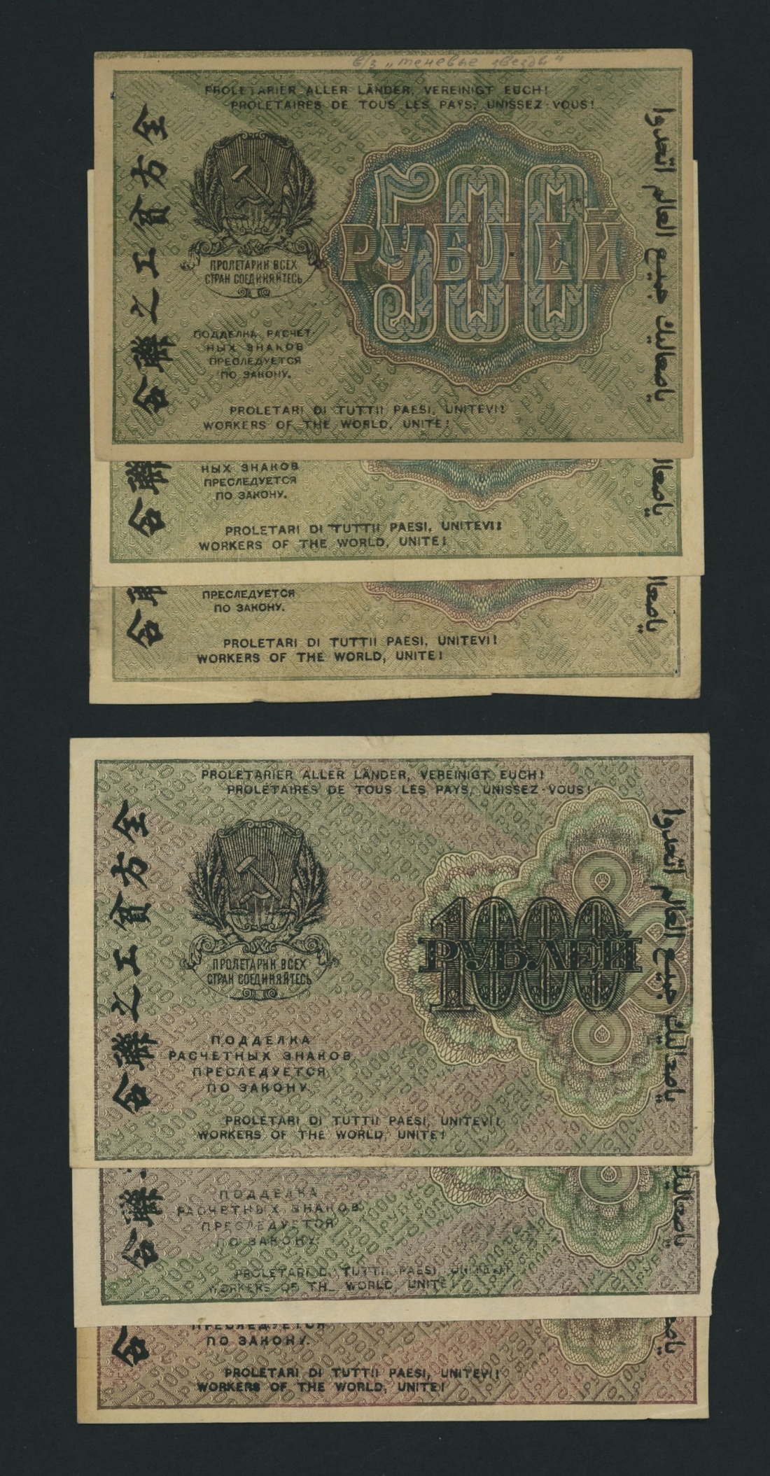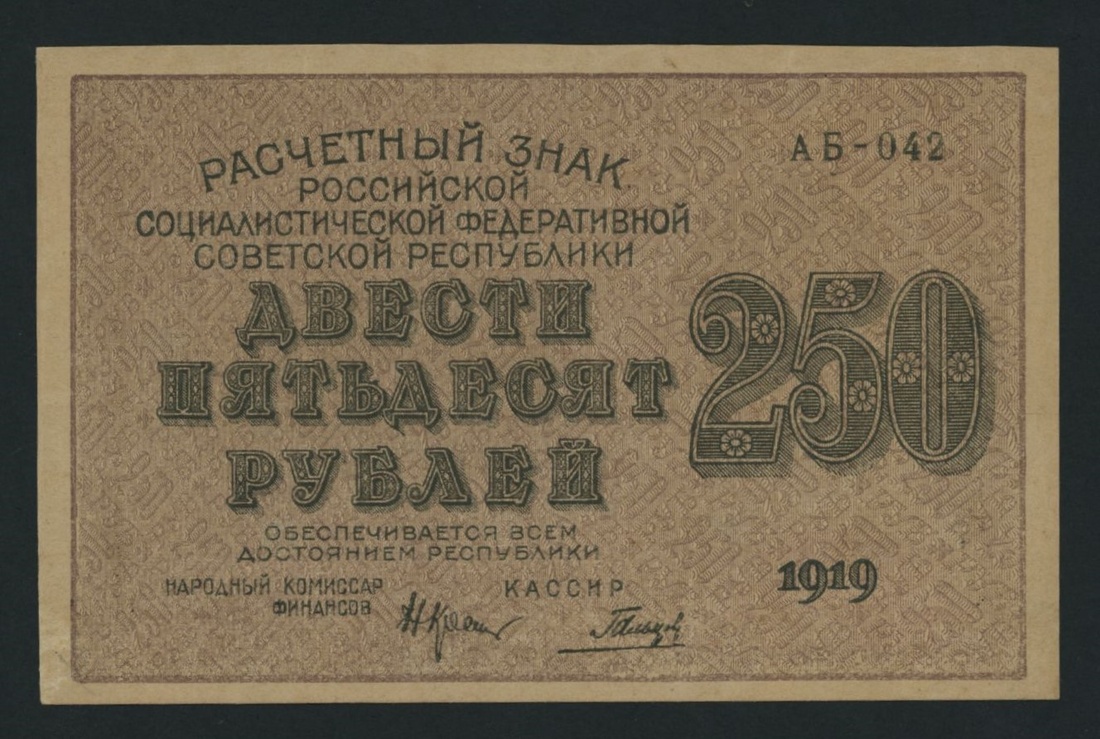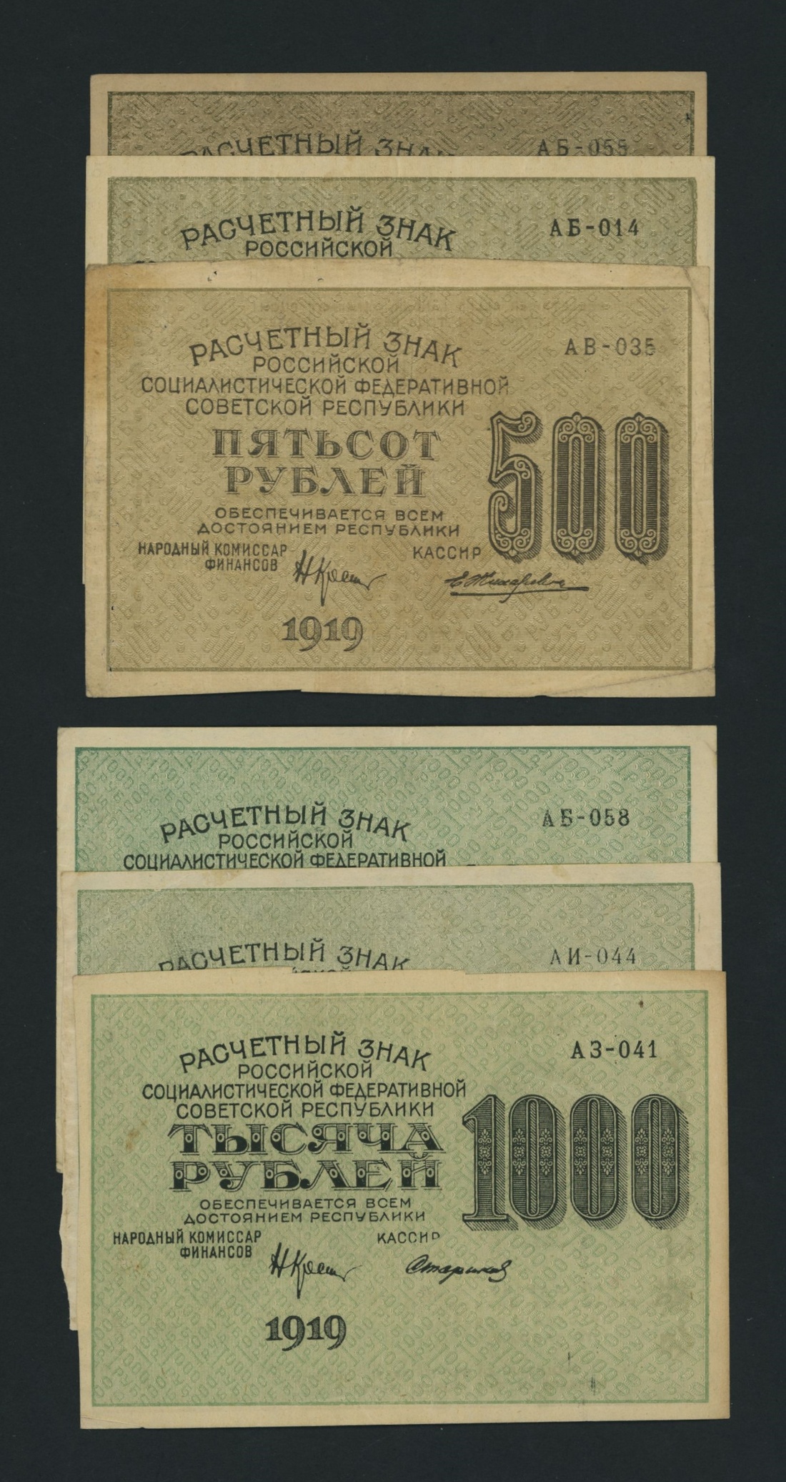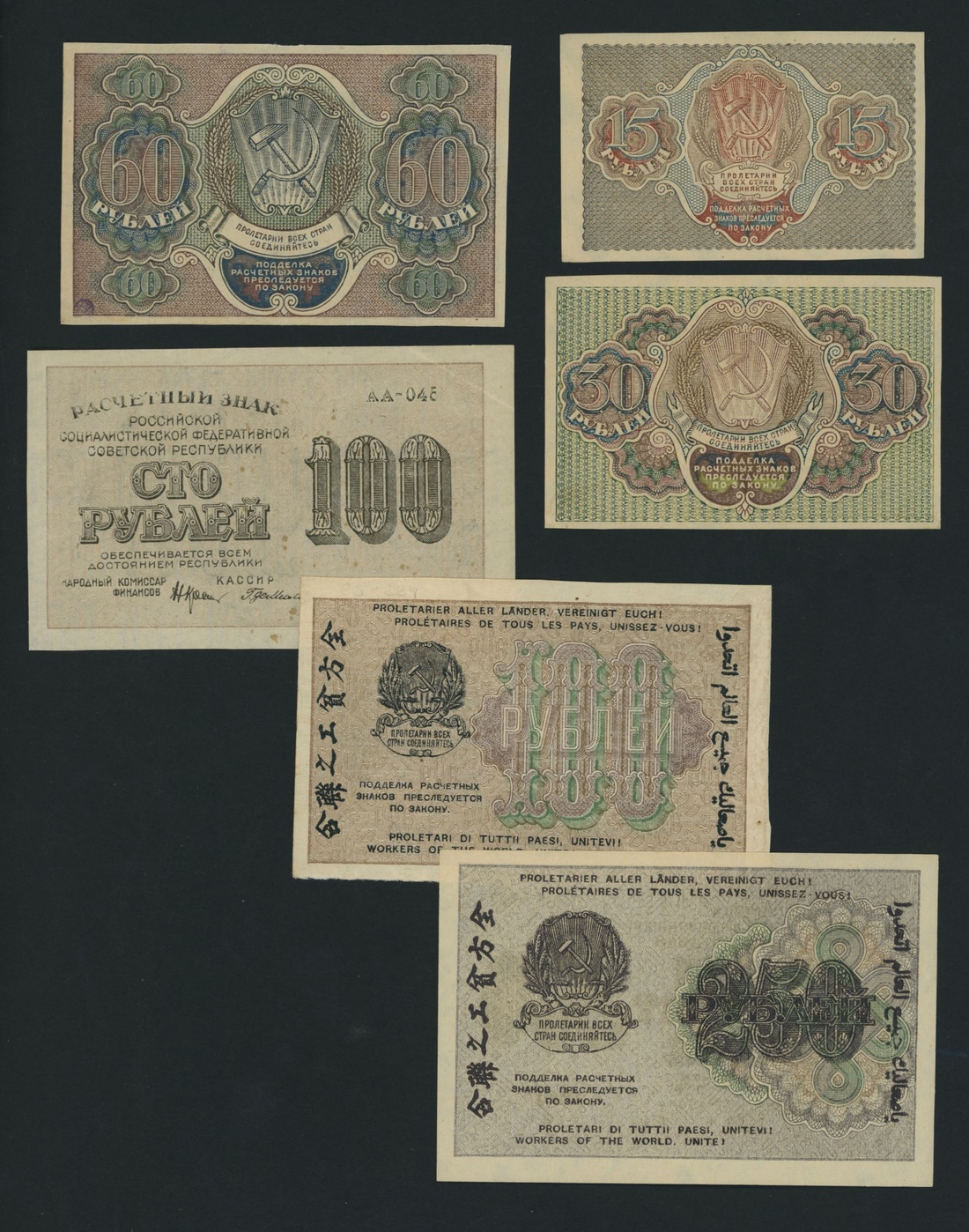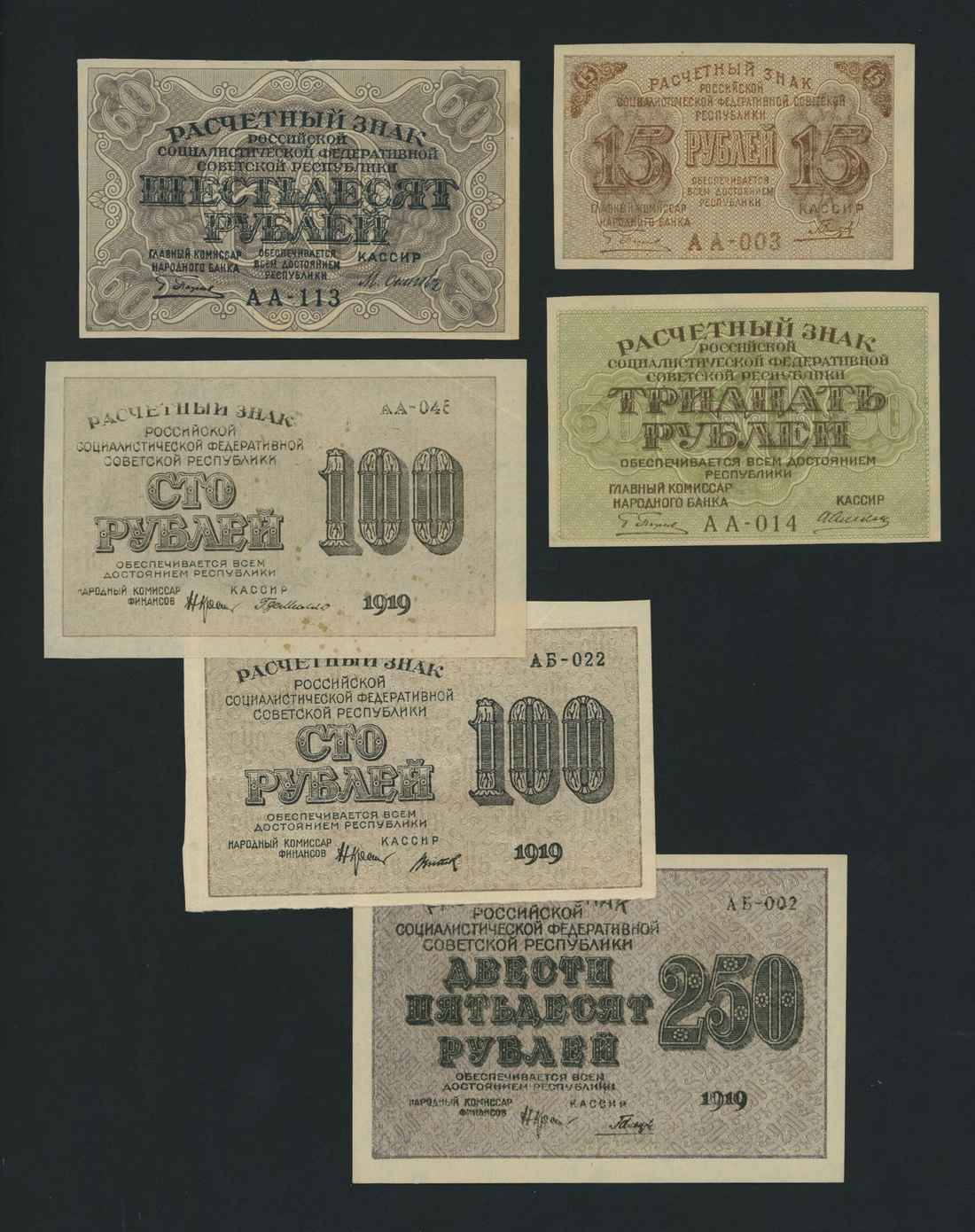 Soviet State Credit Notes, [13 notes] 15, 30, 60, 100, 250, 500, 1000 Rubles, 1919, serial numbers: AA 003 (P98); AA 014 (P99); AA 113 (P100); AA 045 (P101); AB 022 (P101); AB 002 (P102); AB 042 (P102); AB 014 (P103); AB 055 (P103); AV 035 (P103); AZ 041 (P104); AI 044 (P104); AB 058 (P104)