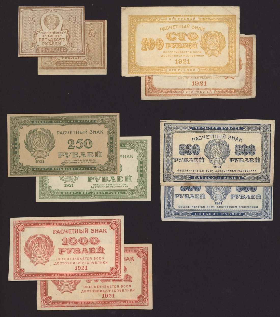 Soviet State Currency Notes, [10 notes] 50, 100, 250, 500, 1000 Rubles, 1921, (Pick 107a, 107b, 108, 109, 110a, 110b, 111a, 111b, 112a, 112b), good very fine to extremely fine, residue (10 notes)