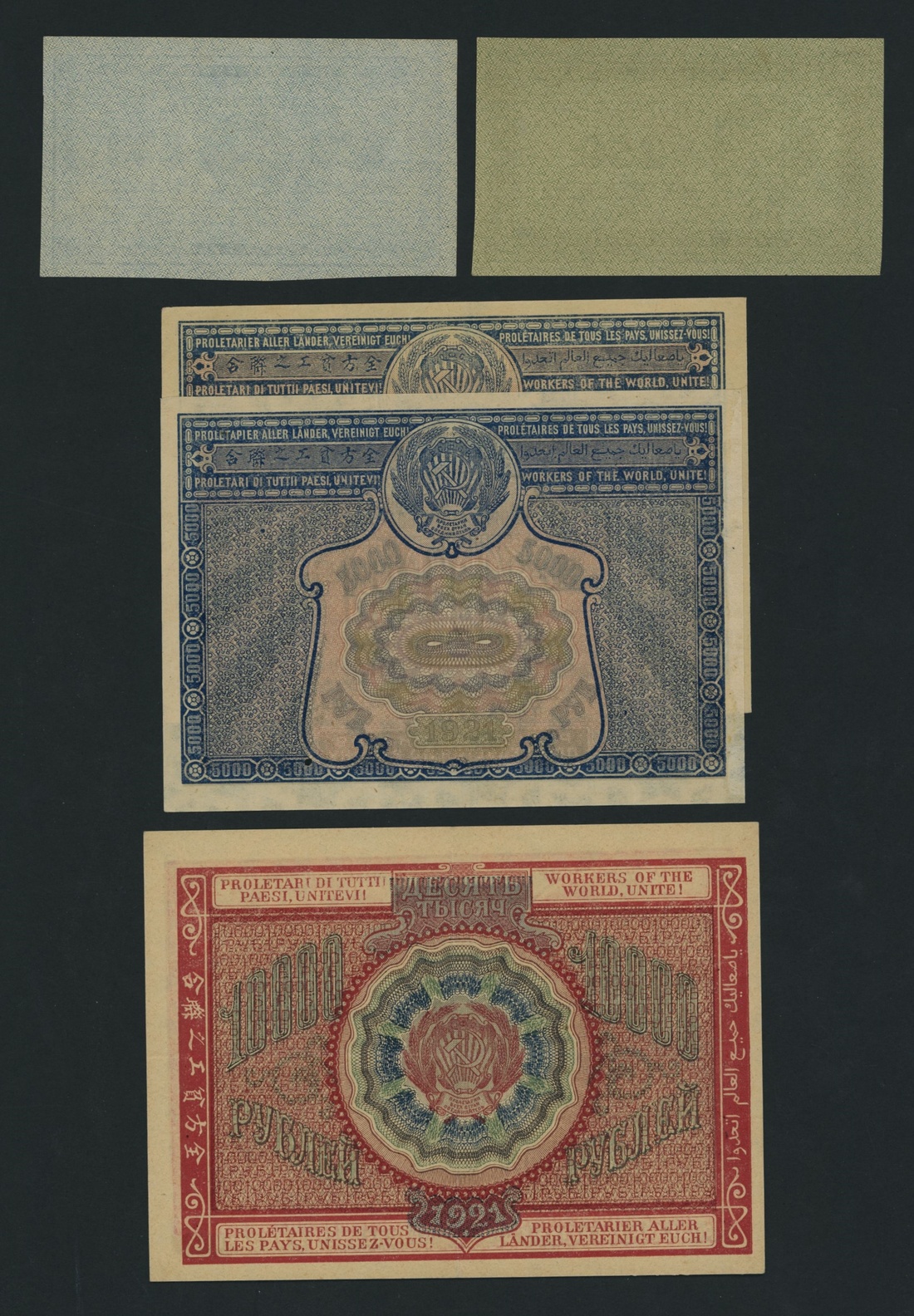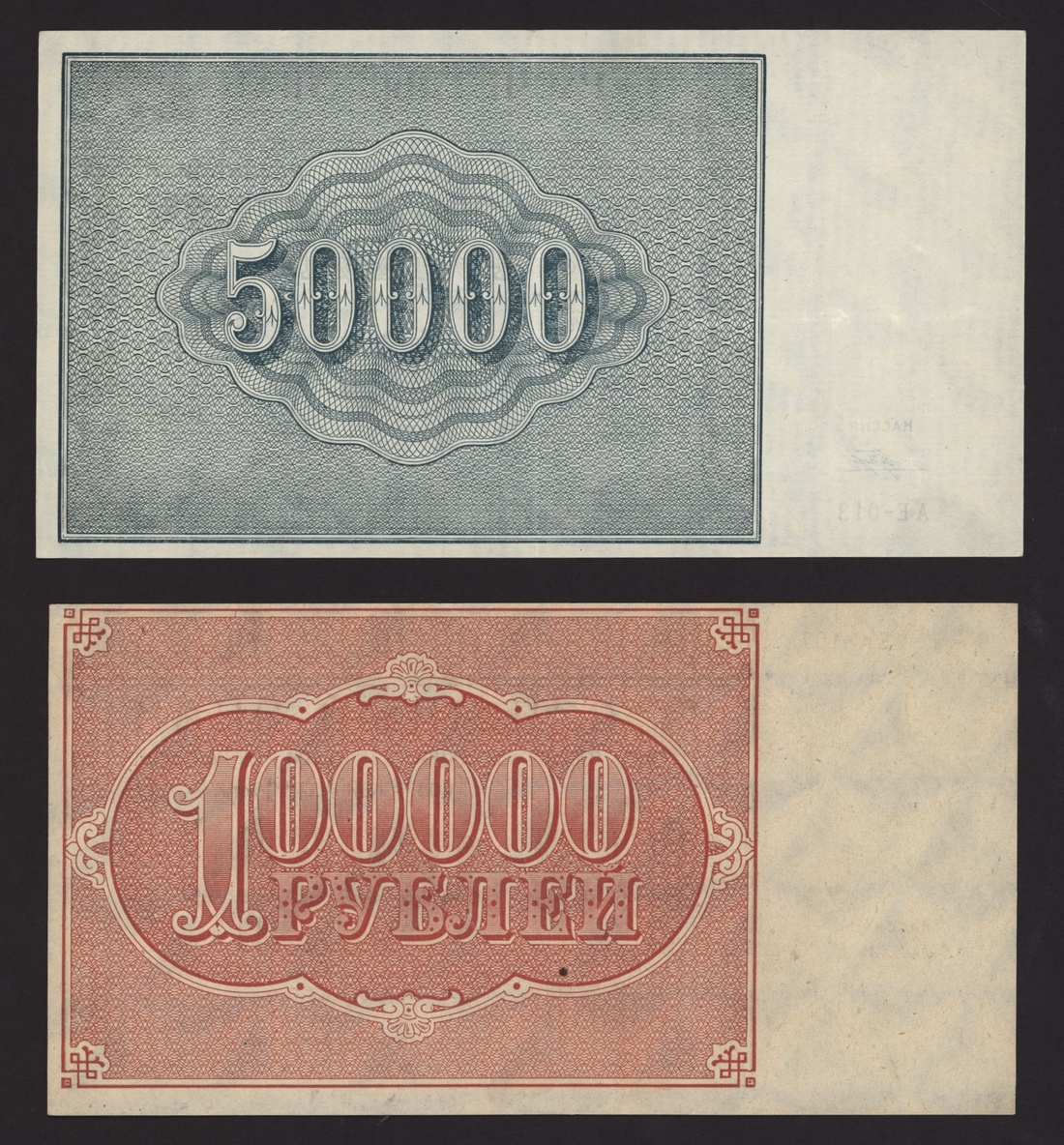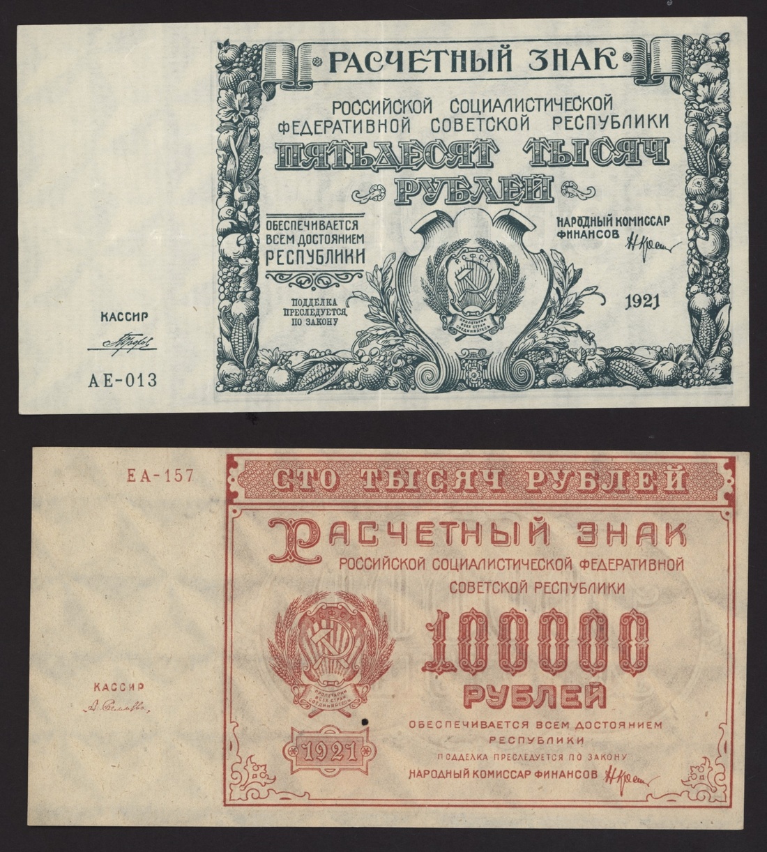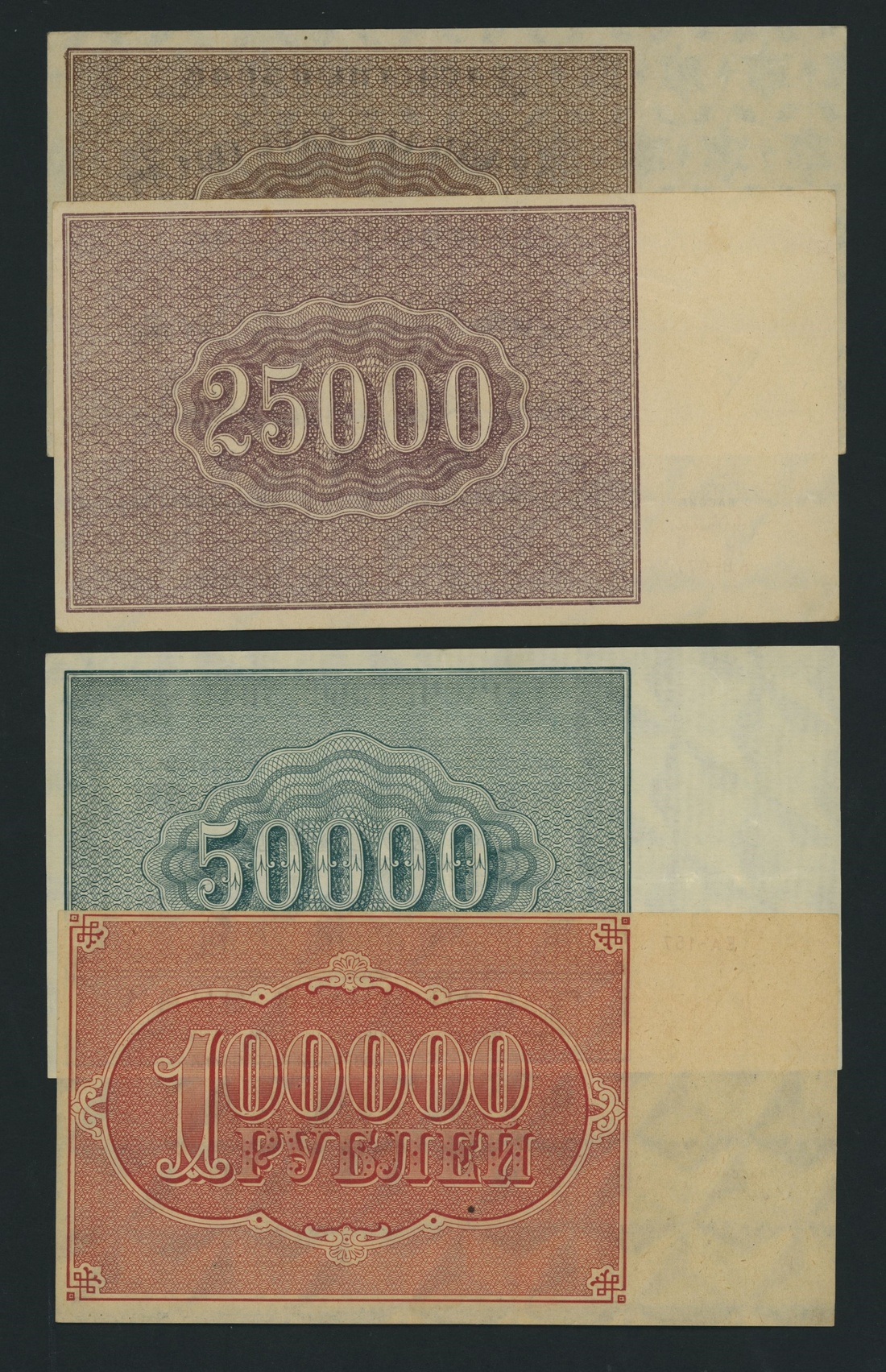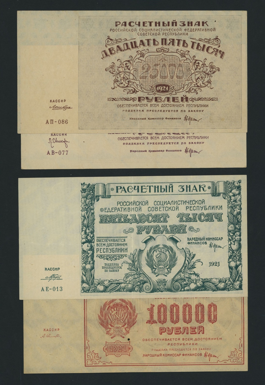 Soviet State Currency Notes, [9 notes] 250, 500, 5000, 10000, 15000, 25000, 50000, 100000 Rubles, 1921, serial numbers: AB 017 (P114); AP 086 (P115); AB 077 (P115); AE 013 (P116); EA 157 (P117)