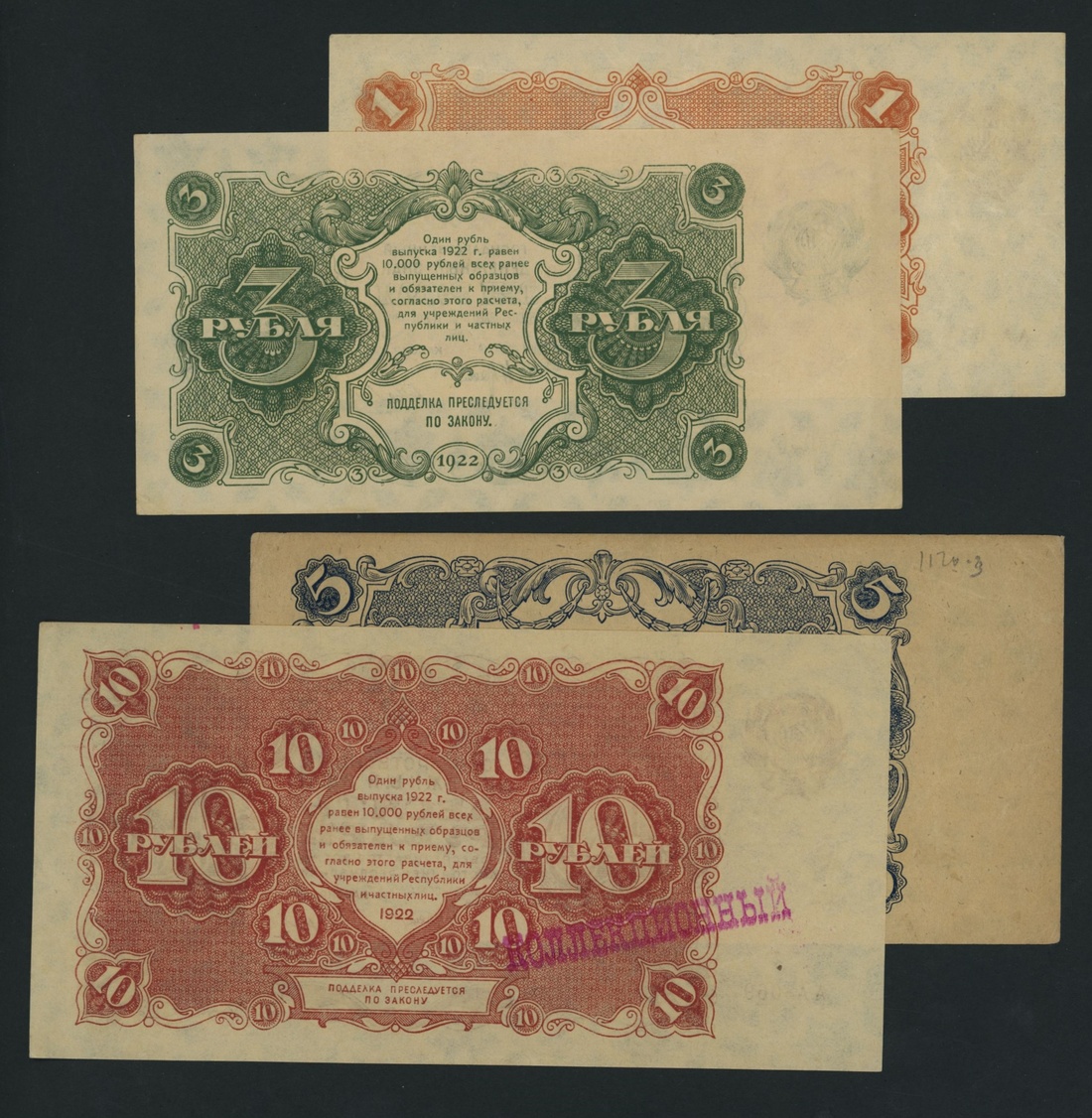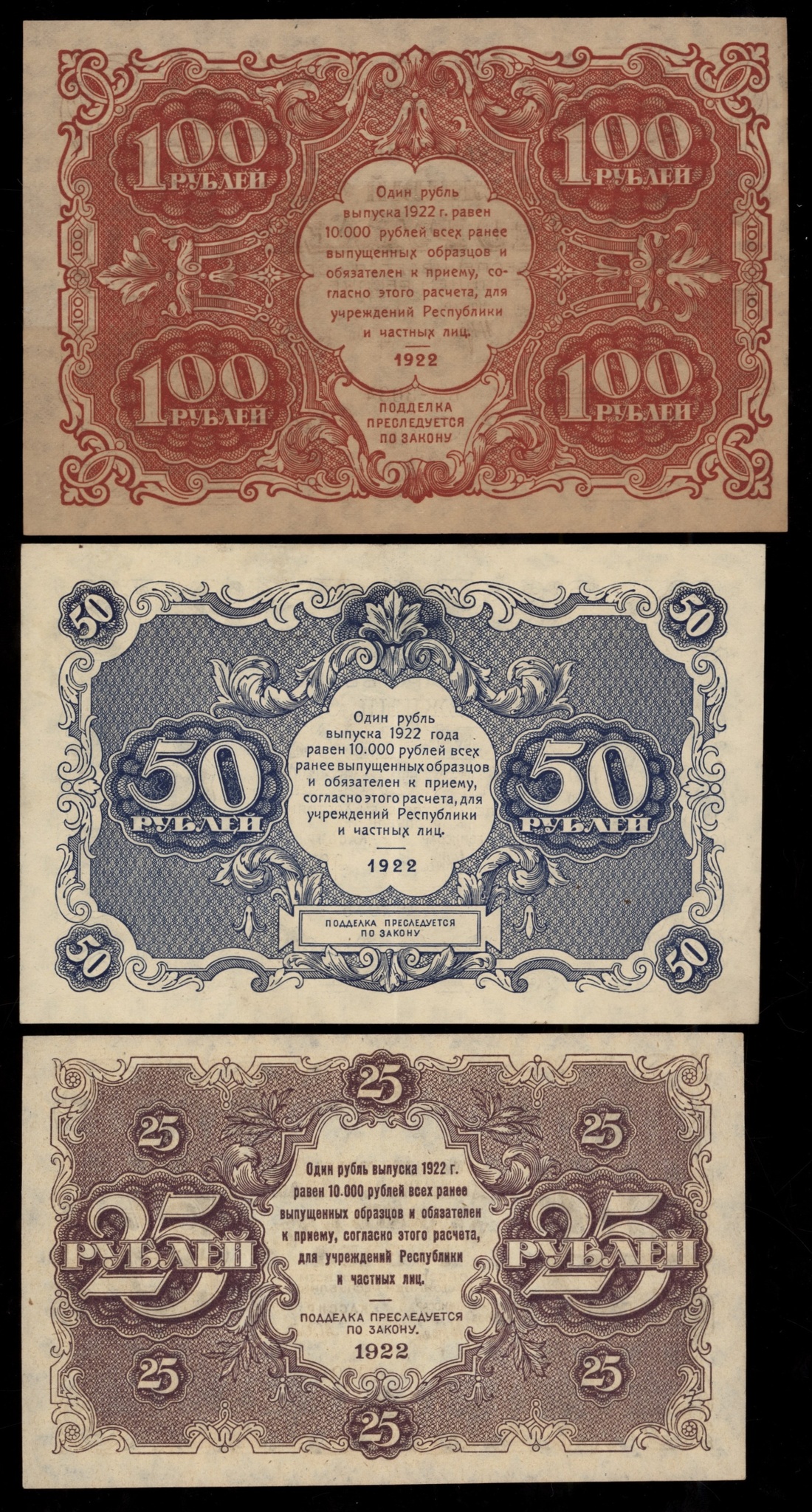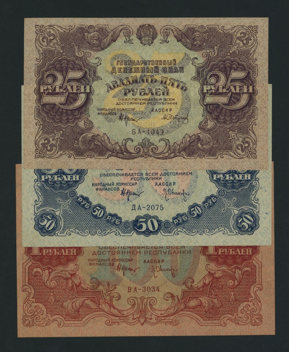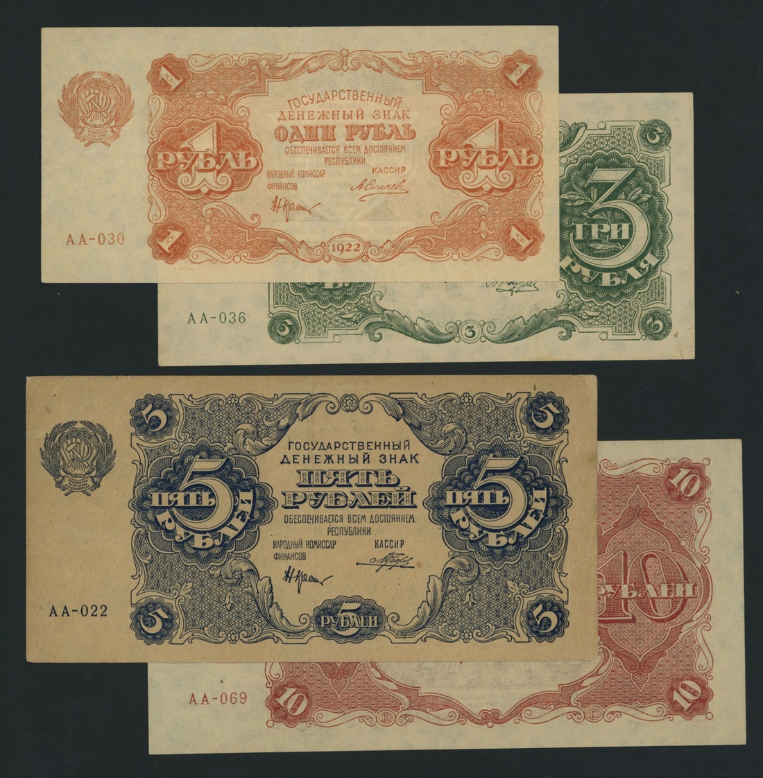Soviet State Currency Notes, [7 notes] 1, 3, 5, 10, 25, 50, 100 Rubles, 1922, serial numbers: AA 030 (P127); AA 036 (P128); AA 022 (P129); AA 069 (P130); BA 1049 (P131); DA 2075 (P132); BA 3034 (133)