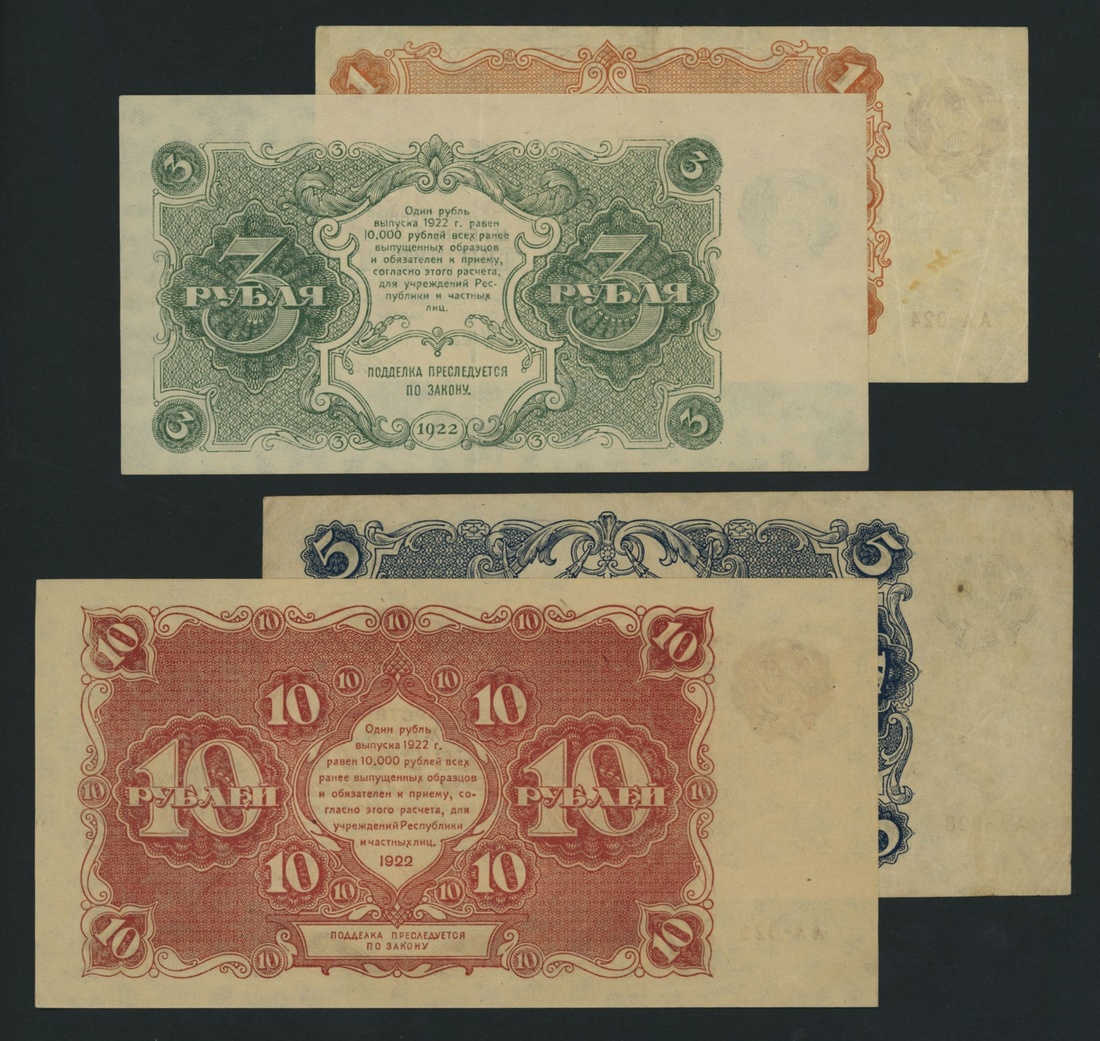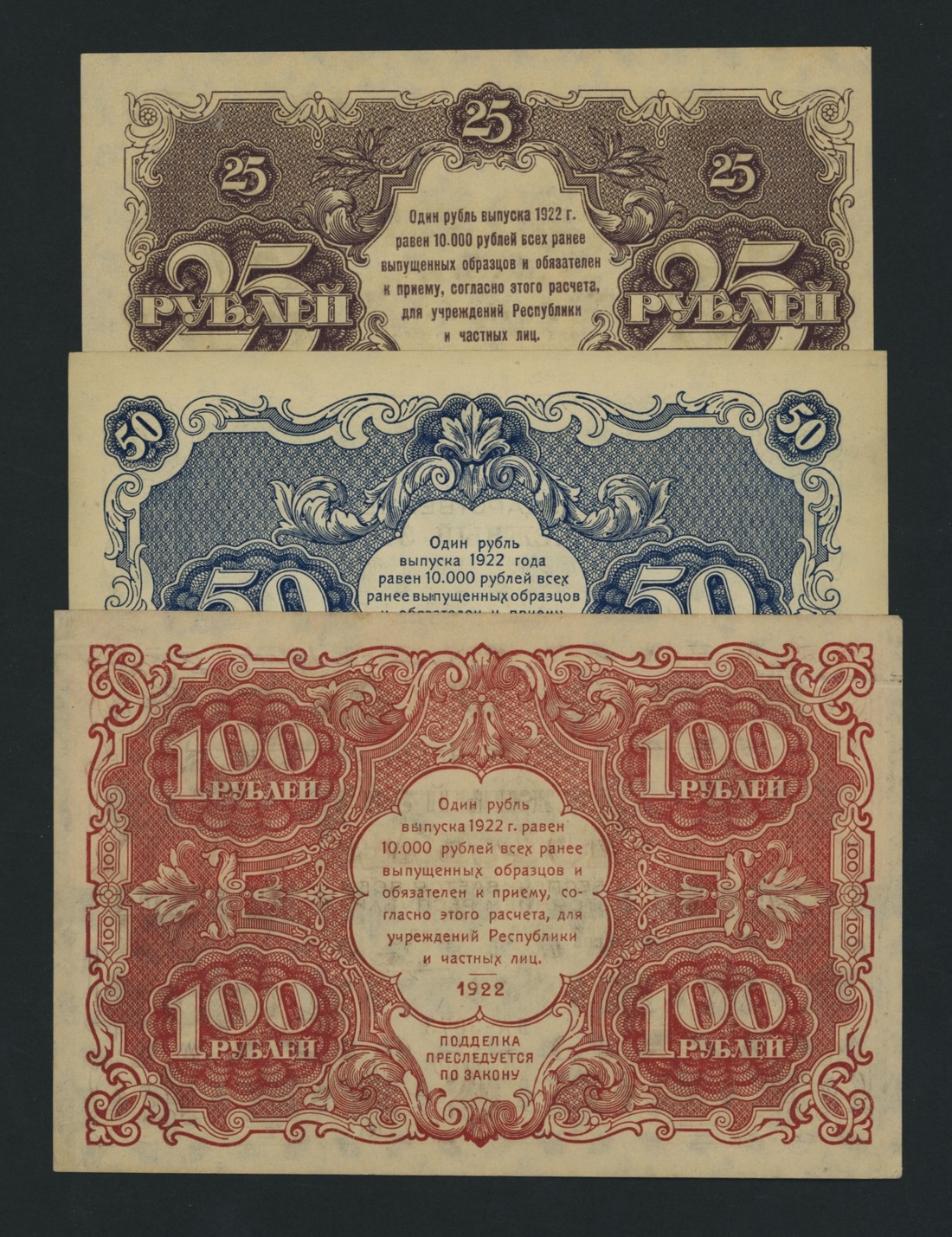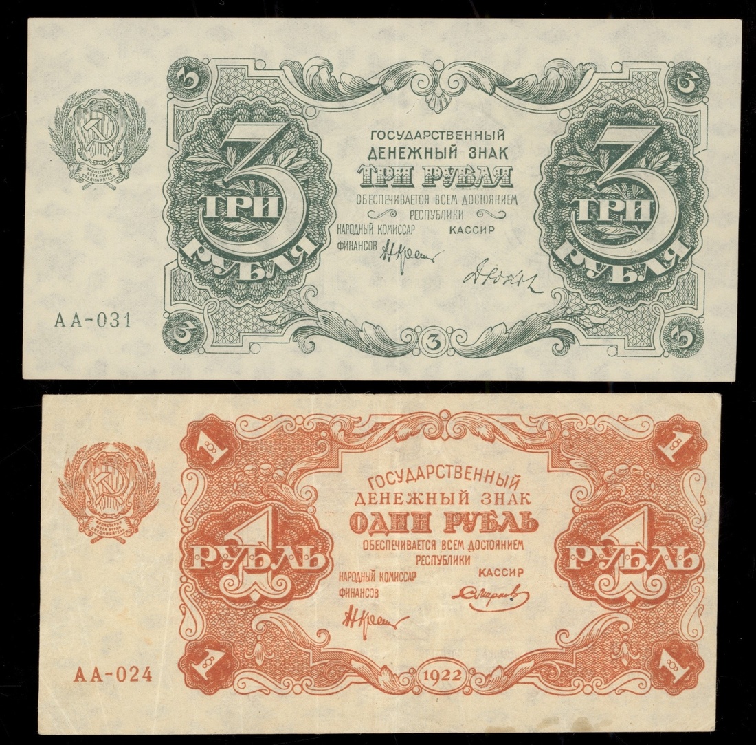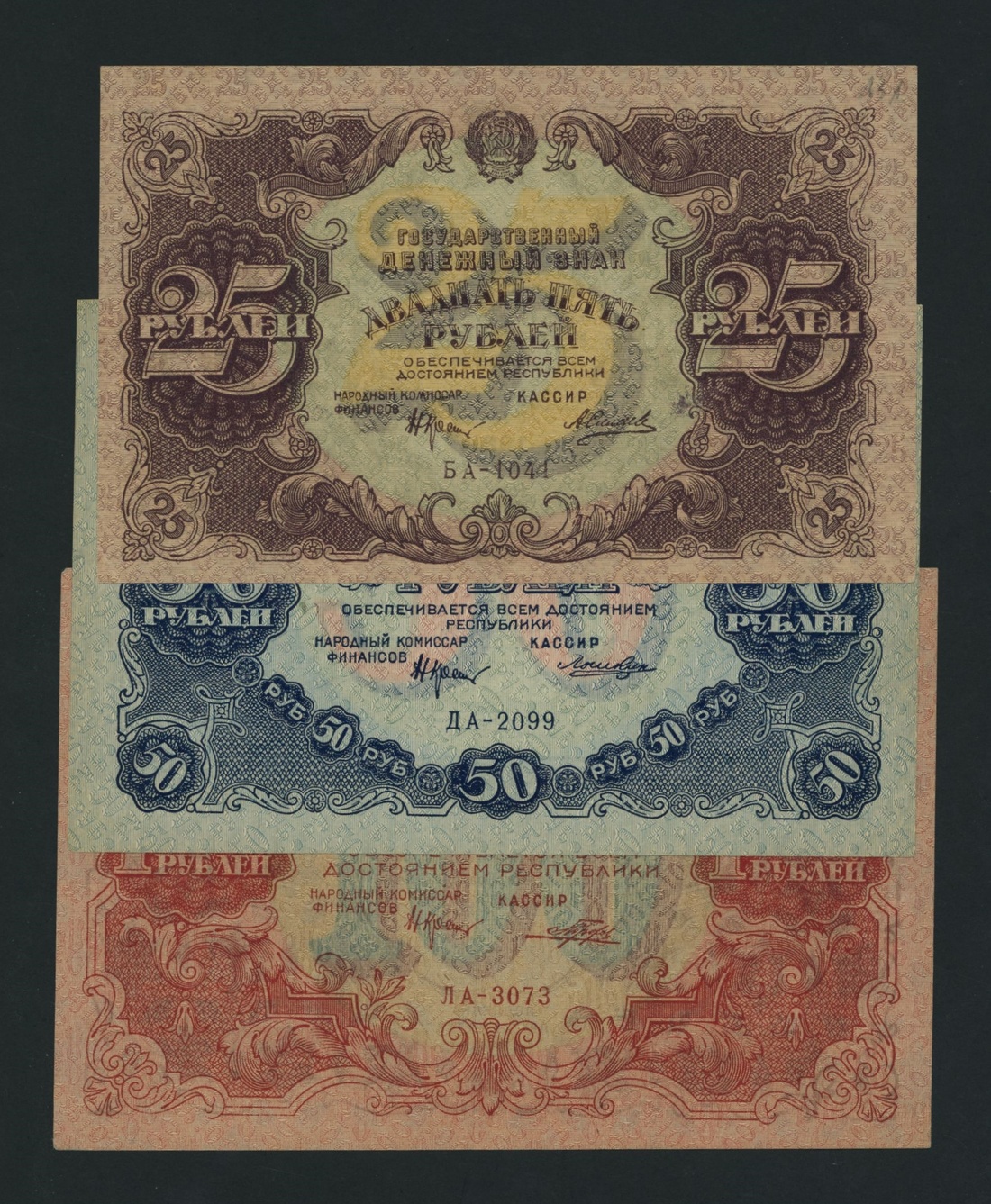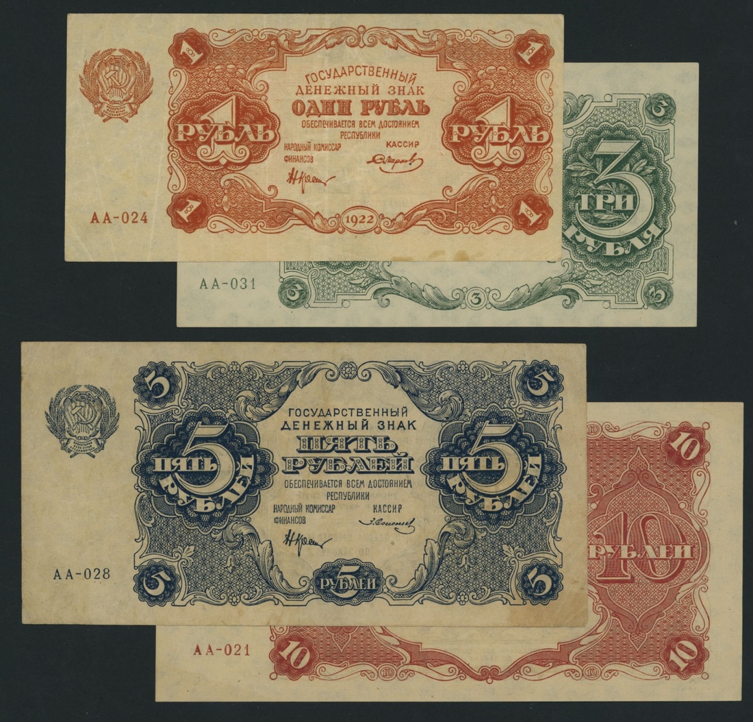 Soviet State Currency Notes, [7 notes] 1, 3, 5, 10, 25, 50, 100 Rubles, 1922, serial numbers: AA 024 (P127); AA 031 (P128); AA 028 (P129); AA 021 (P130); BA 1041 (P131); DA 2099 (P132); LA 3073 (P133)