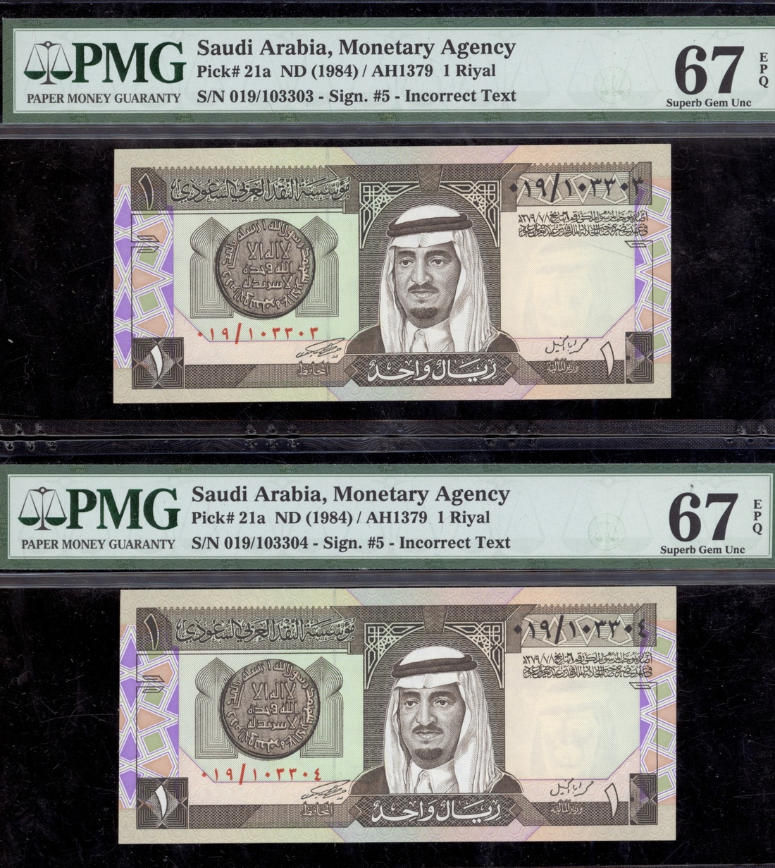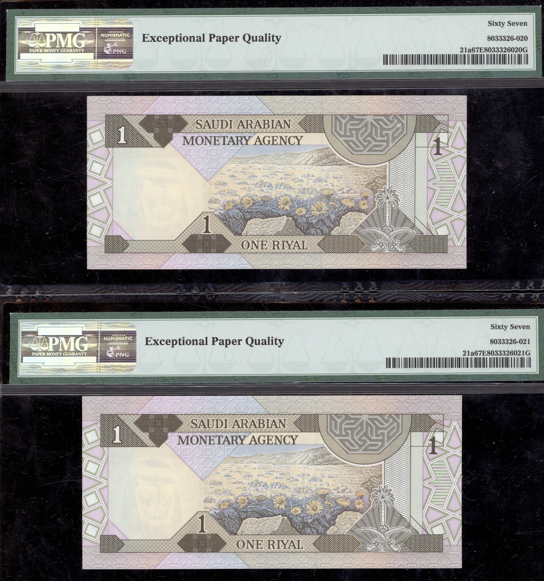 (x) Saudi Arabian Monetary Agency, [2 notes] 1 Riyal, ND (1984), consecutive serial numbers 019/103303-4, (Pick 21a, BNB 120c), both in PMG holder 67 EPQ Superb Gem Uncirculated (2 notes)
