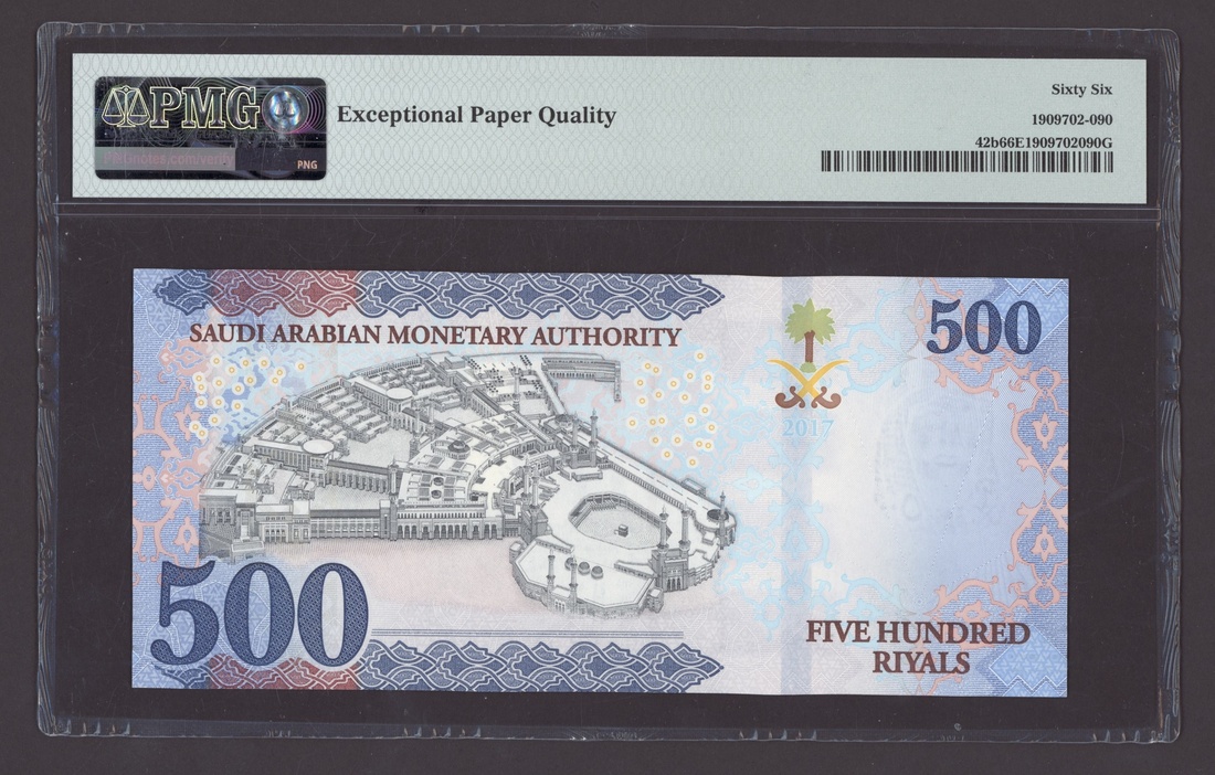 (x) Saudi Arabia Monetary Authority, 500 Riyals, 2017, serial number A216588206, (Pick 42b, BNB 140), in PMG holder 66 EPQ Gem Uncirculated