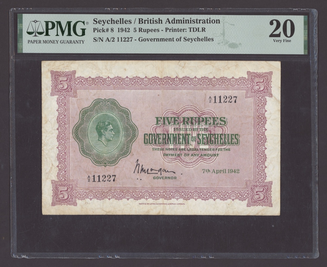 (x) Seychelles, British Administration, 5 Rupees, 7th April 1942, serial number A/2 11227, (Pick 8, BNB 115), in PMG holder 20 Very Fine