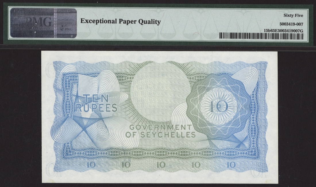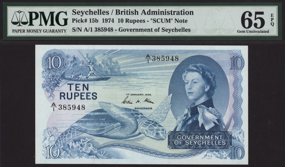 (x) Government of Seychelles, 10 Rupees, 1st January 1974, serial number A/1 385948, infamous 'SCUM' note