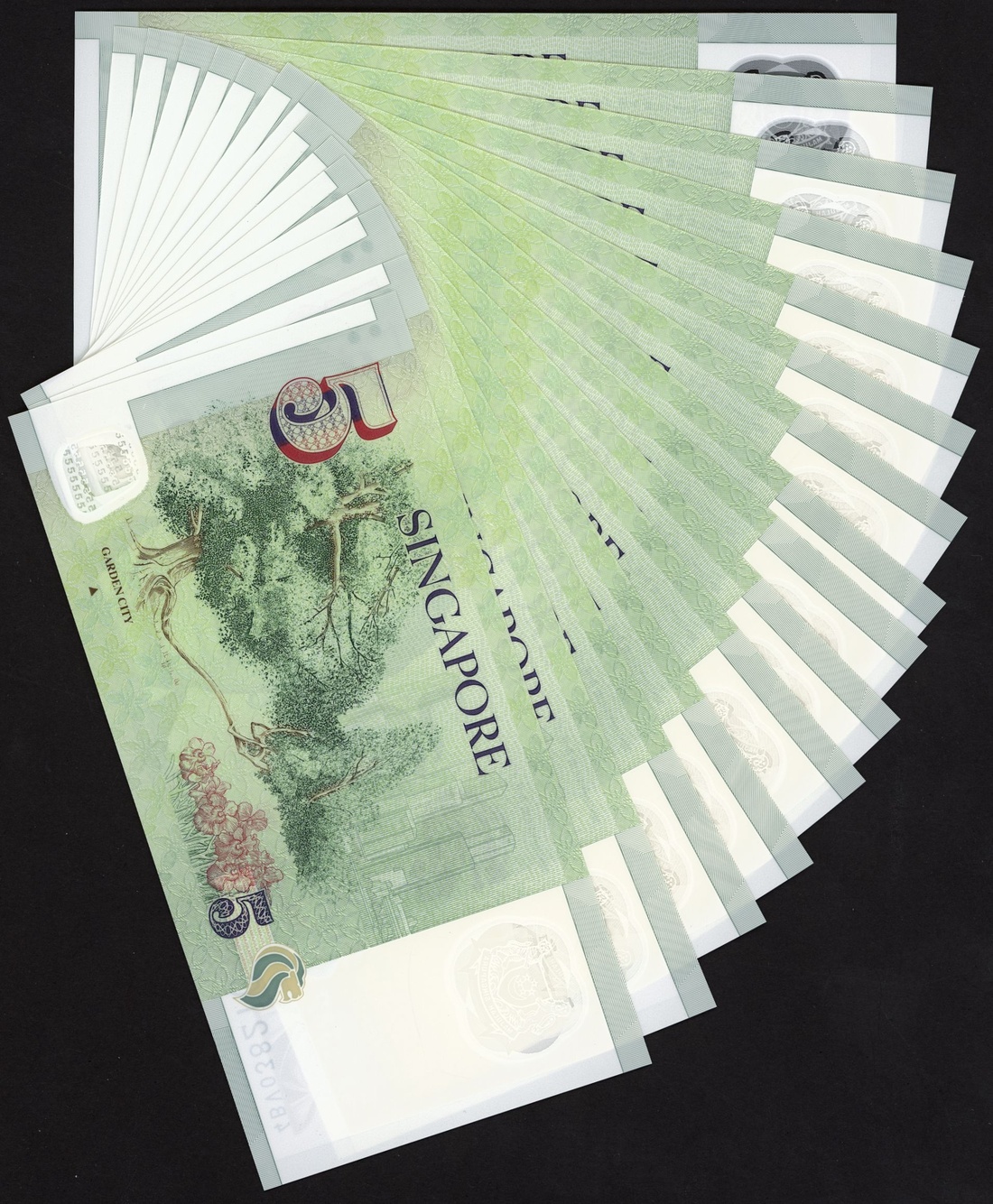 (x) Monetary Authority of Singapore, [15 notes] 5 Dollars, 2014, with matching serial number 038210, (Pick 47c), uncirculated (15 notes)