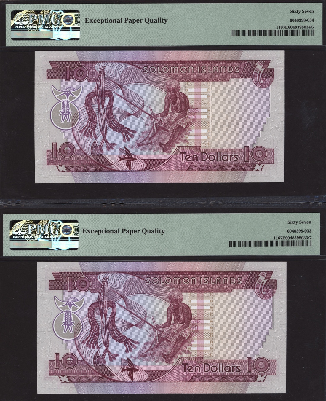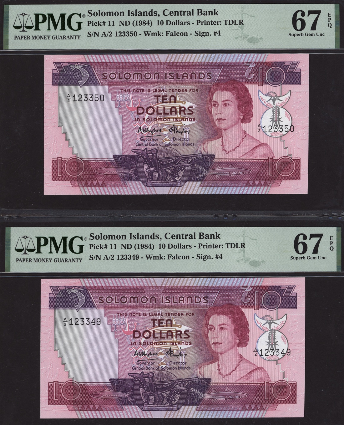 (x) Central Bank of Solomon Islands, pair 10 Dollars, ND (1984), consecutive serial numbers A/2 123349-50, (Pick 11), in PMG holders 67 EPQ Superb Gem Uncirculated (2 notes)