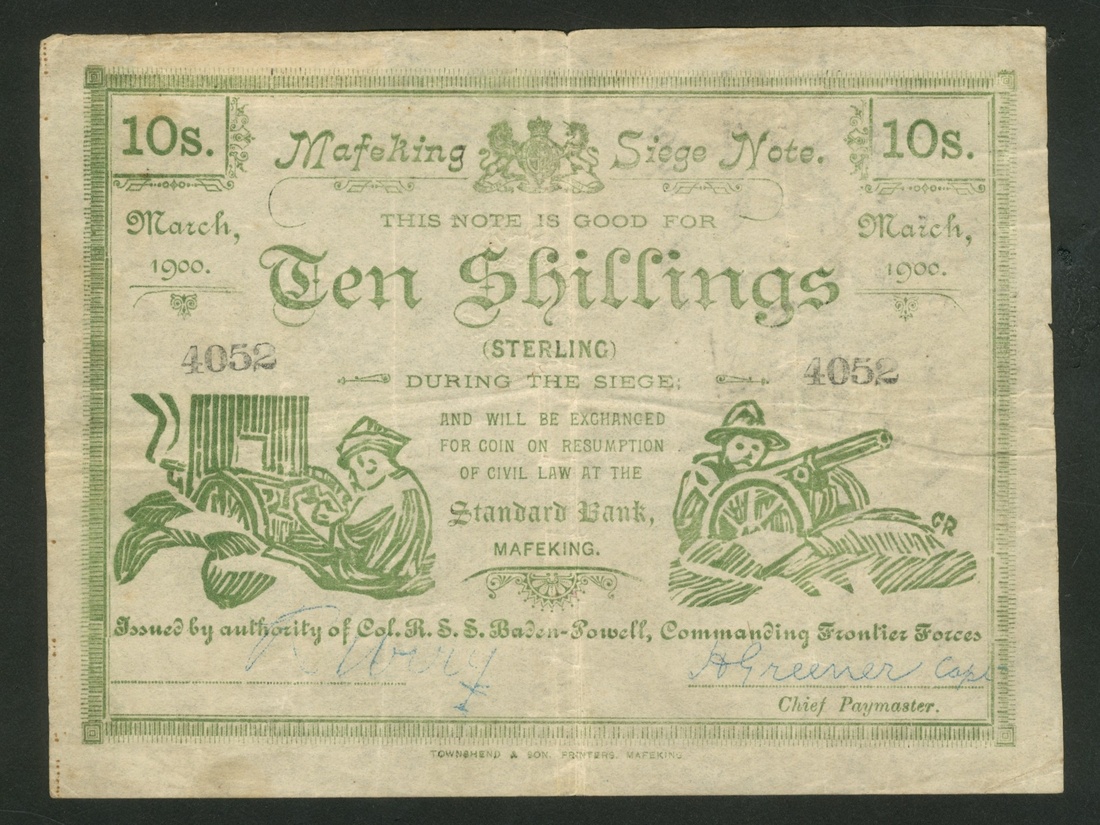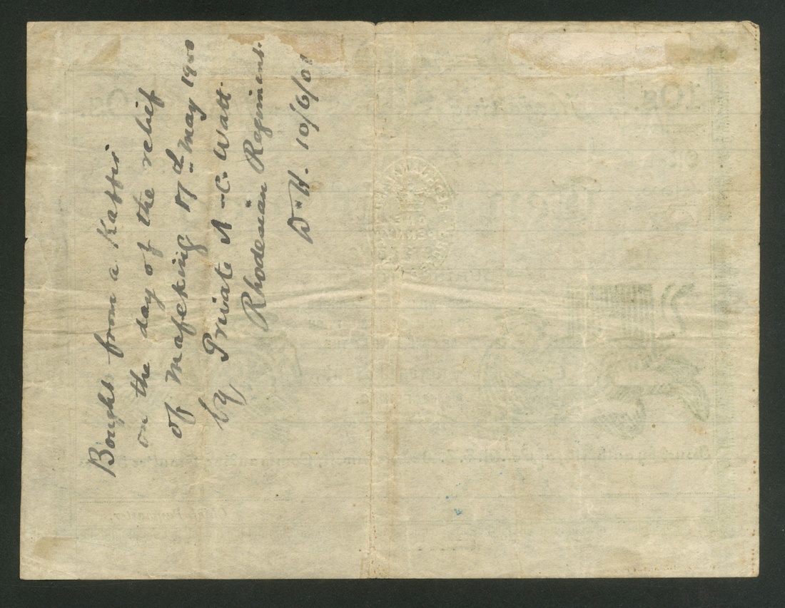 (x) Mafeking Siege Note, South Africa, 10 Shillings, March 1900, serial number 4052, on the reverse is handwriting reading "Bought from a Kaffir on the day of the relief of Mafeking 17th May 1900 by Private A. C. Watt Rhodesian Regiment"