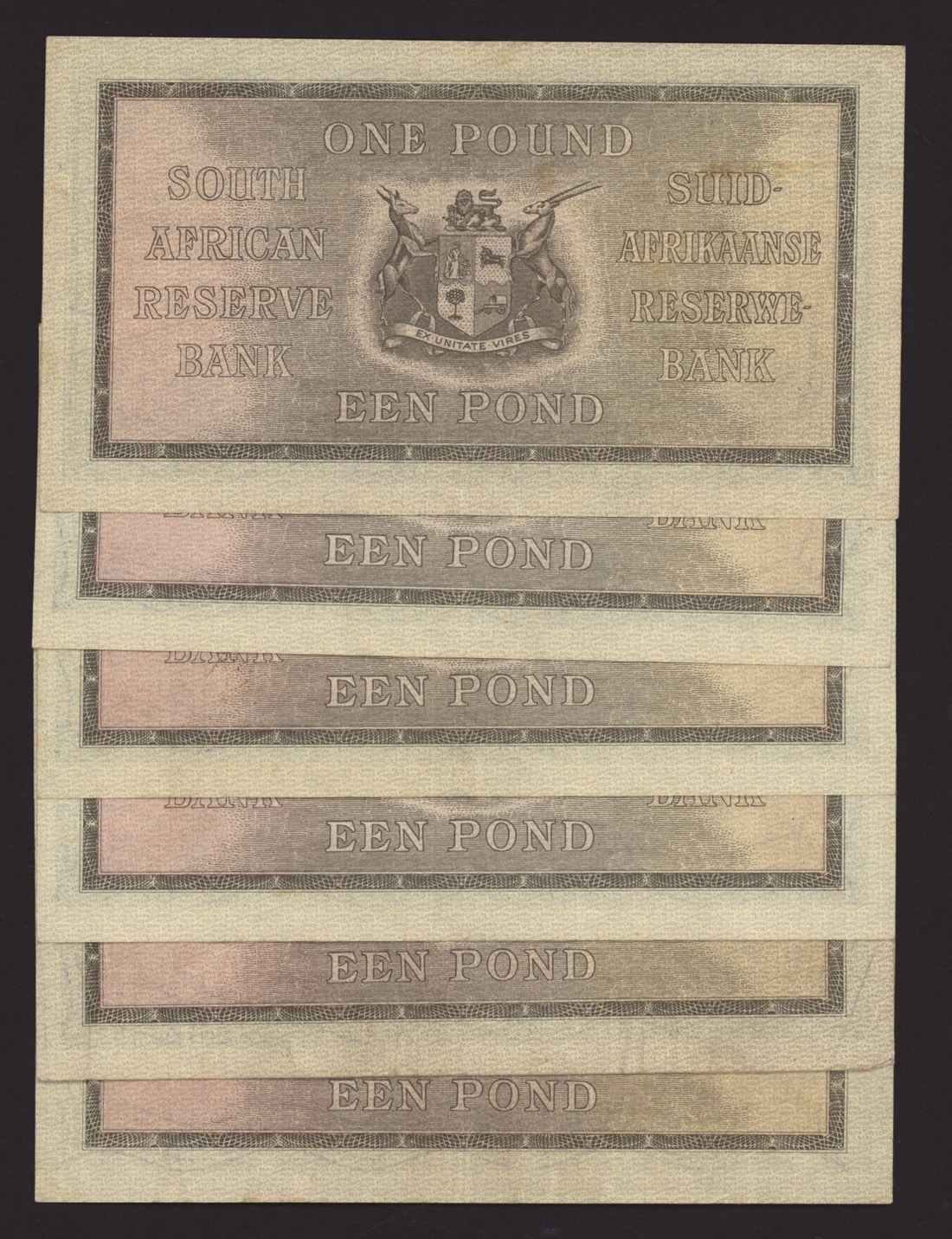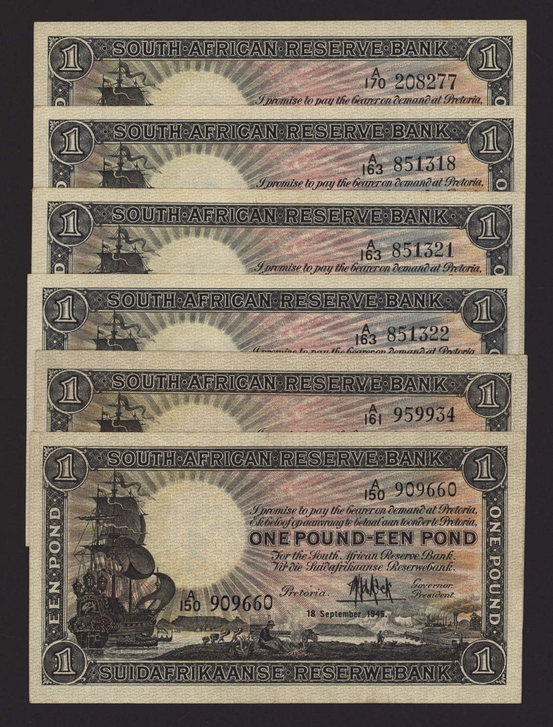 South African Reserve Bank, [6 notes] £1, Pretoria, 1945-1947, 18th September 1945, serial number A/150 909660;