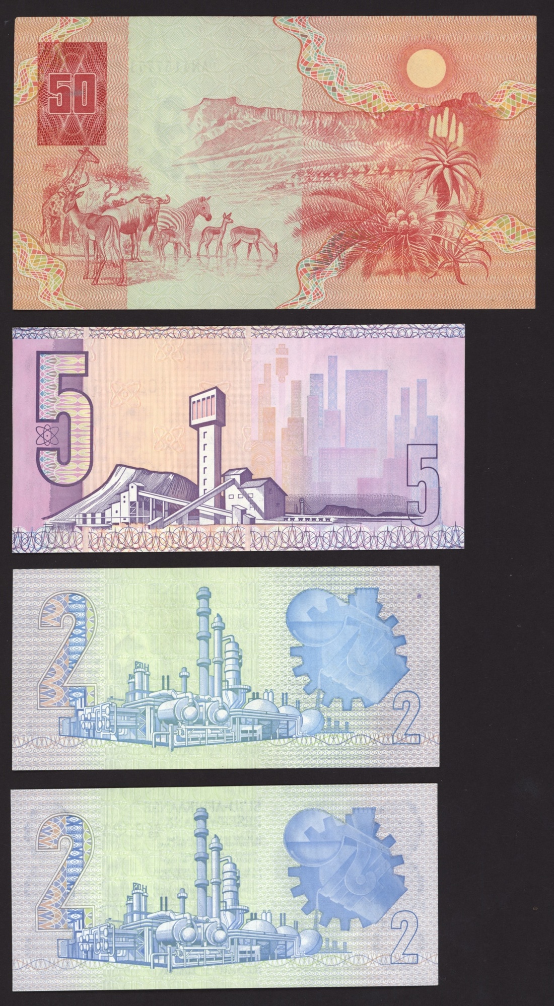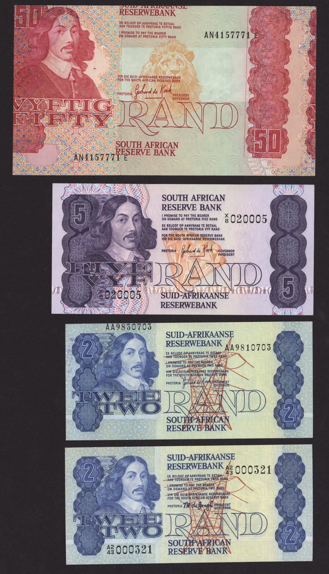 South African Reserve Bank, [4 notes] an interesting group of 2 error, 1 low serial number and 1 replacement notes 2, 5, 50 Rand, Pretoria, 1978-84,