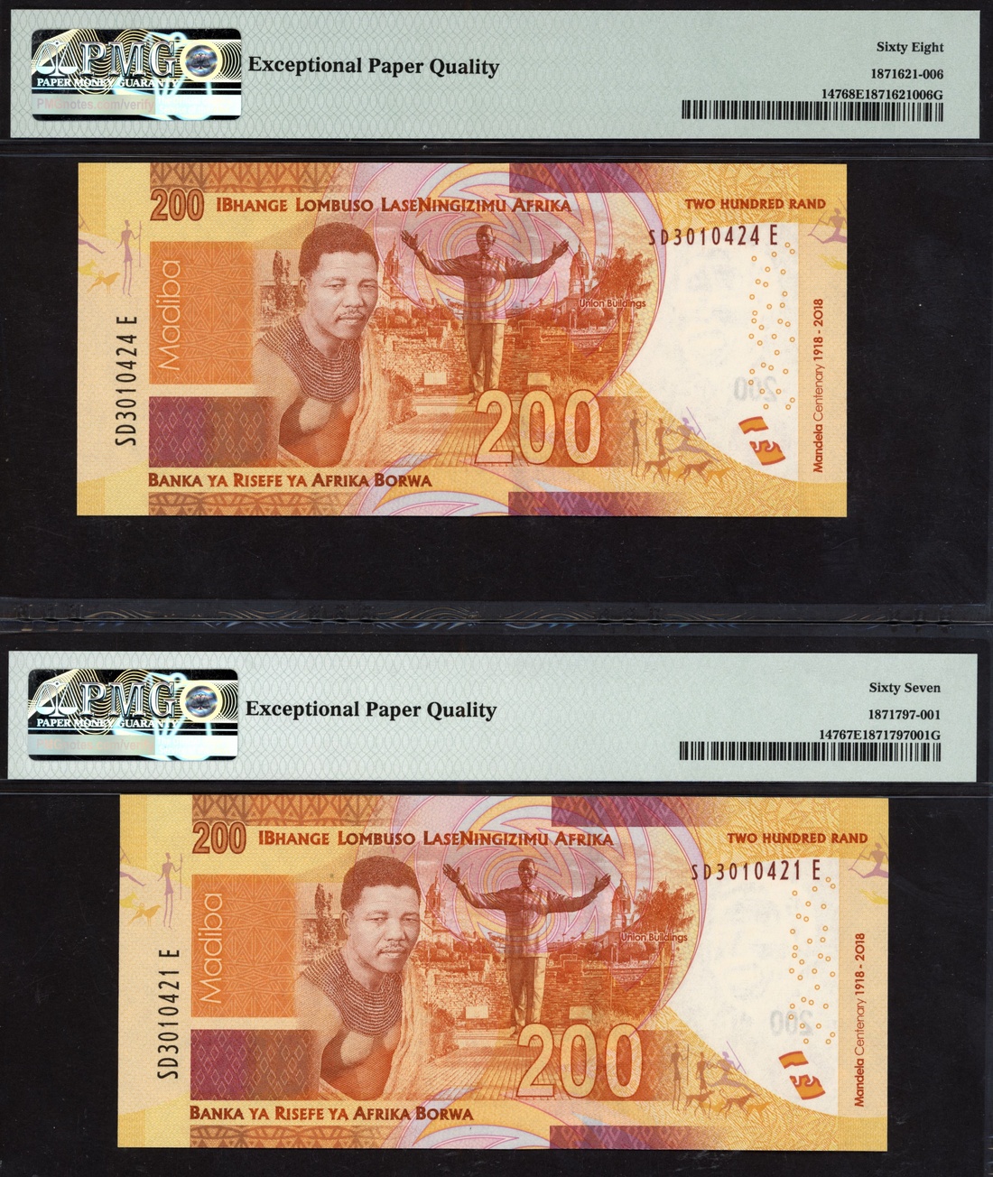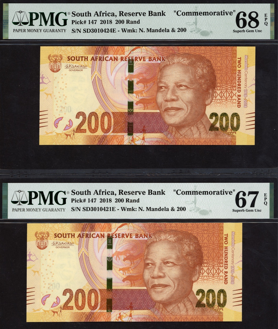 (x) South African Reserve Bank, [2 notes] 200 Rand, 2018, serial numbers SD 3010421E/424E, (Pick 147), in PMG holders 67 and 68 EPQ Superb Gem Uncirculated (2 notes)