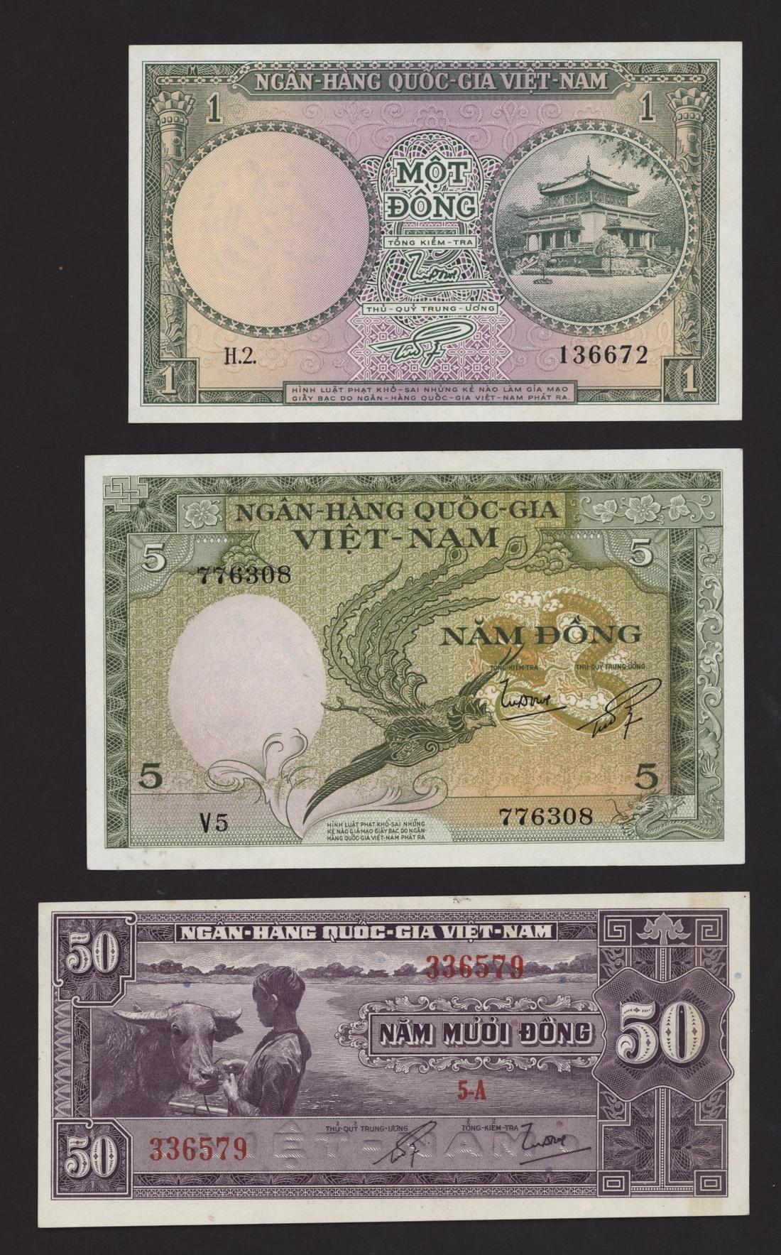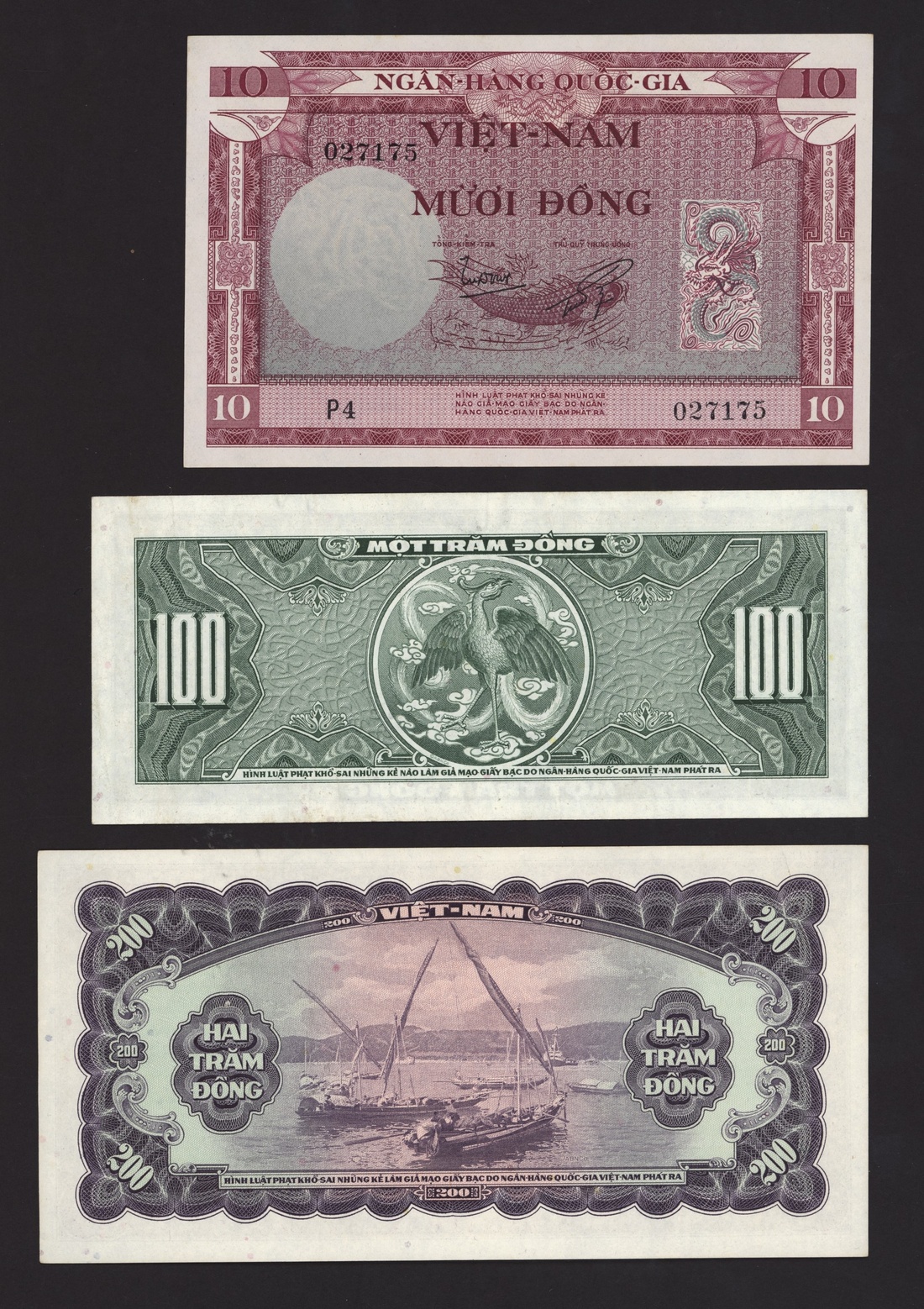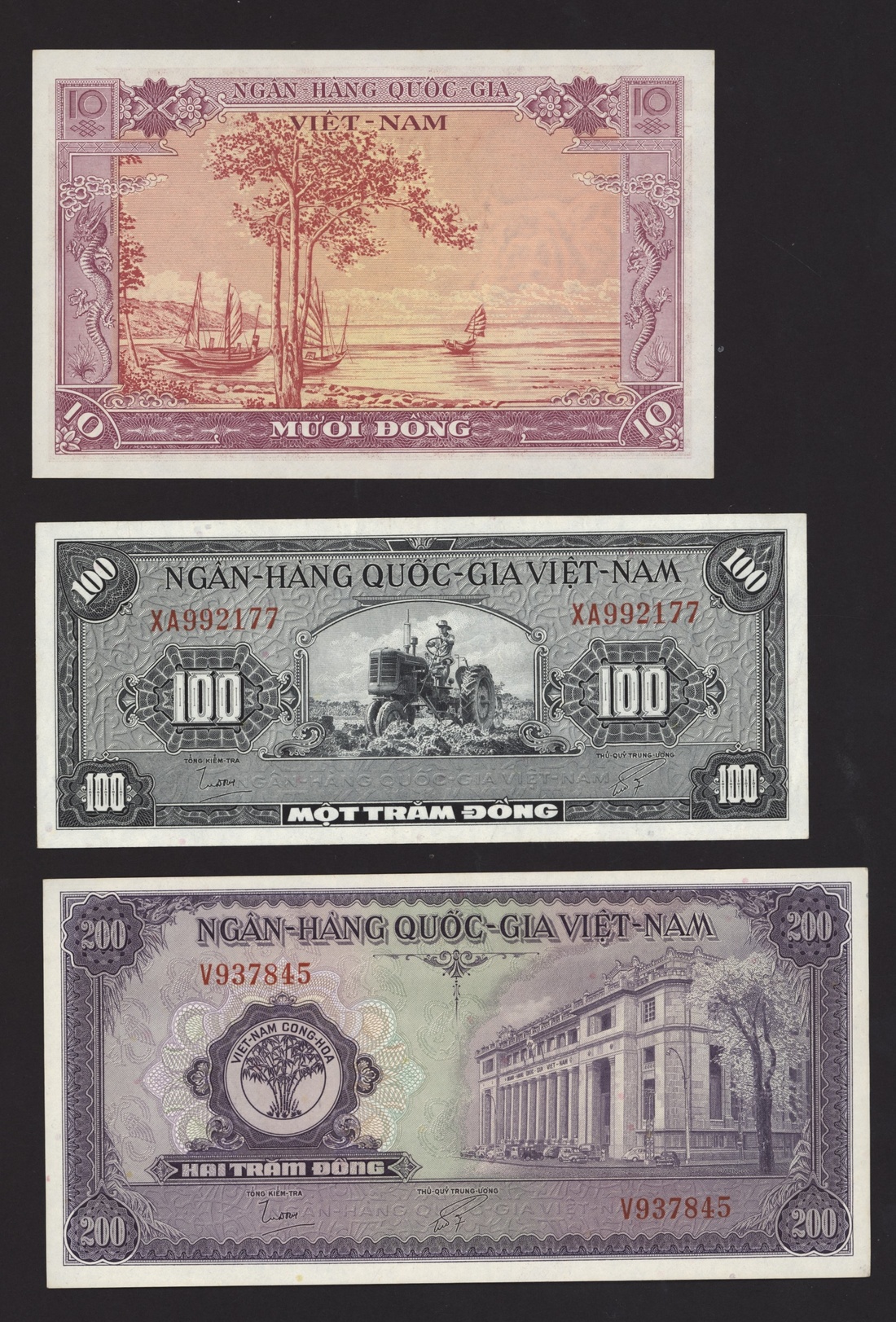 (x) South Vietnam, [9 notes] 1, 2, 5, 10, 50, 100, 200 Dong, ND (1955-56), (Pick 11a, 12a, 13a, 1a, 2a, 3a, 7a, 8a, 9a, BNB 101a, 102a, 103a, 110a, 104b, 105b, 112a, 106a, 117a), good very fine to about uncirculated (9 notes)