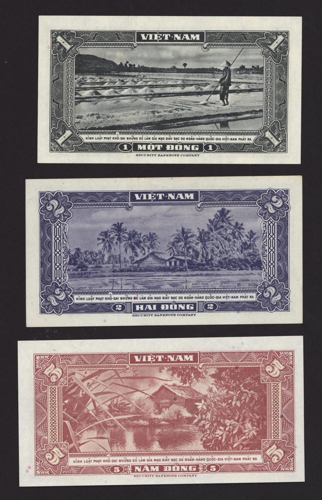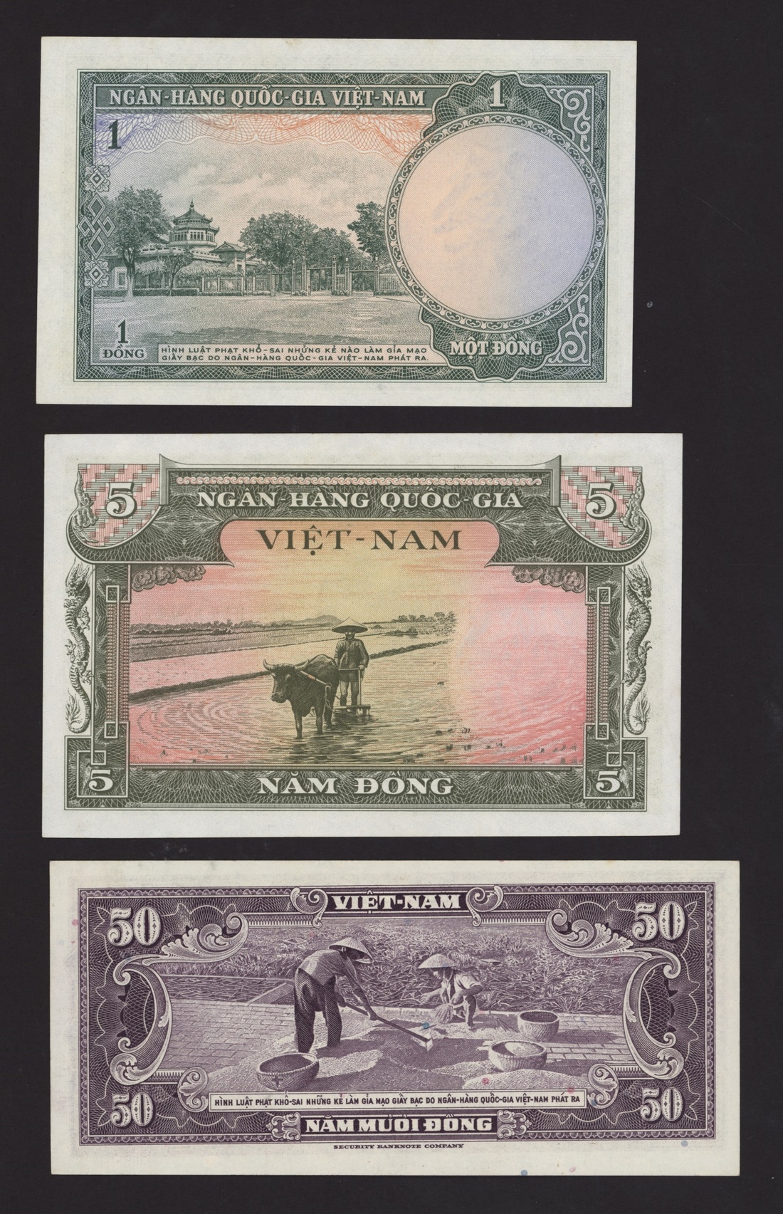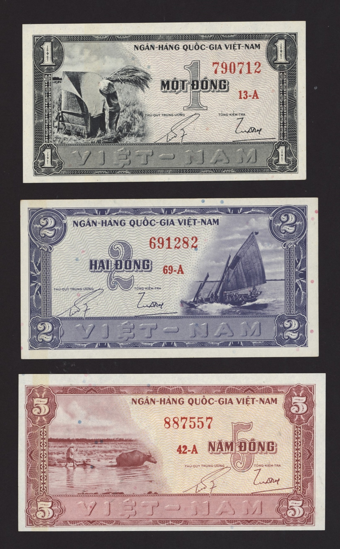 (x) South Vietnam, [9 notes] 1, 2, 5, 10, 50, 100, 200 Dong, ND (1955-56), (Pick 11a, 12a, 13a, 1a, 2a, 3a, 7a, 8a, 9a, BNB 101a, 102a, 103a, 110a, 104b, 105b, 112a, 106a, 117a), good very fine to about uncirculated (9 notes)