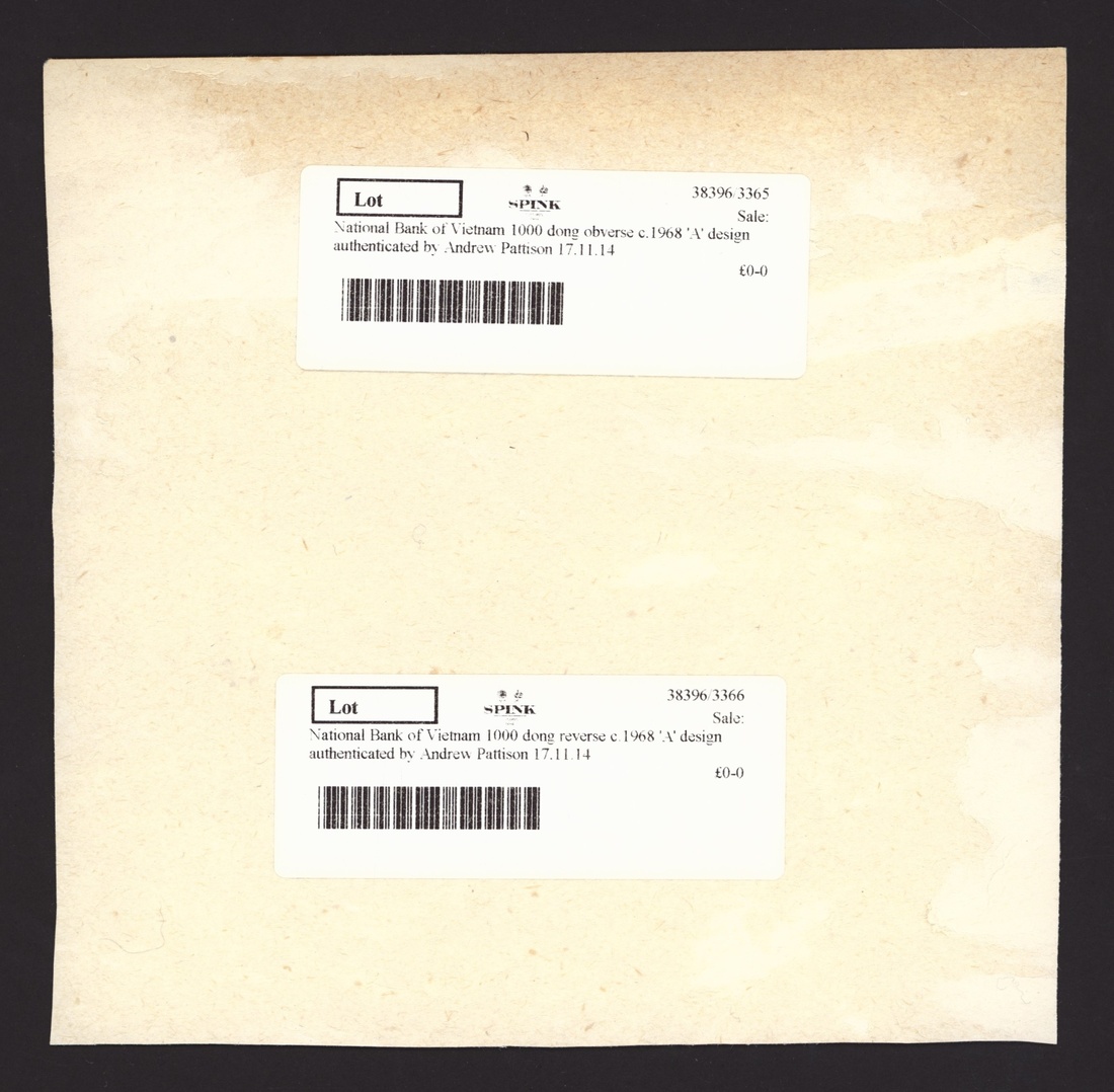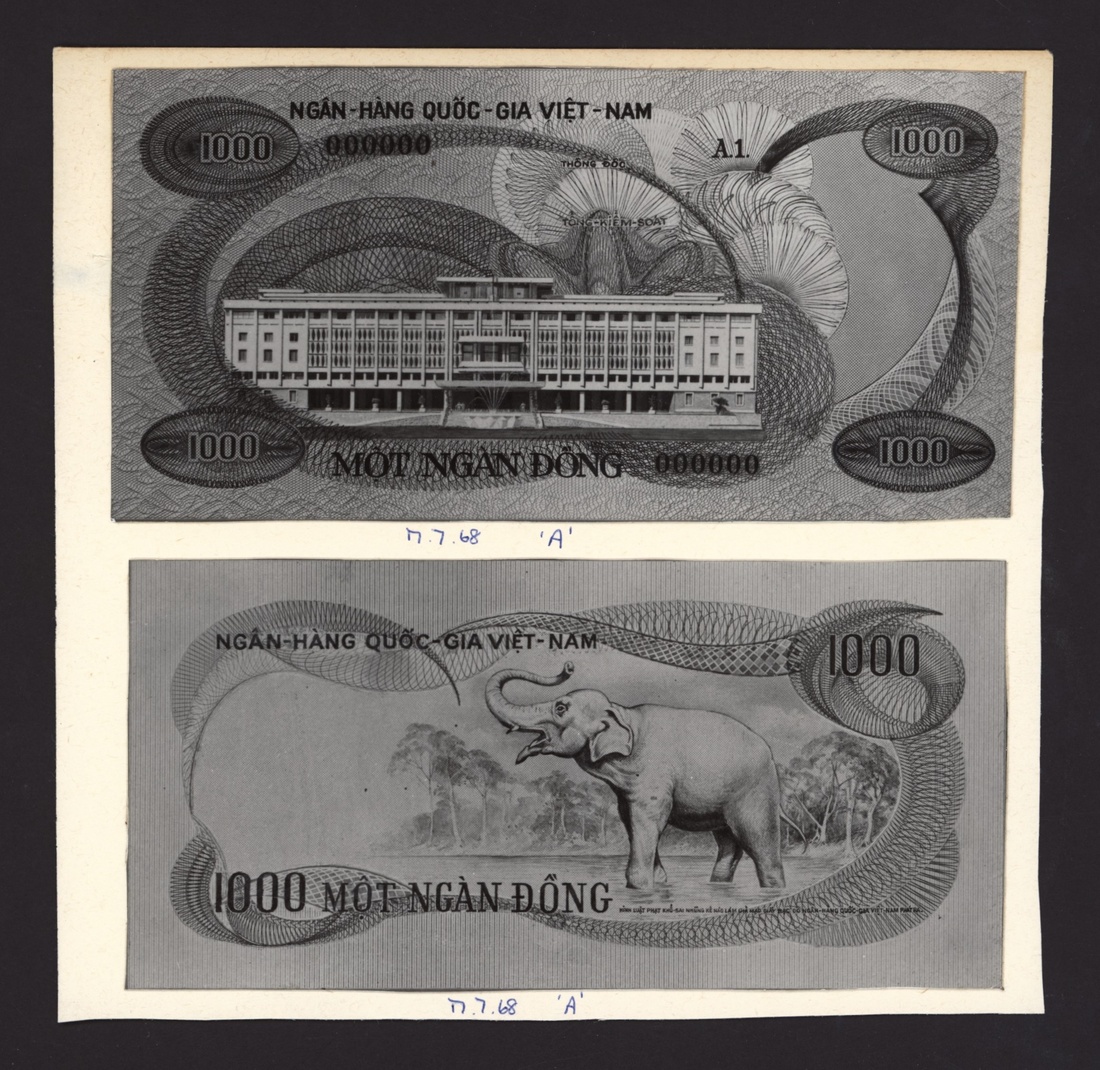 (x) National Bank of Vietnam, South Vietnam, [2 notes] obverse and reverse photo proof 1000 Dong, 17th July 1968, unadopted design
