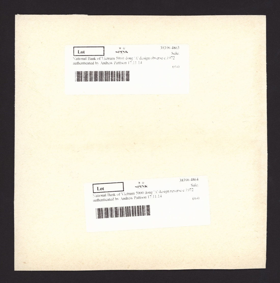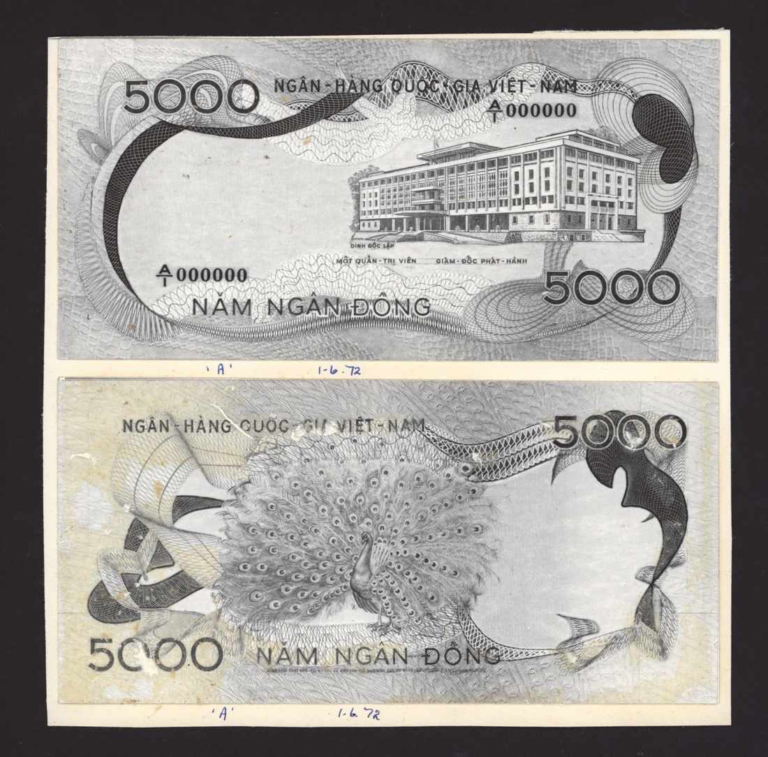(x) National Bank of Vietnam, South Vietnam, [2 notes] obverse and reverse photo proof 5000 Dong, 1st June 1972, unadopted design