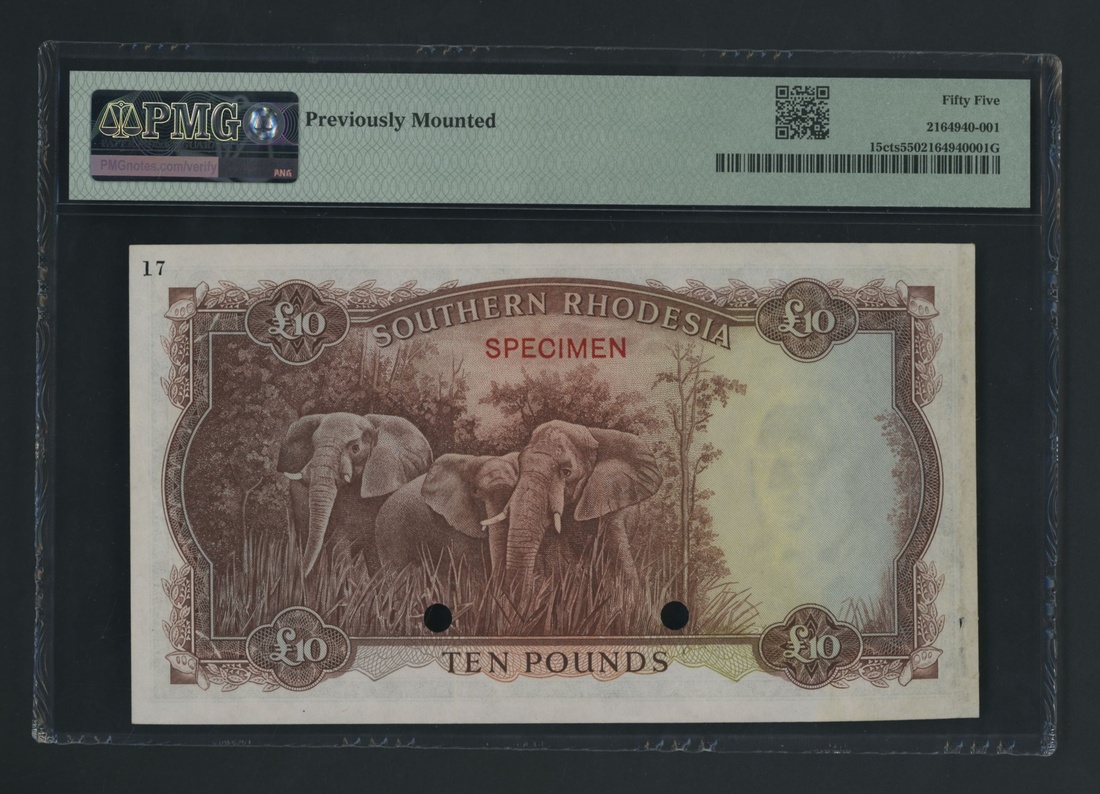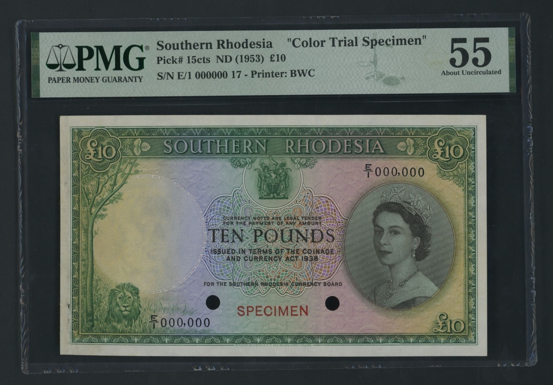 (x) Southern Rhodesia, colour trial specimen £10, ND (1953), serial number E/1 000,000, (Pick 15cts, BNB 110cts), in PMG holder 55 About Uncirculated, previously mounted, rare