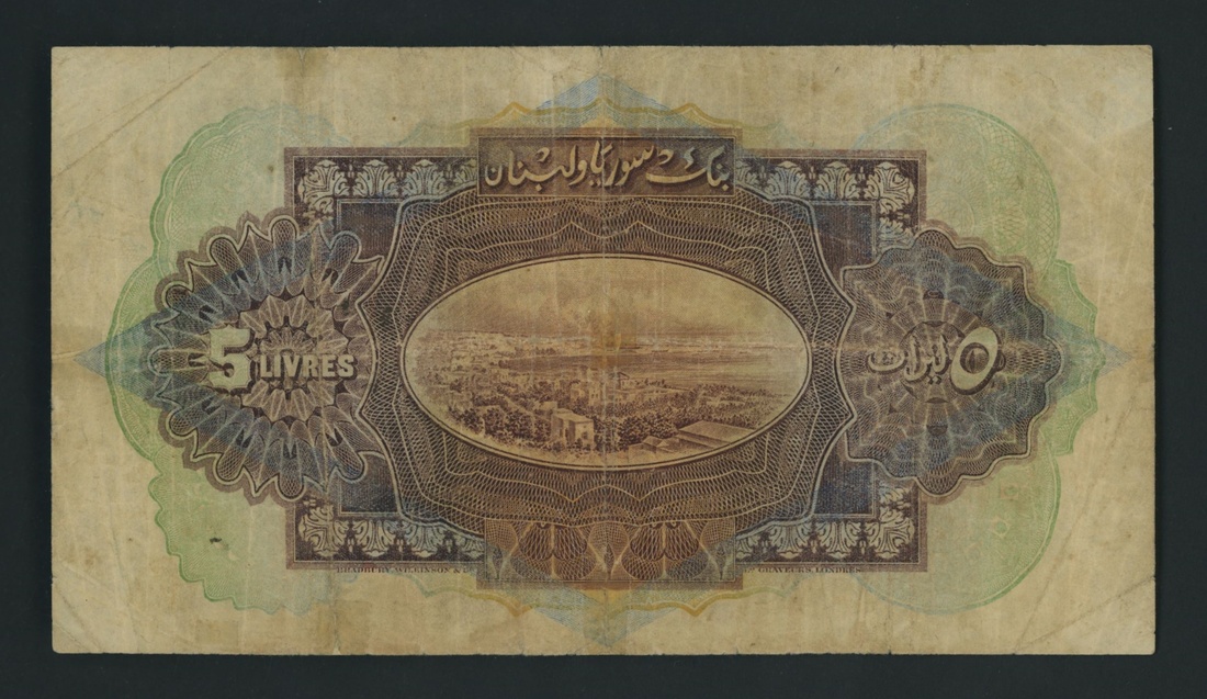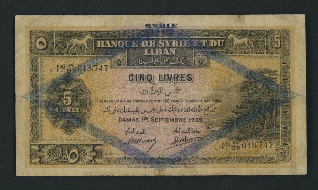 (x) Banque de Syrie et du Liban, 5 Livres, Damascus, 1 September 1939, serial number K/BX 018747, (Pick 41e, BNB 302e), about fine