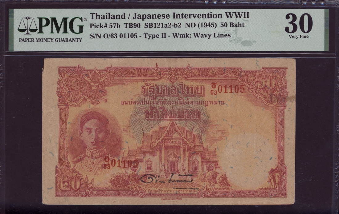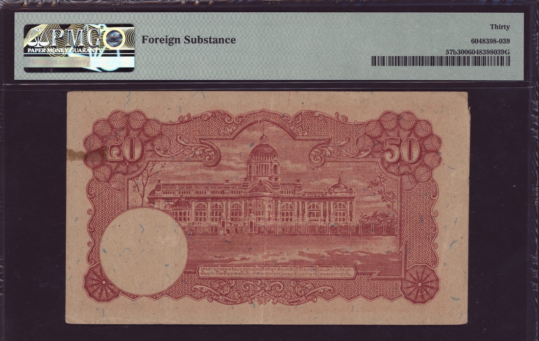 (x) Government of Thailand, 50 Baht, ND (1945), serial number O/63 01105, (Pick 57b), in PMG holder 30 Very Fine, foreign substance