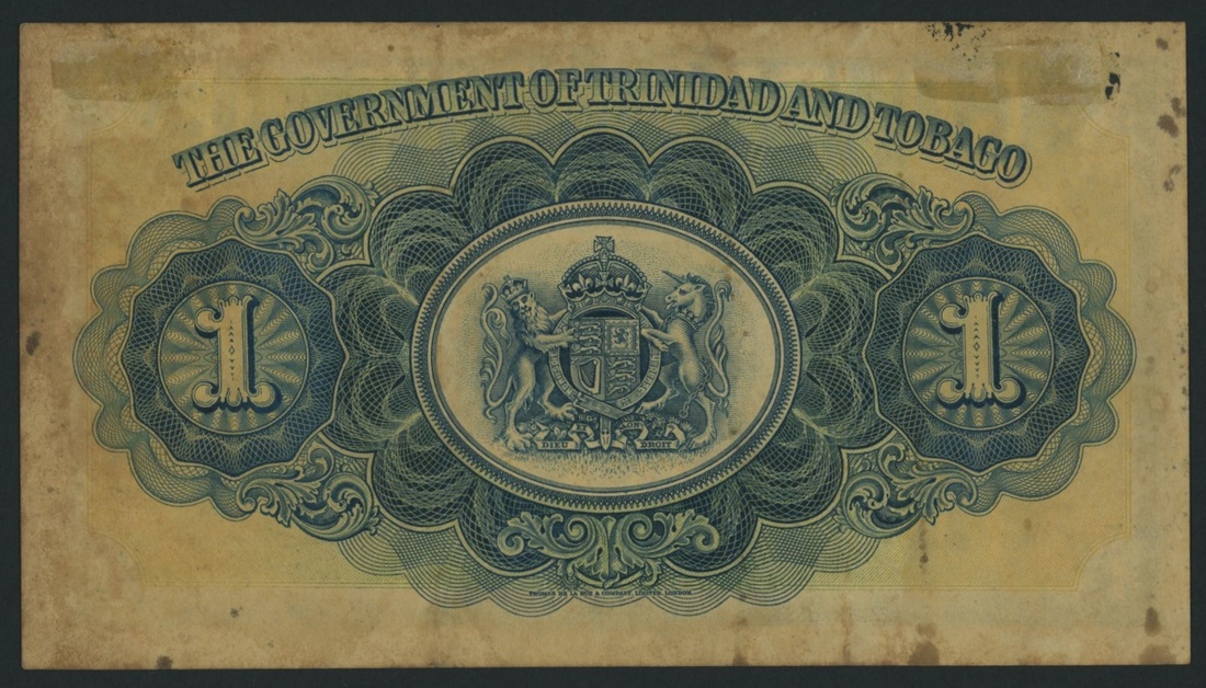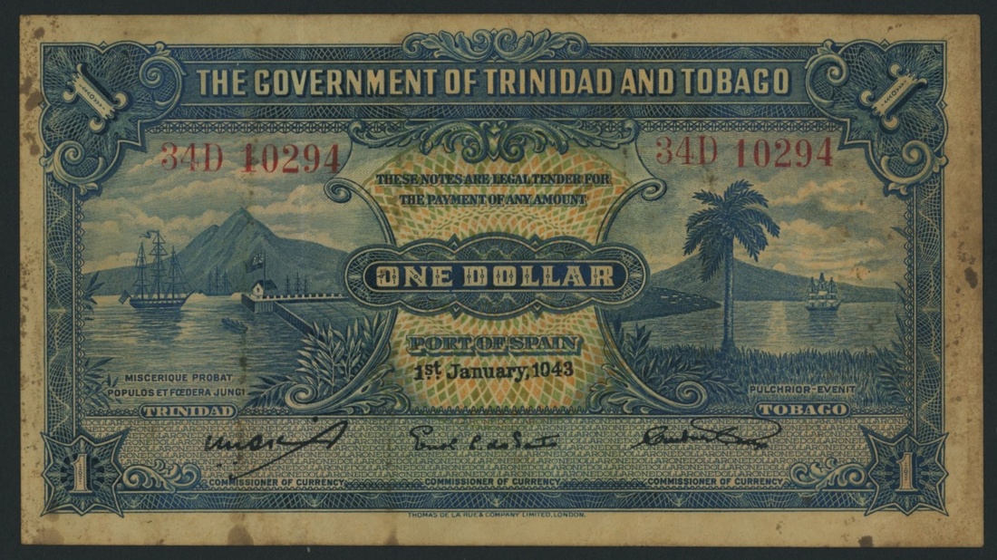 Government of Trinidad and Tobago, $1, Port of Spain, 1st January 1943, serial number 34D 10294, slight printing error so it appears '1043'