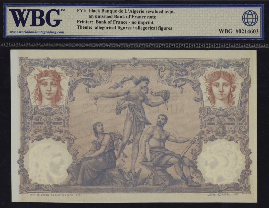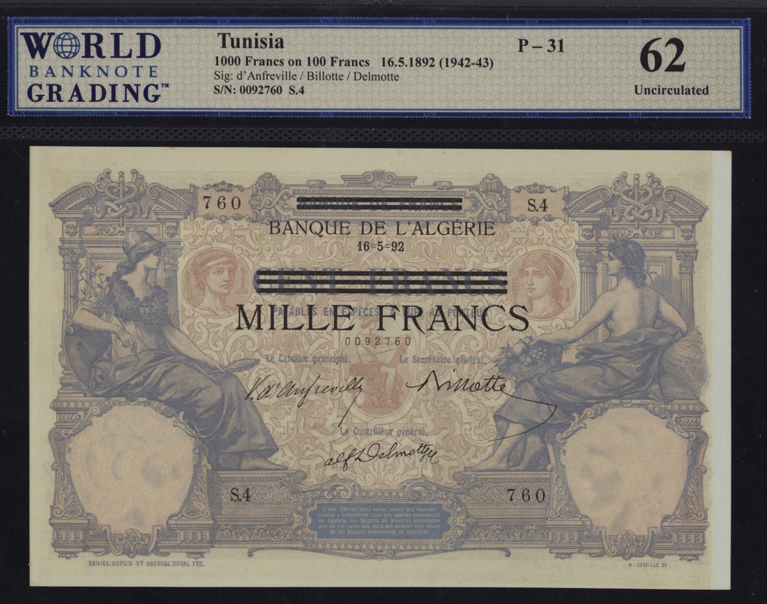 (x) Tunisia, 1000 Francs on 100 Francs, 16th May 1892 (1942-43), serial number S.4 760, (Pick 31, BNB 221), in WBG holder 62 Uncirculated