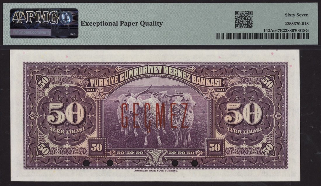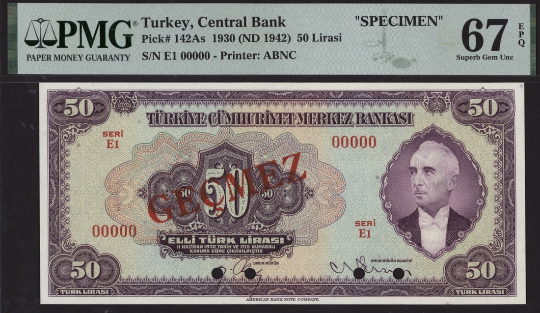 (x) Pair of Turkey Specimens, Central Bank, [2 notes] specimen 10, 50 Lirasi, 1930 (ND 1942-1948),