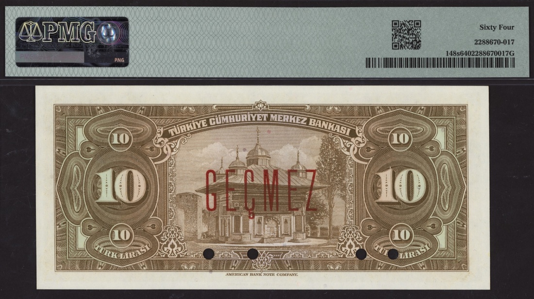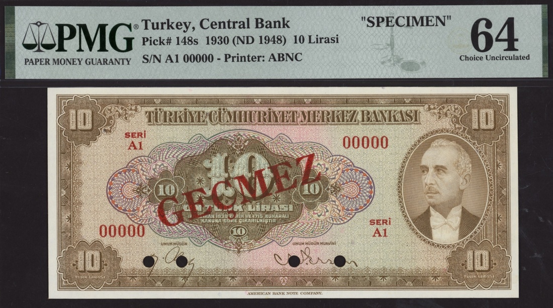specimen 10 Lirasi, 1930 (ND 1948), serial number A1 00000;