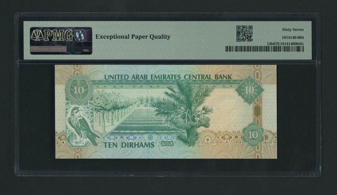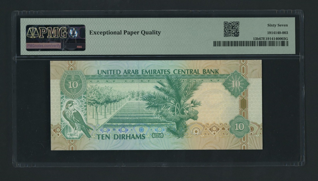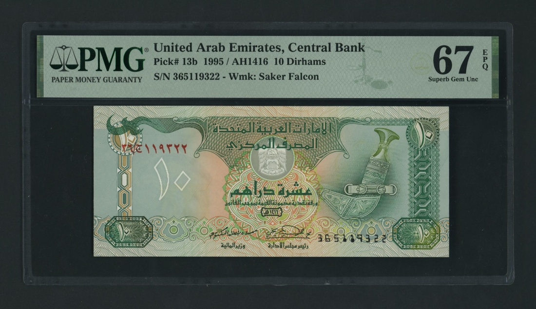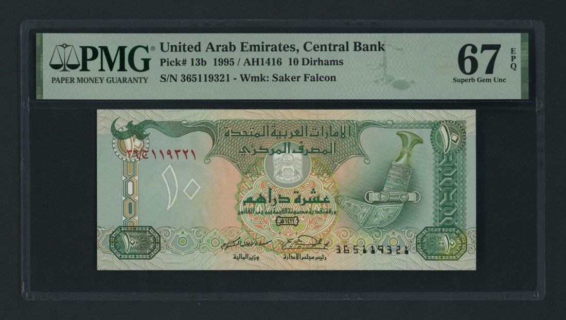 (x) United Arab Emirates Central Bank, [2 notes] 10 Durhams, 1995, consecutive serial numbers 365119321-2, (Pick 13b, BNB 208b), both in PMG holder 67 Superb Gem Uncirculated (2 notes)