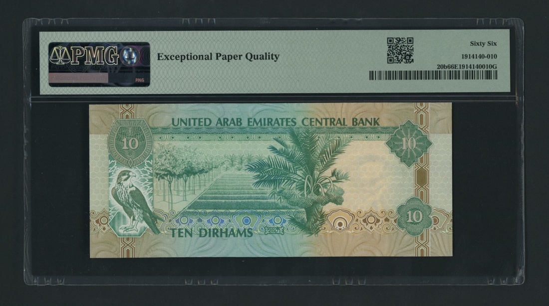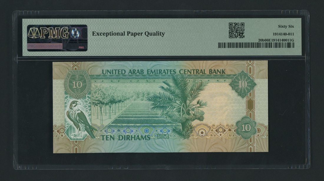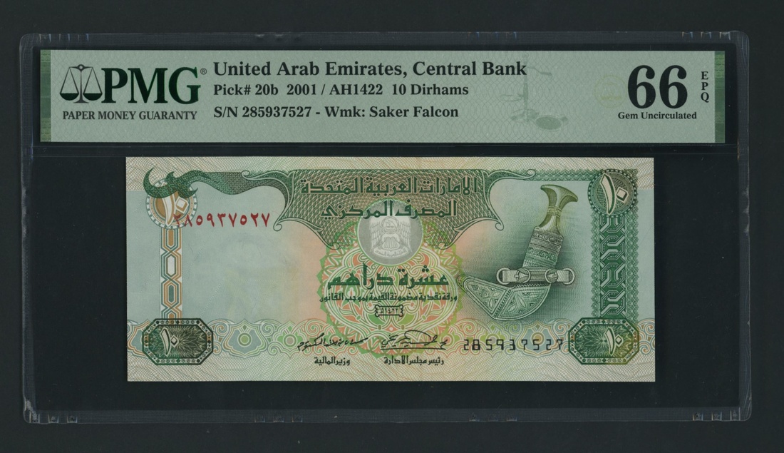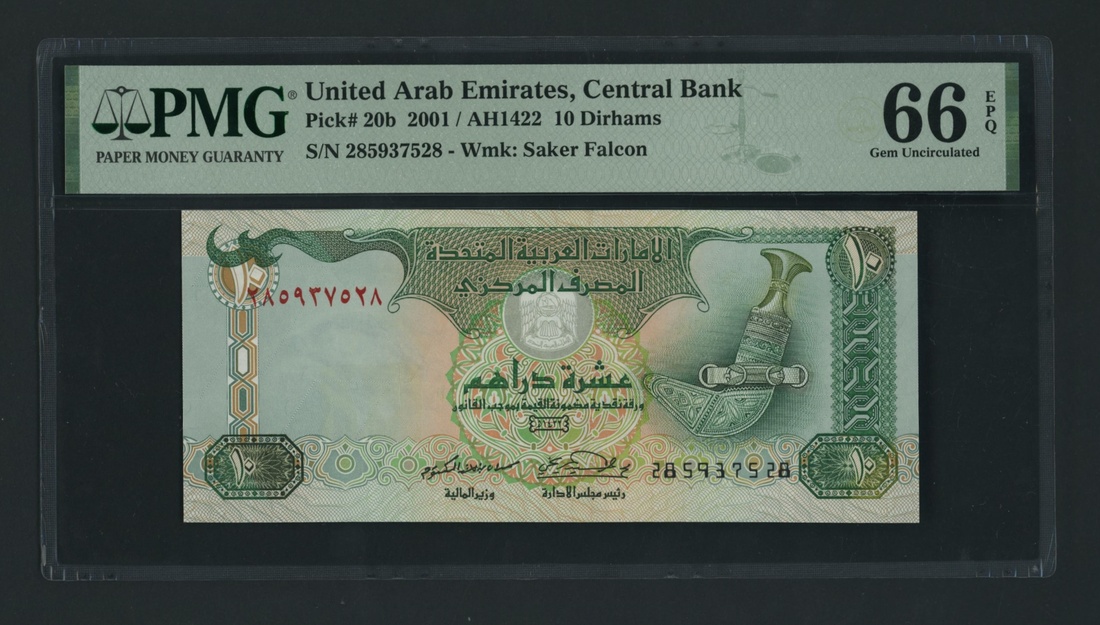 (x) United Arab Emirates Central Bank, [2 notes] 10 Dirhams, 2001, consecutive serial numbers 285937527-8, (Pick 20b, BNB 215b), both in PMG holder 66 EPQ Gem Uncirculated (2 notes)