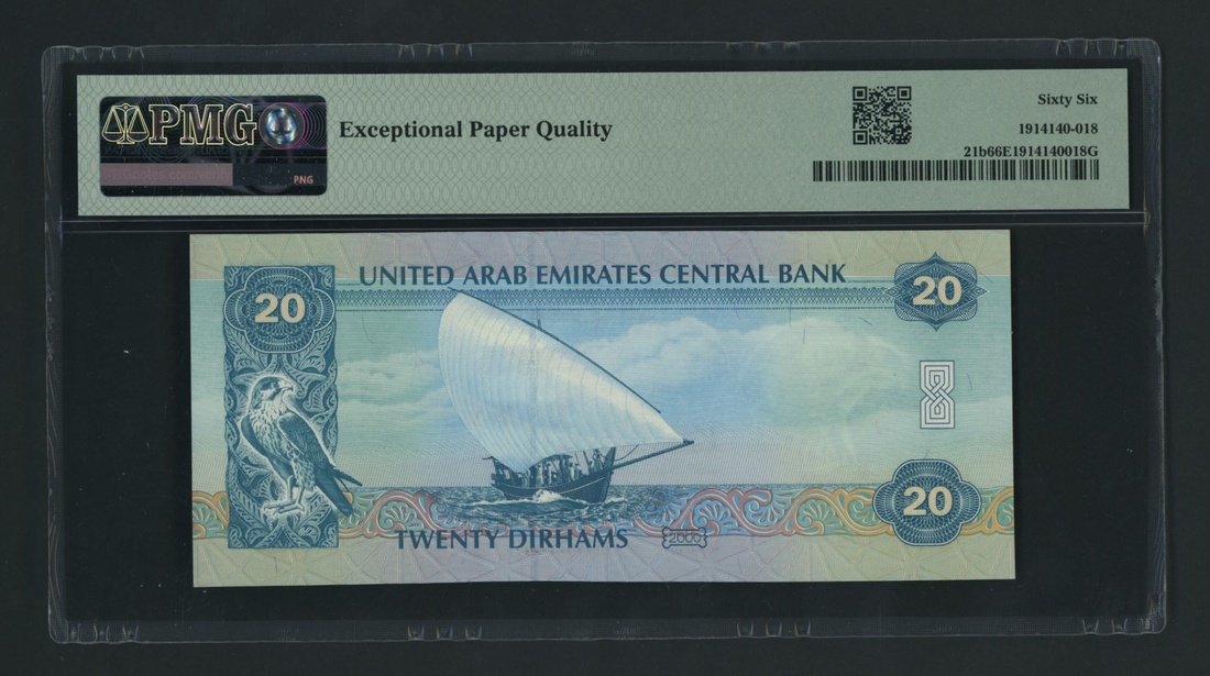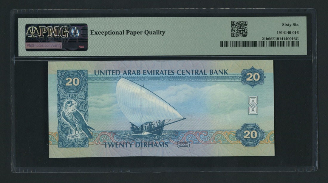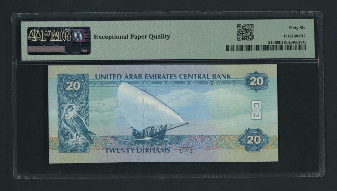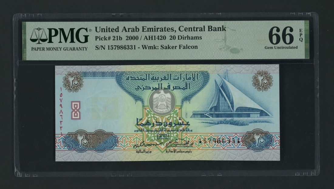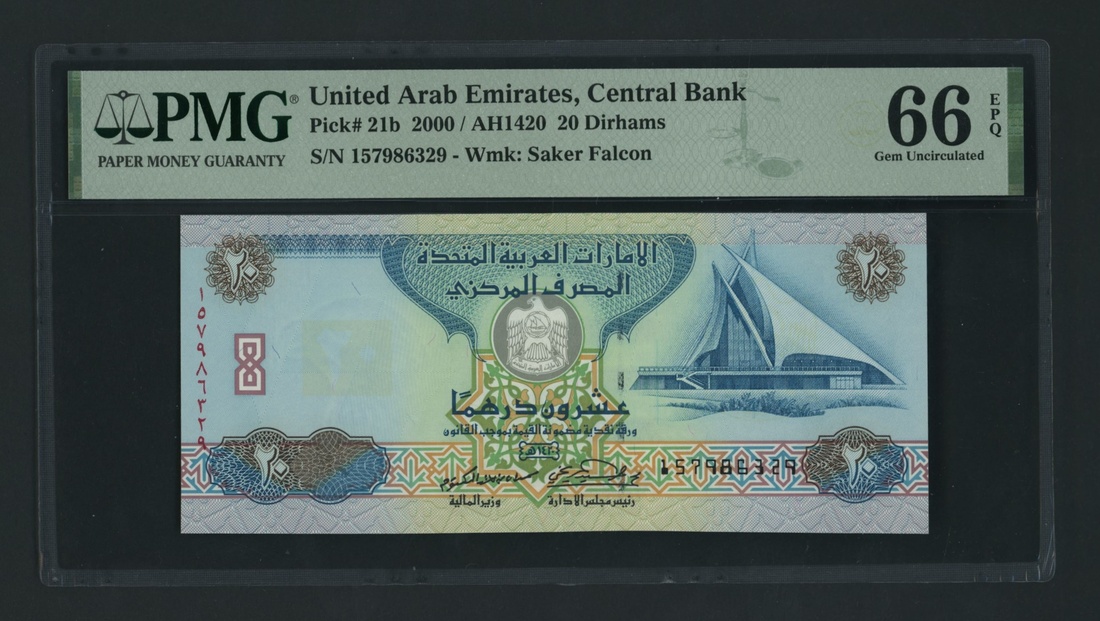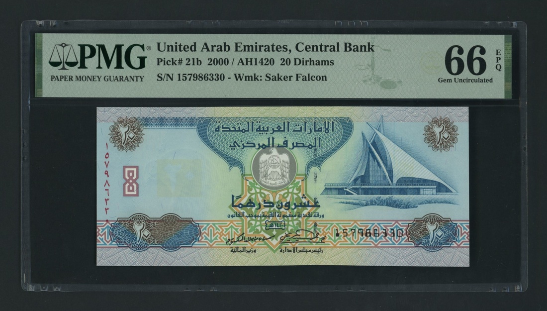 (x) United Arab Emirates Central Bank, [3 notes] 20 Dirhams, 2000, consecutive serial numbers 157986329-31 (Pick 21b, BNB 216b), all in PMG holder 66 EPQ Gem Uncirculated (3 notes)