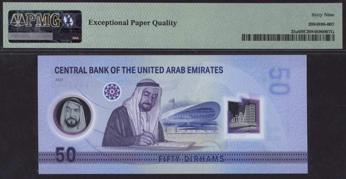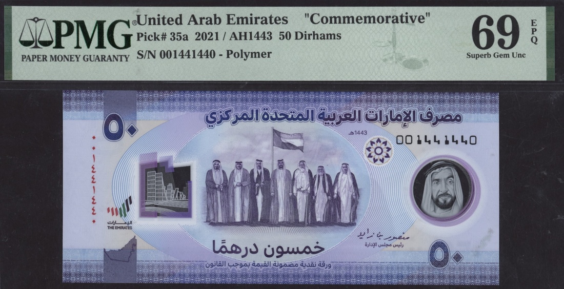 (x) United Arab Emirates Central Bank, 50 Dirhams, 2021, serial number 001441440, "Commemorative"