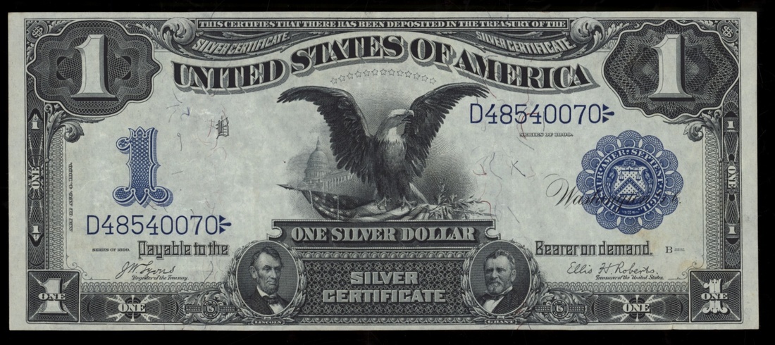 United States of America, 1 silver Dollar, 1899, serial number D48540070, featuring the signatures of Lyons and Roberts, and sporting a blue seal