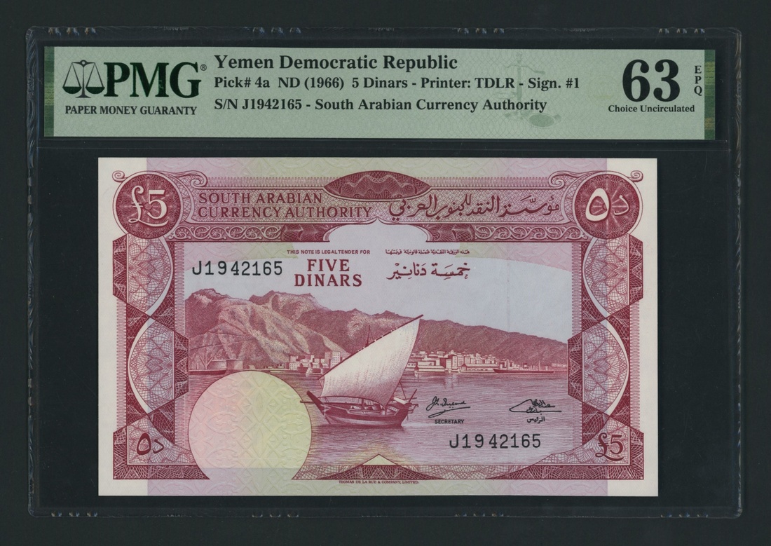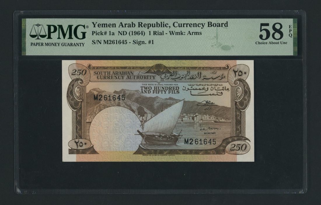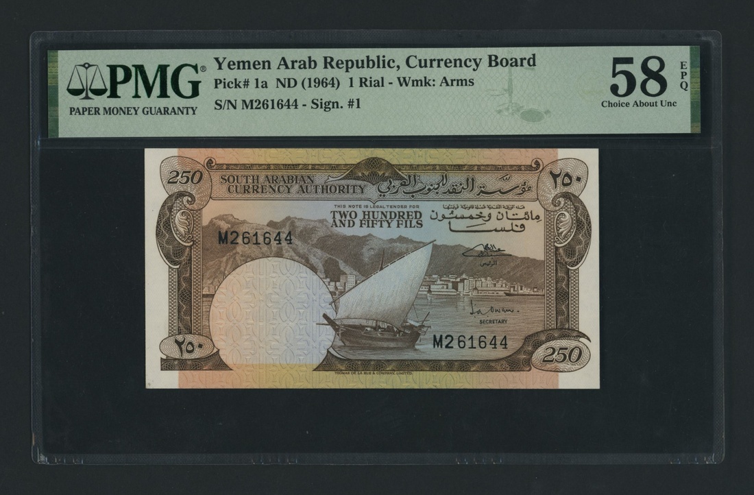 (x) South Arabian Currency Board (Yemen Democratic Republic), [3 notes] 250 Fils, 5 Dinars, 1964-66, 250 Fils (x2), ND (1964), serial numbers M261644-5;