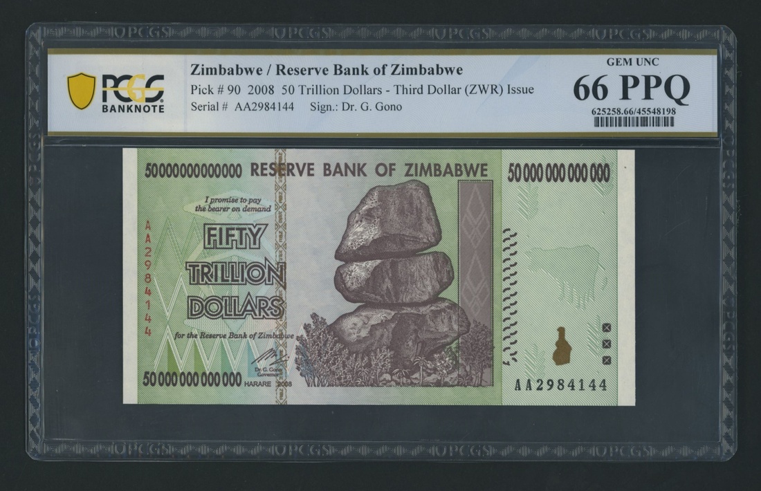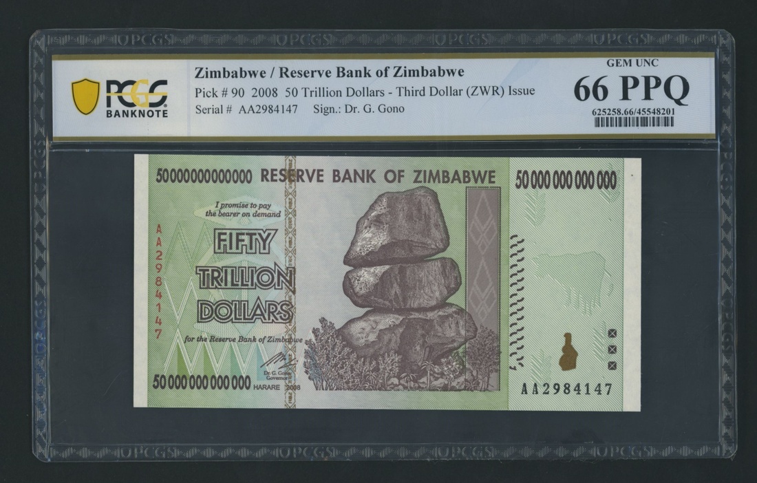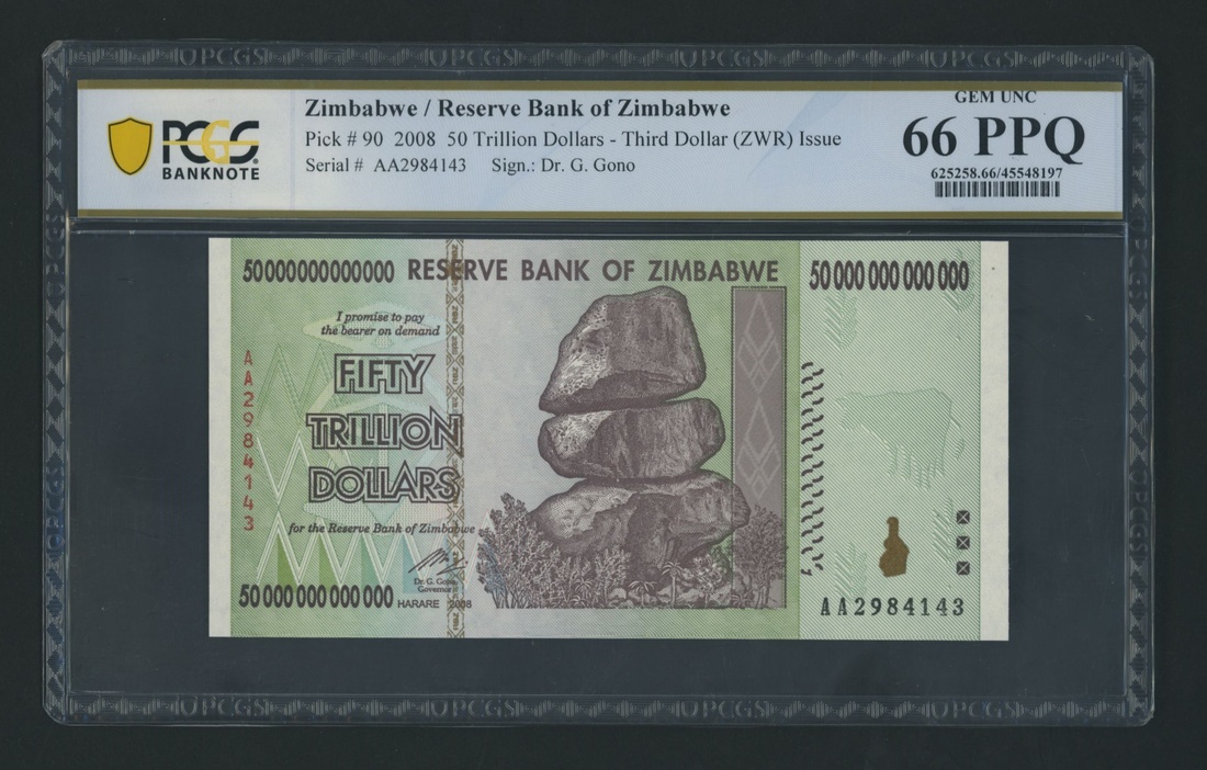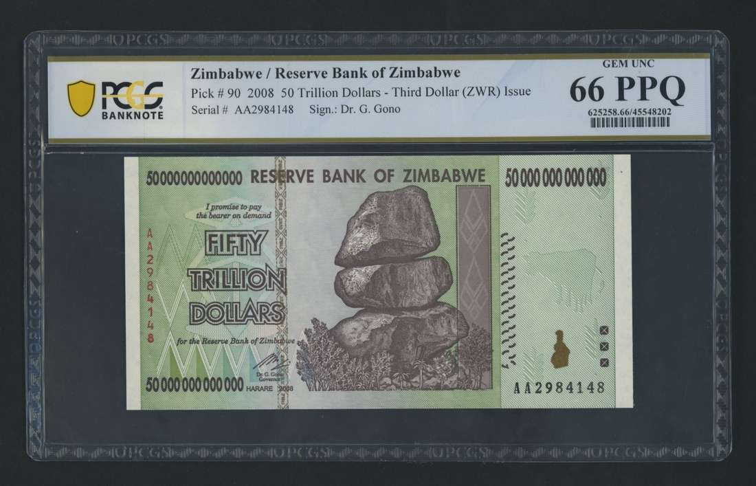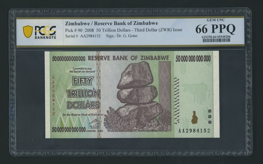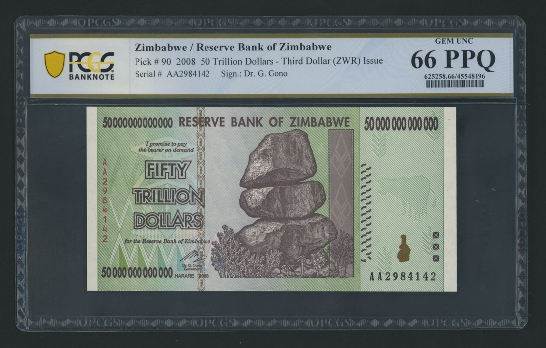 (x) Reserve Bank of Zimbabwe, [10 notes] 50,000,000,000,000, (2008), Prefix AA, mostly consecutive, (Pick 90, BNB 181), in PCGS holders 66 PPQ Gem Uncirculated (10 notes)
