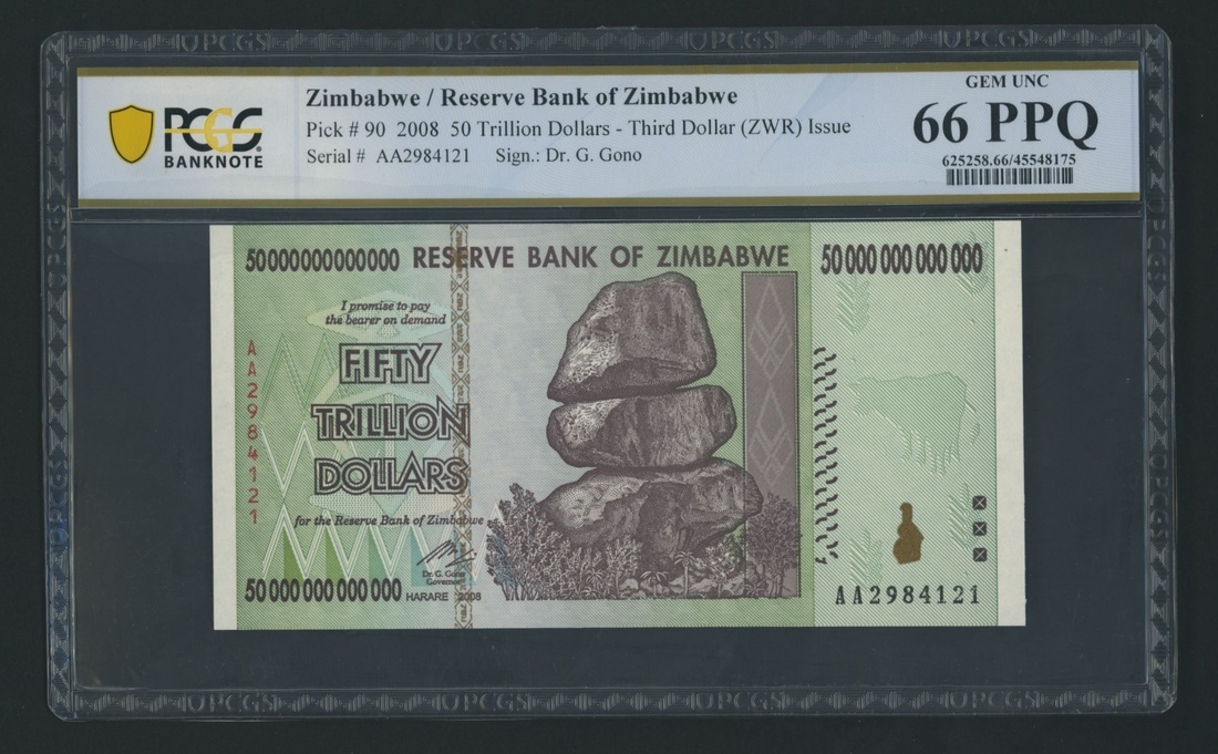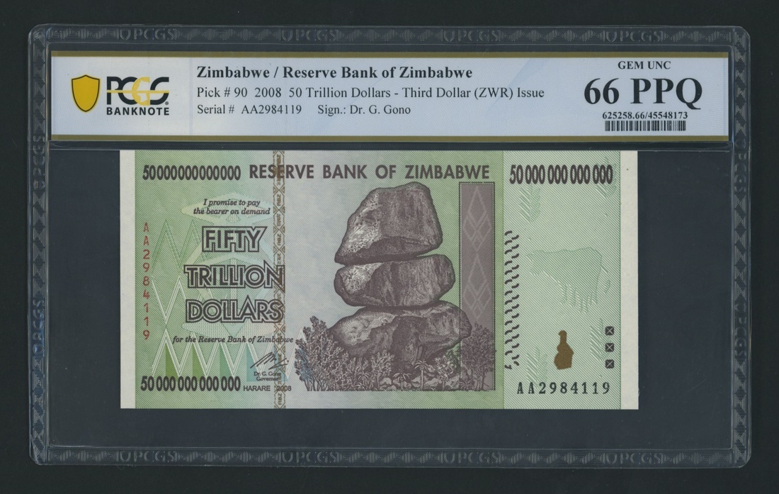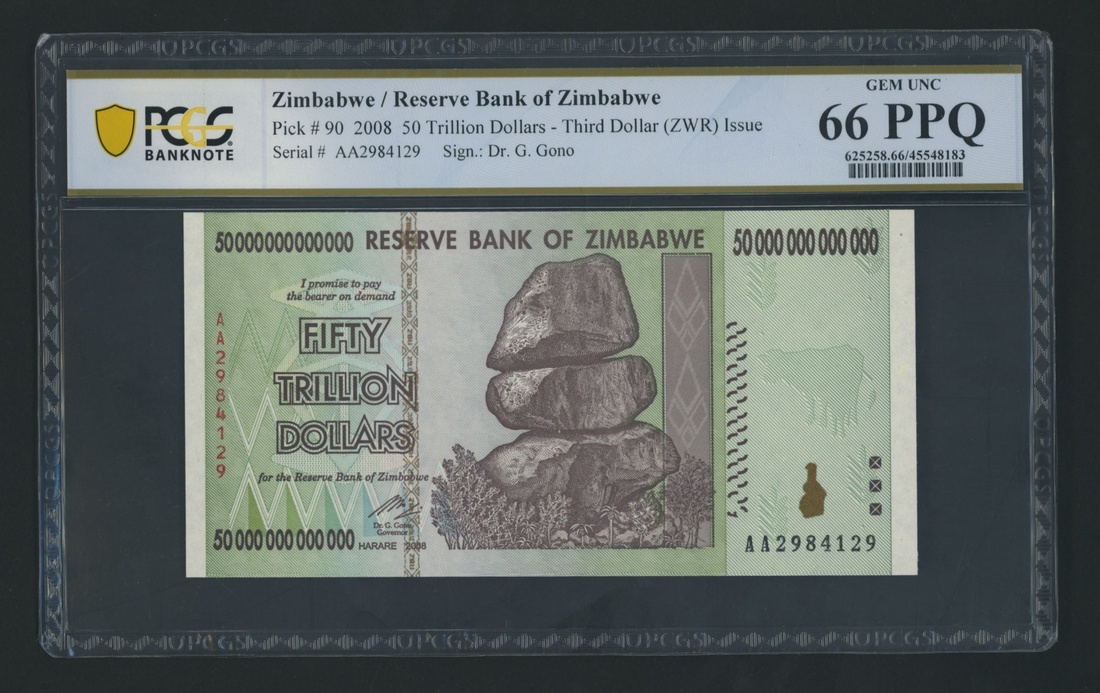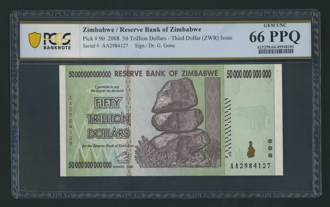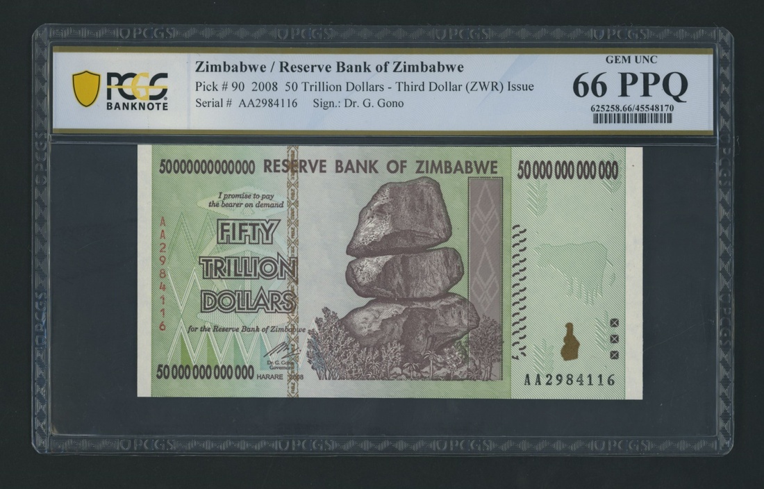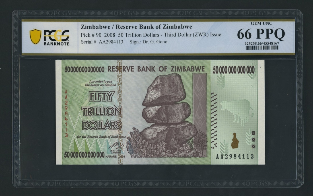 (x) Reserve Bank of Zimbabwe, [10 notes] 50,000,000,000,000, (2008), Prefix AA, mostly consecutive, (Pick 90, BNB 181), in PCGS holders 66 PPQ Gem Uncirculated (10 notes)
