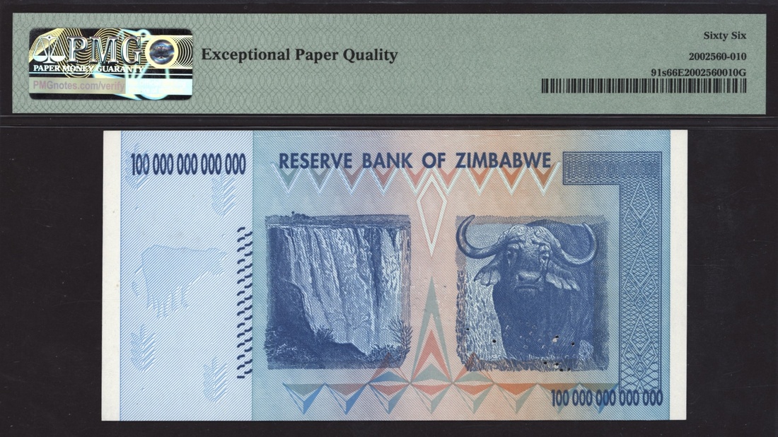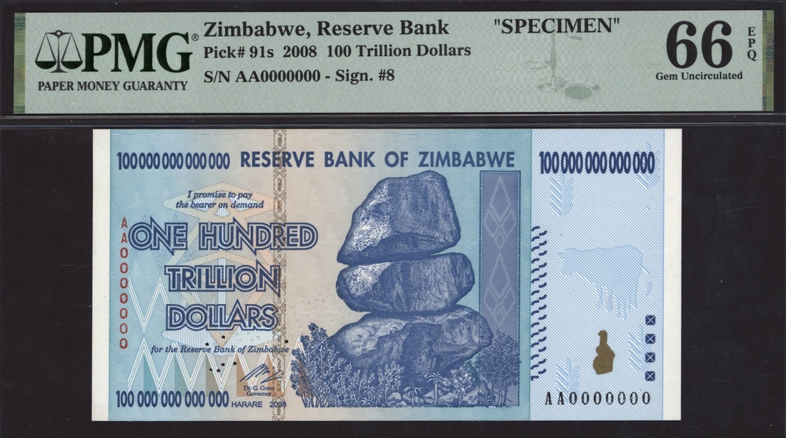 (x) Reserve Bank of Zimbabwe, [Top Pop] specimen 100,000,000,000,000, (2008), serial number AA 0000000, (Pick 91s), in PMG holder 66 EPQ Gem Uncirculated, only 2 notes on PMG Census, extremely rare