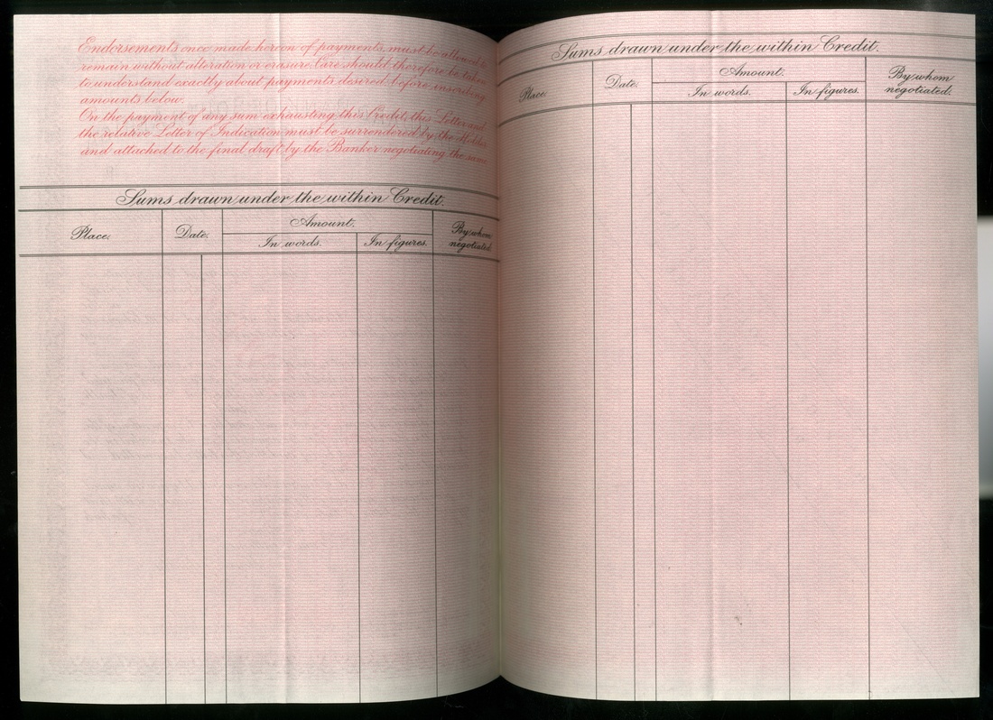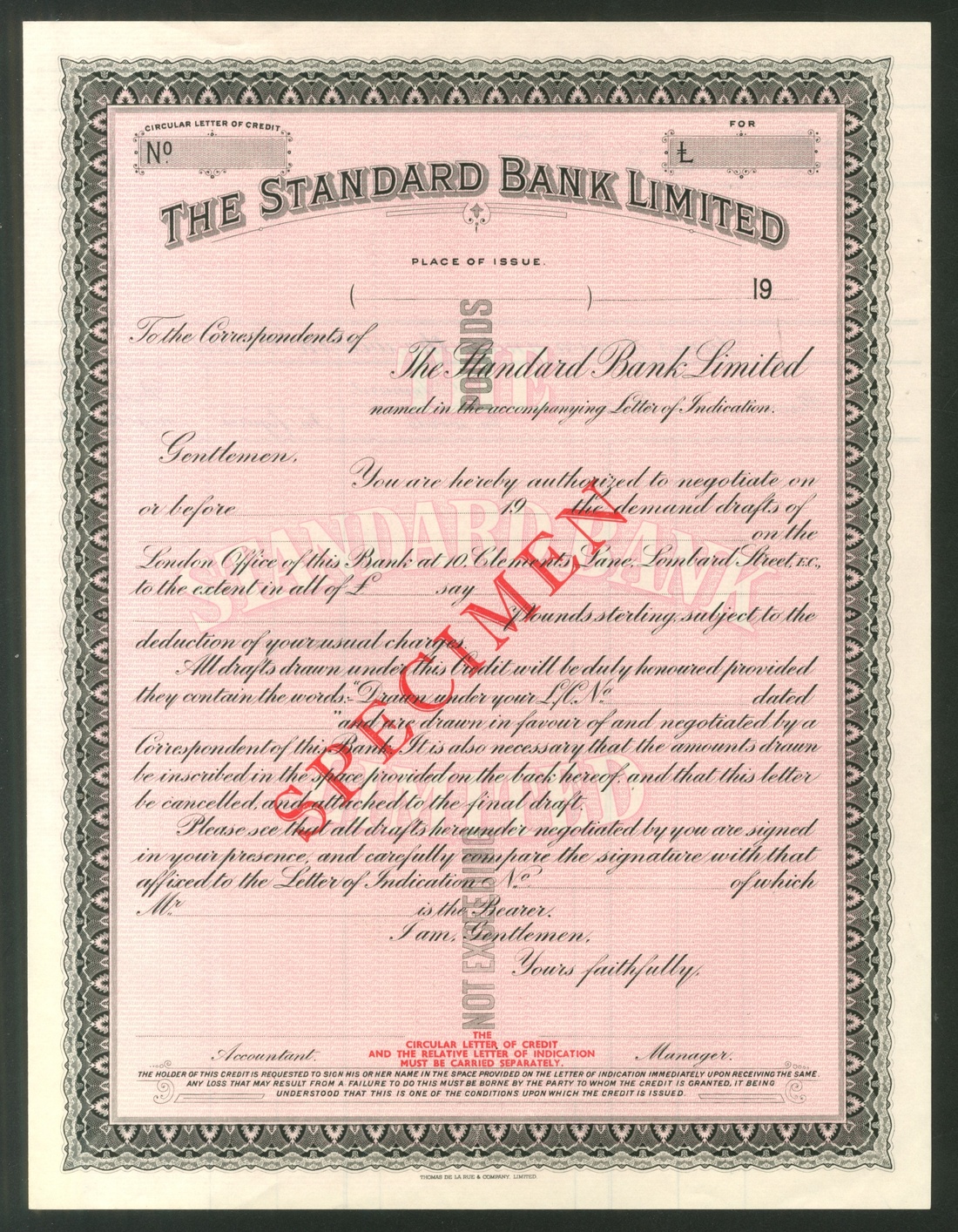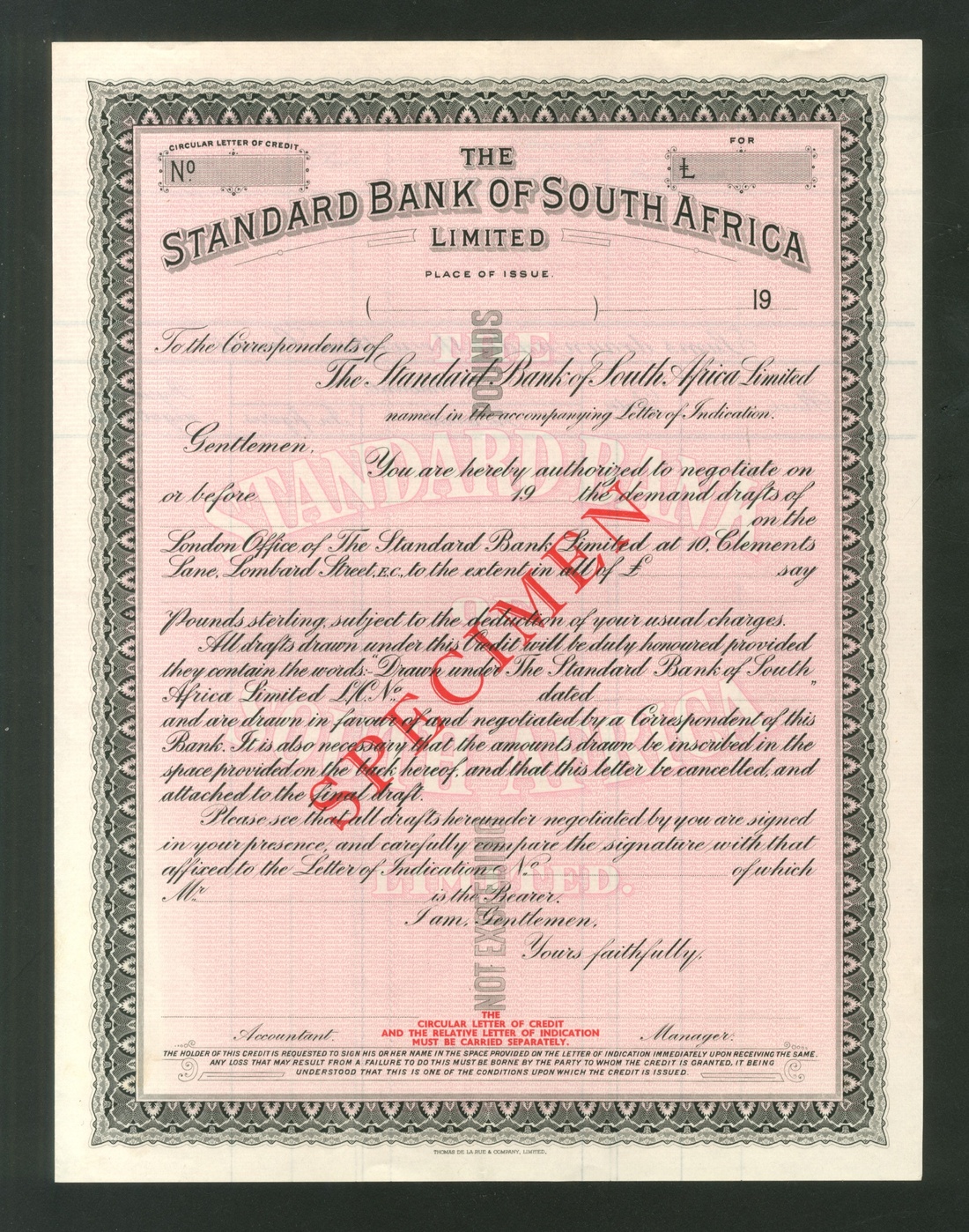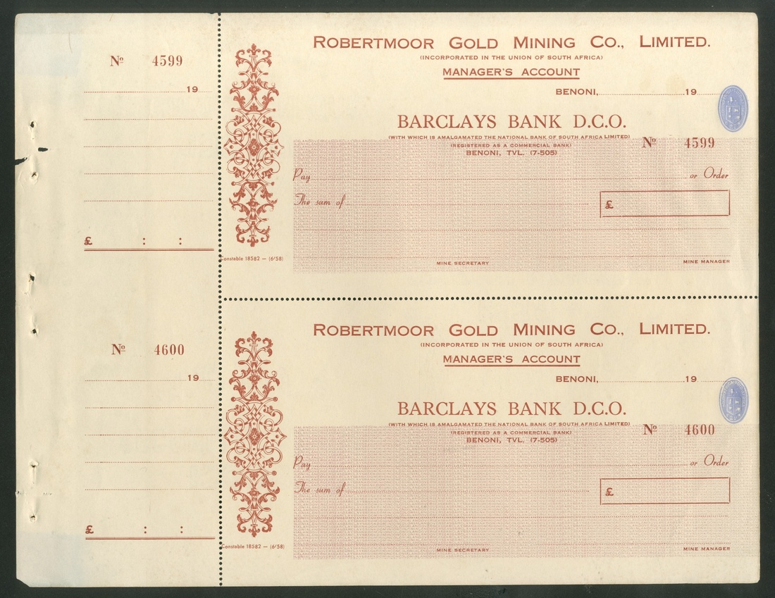 Cheques, [3 items] 19--, Standard Bank Ltd. circular letter of credit, one from South Africa (2) and one uncut sheet of two Barclays Robertmoor Gold Mining Co. Ltd. cheques