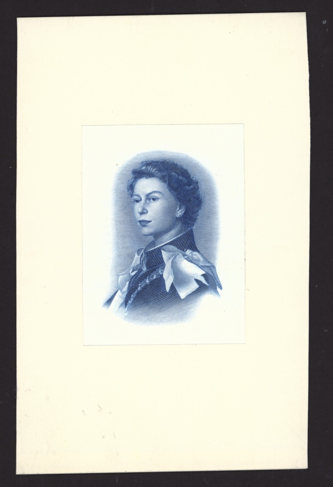 (x) Great Britain, Elizabeth II, die proof vignette portrait of Queen Elizabeth II, similar to the portrait used on British overseas territories notes in the 1960s and early 1970s, blue print